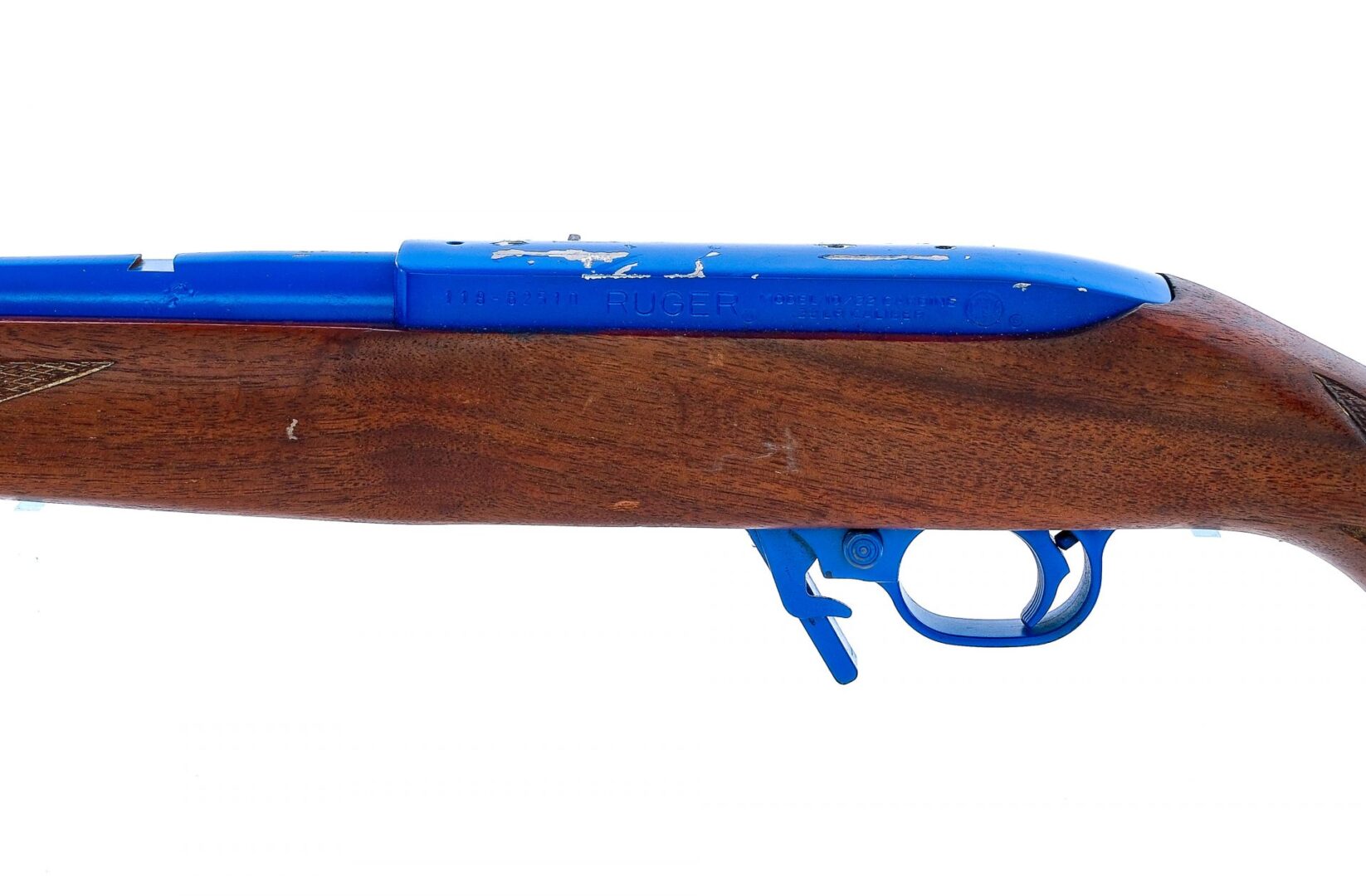Description Ruger 10/22 Carbine in .22 Long Rifle missing its removable magazine with a 18.5″ barrel. Serrated composite butt plate. Checkered wood stock and front forend. Aftermarket blue finished trigger guard, serrated trigger, receiver and barrel. Trigger guard located push button safety and magazine release lever. Fixed sights have been removed. Metal loops for mounting a shoulder sling. Top of receiver is drilled and tapped for optics. Must ship to a FFL holder. Condition: Fair with scratches, finish wear/loss, refinished and missing sights and removable magazine. Clean rifled bore. Sold AS-IS. Barrel Length: 18.5″ Serial: 118-62510 Manufacturer: Ruger Caliber: .22 LR Model: 10/22 Carbine Book# 03589