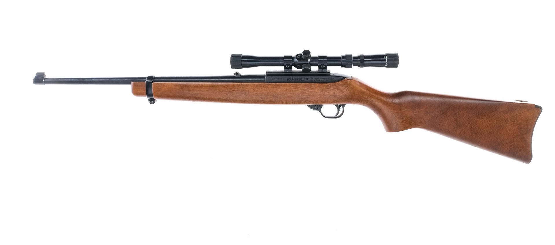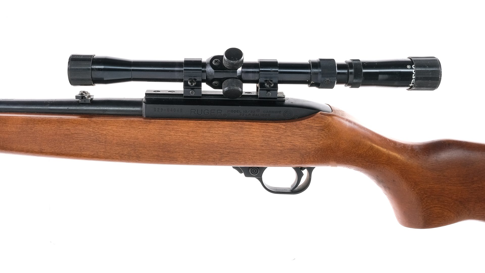 Description Ruger 10/22 Carbine in .22 Long Rifle missing its magazine with a 18.5″ barrel. Composite butt plate. Smooth wood stock and front forend. Black finished trigger guard. Blued trigger, receiver and barrel. Front trigger guard push button safety and magazine release. Right side of receiver charging handle. Rear flip up adjustable and front fixed blade sight. Mounted with a Tasco Coated 3-7×20 scope with clear glass and a duplex reticle. Must ship to a FFL holder. Condition: Good/Very Good, missing magazine, shows touches of rust, wood dings and handling wear. Clean rifled bore. Barrel Length: 18.5″ Serial: 129-04048 Manufacturer: Ruger Year: 1988 Caliber: .22 LR Model: 10/22 Carbine Book# 01081