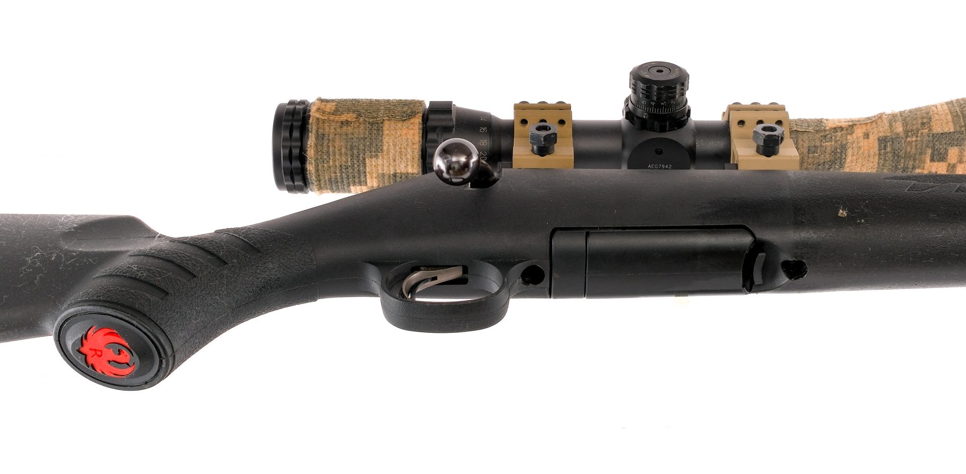 Description Ruger American chambered in .223 Remington with one, five round removable magazine and a 20″ barrel. Manufactured in 2014 with serial number 693-91370. Matte finished barrel, frame, and bolt handle. The top of the receiver is drilled and tapped with a mounted Sniper scope. Paddle magazine release, and tang mounted safety. Black polymer stock with textured forend, textured pistol grip, and rubber butt pad. Front and rear sling eyelets. Must ship to a FFL holder. Condition: Good with scratches, scuffs, and handling wear. Spots and speckling of metal oxidation throughout the rifle, mostly heavy on the barrel. Scratches and scuffs on the stock. Bright and clean bore with strong rifling. Barrel Length: 20″ Serial: 693-91370 Manufacturer: RUGER Year: 2014 Caliber: .223 Remington Model: American Book# 04759