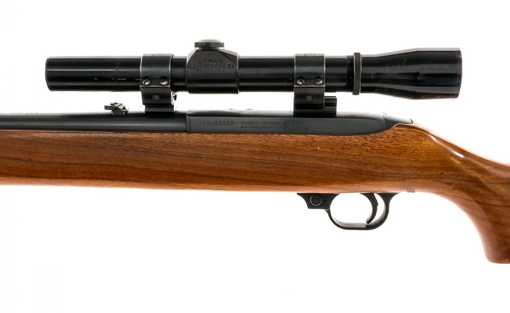 Description Ruger Carbine chambered in .44 Remington Magnum with a four round capacity and a 18.5″ barrel. Blued barrel, charging handle, loading gate, and black receiver. Cross bolt safety selector and polymer trigger. Smooth wood stock with polymer butt plate and rear sling eyelet. Flip up rear sight and fixed front blade. The receiver is drilled and tapped and mounted with a Lyman ALL-AMERICAN 3x on Weaver scope rings. Must ship to FFL or C&R holder. Condition: Good/Very Good with some scratches and wear from handling and operation. Metal oxidation on the bolt Some light scratches, scuffs, and dings on the wood. Clean rifled bore. Scopes glass is clear and intact. Barrel Length: 18.5″ Serial: 100-41769 Manufacturer: RUGER Year: 1973 Caliber: .44 Remington Magnum Model: Carbine Book# 01324