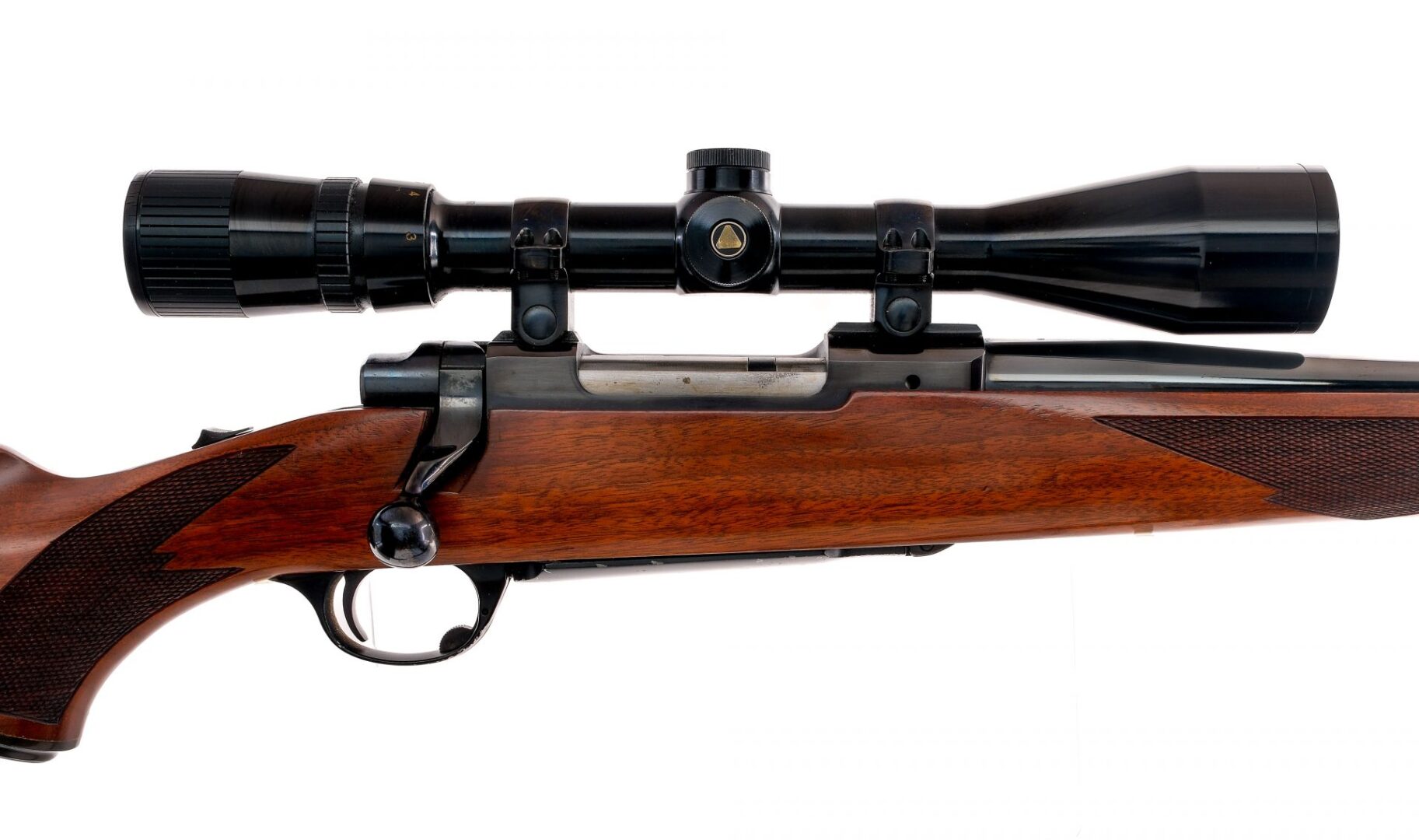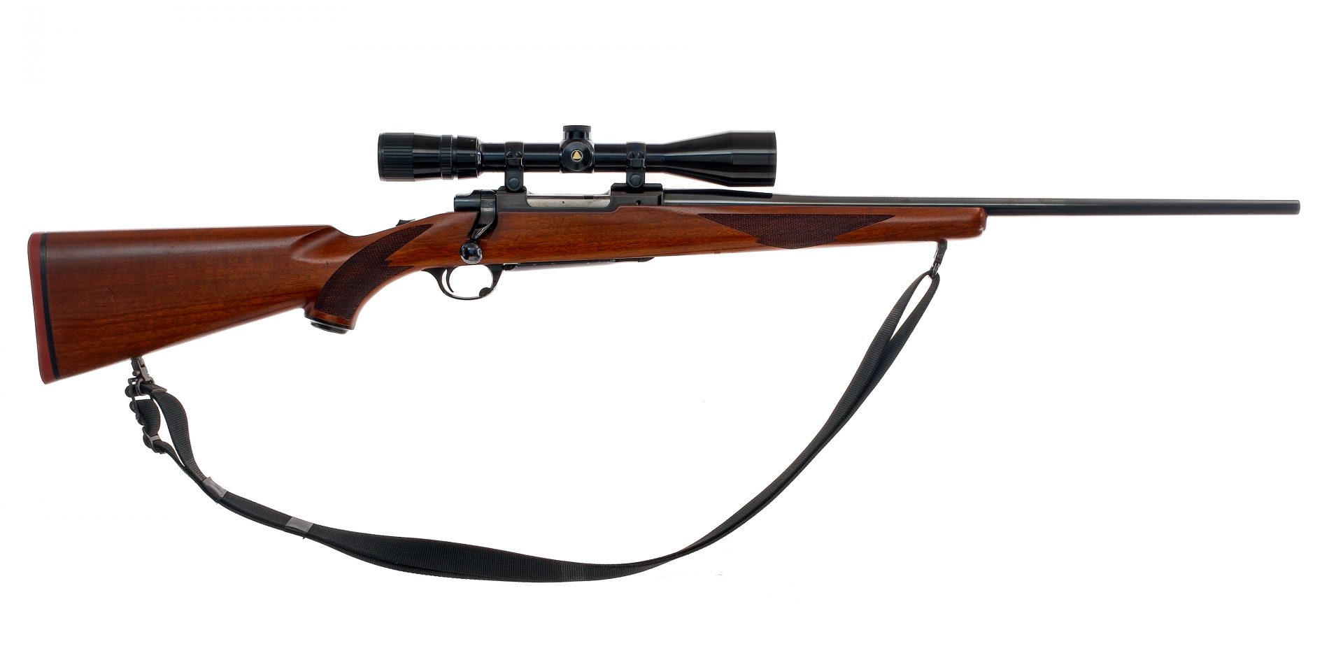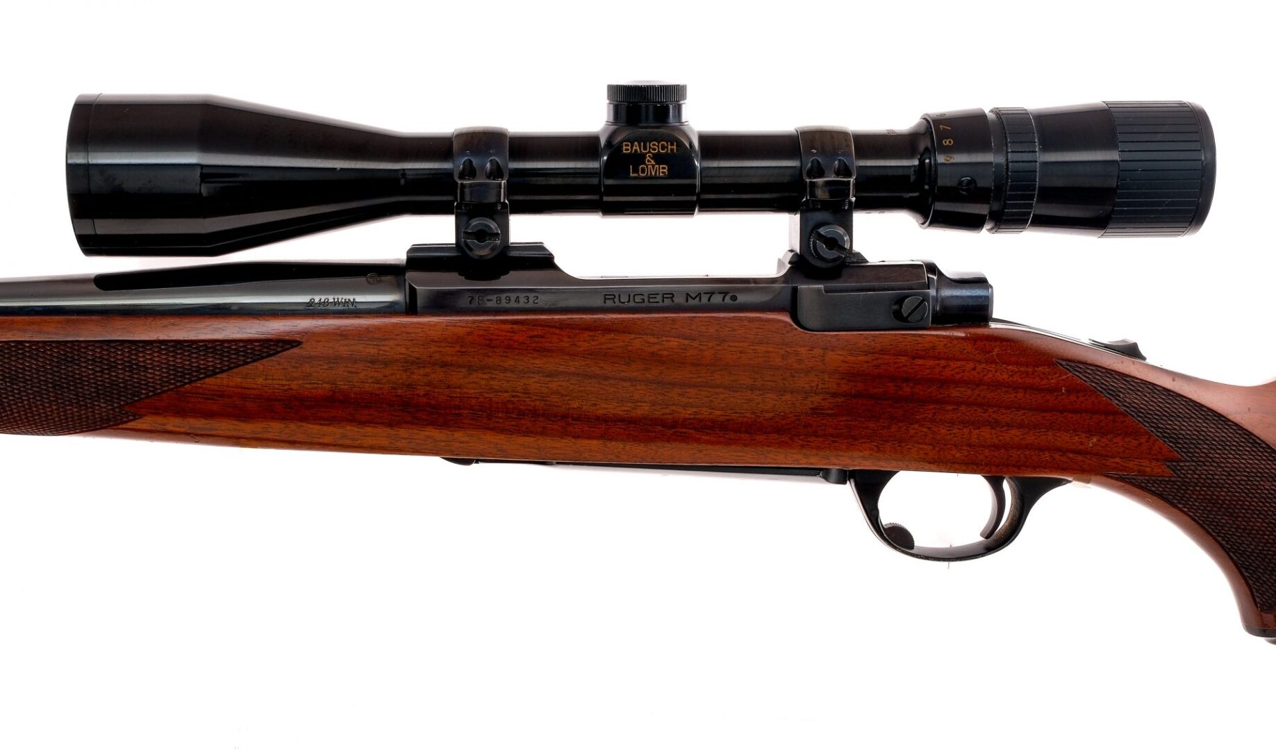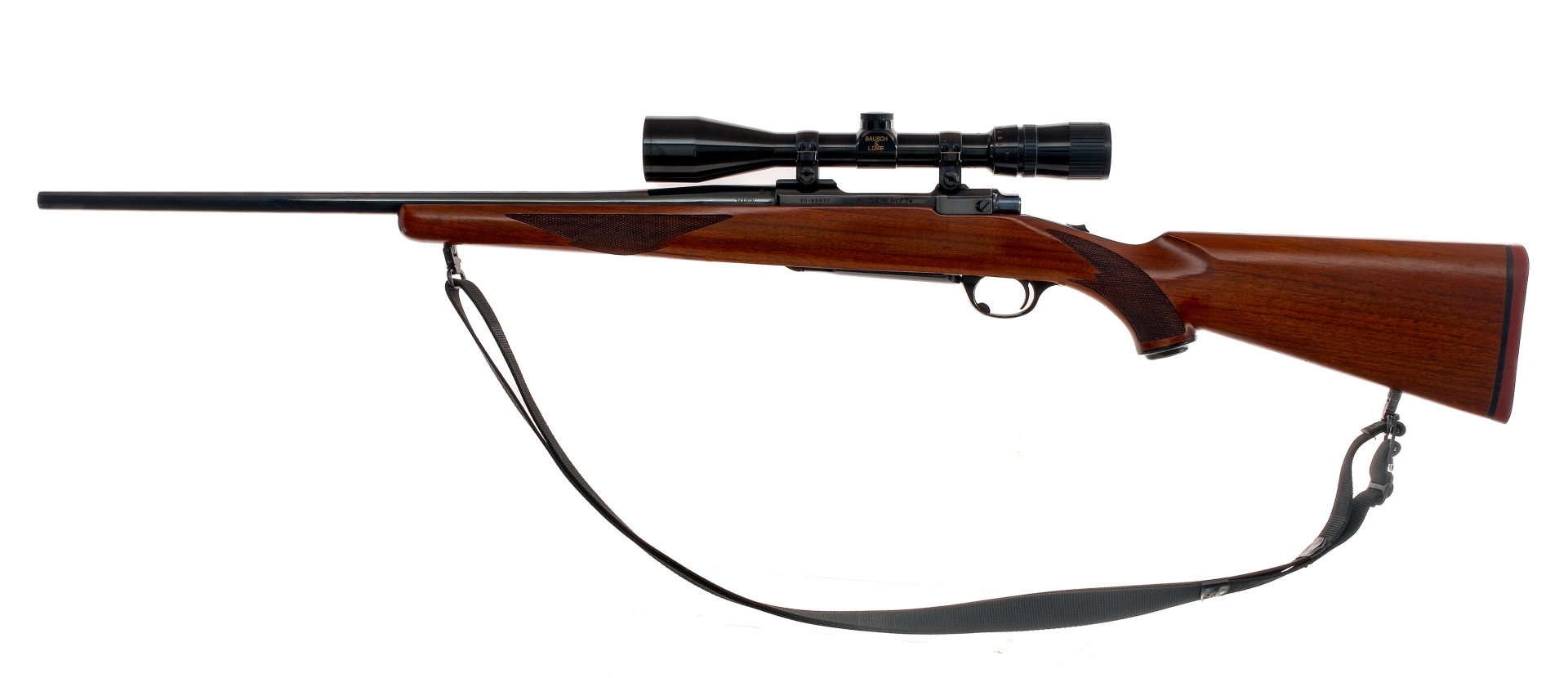 Description Ruger M77 in .243 Winchester with a four round capacity and a 22″ barrel. Rubber butt pad. Checkered wood stock and front forend. Blued trigger guard, trigger, receiver, bolt and barrel. Rear receiver tang slide button safety. Rear left side of receiver bolt release. No fixed sights. Mounted with a Bausch & Lomb Balvar scope with clear glass and a duplex reticle. Metal loops and a nylon shoulder sling. Must ship to a FFL holder. Condition: Good with scratches and tiny touches of rust on the barrel. Clean rifled bore. Barrel Length: 22″ Serial: 78-89432 Manufacturer: Ruger Caliber: .243 Win Model: M77 Year-Range 1985-1987 Book# 03353