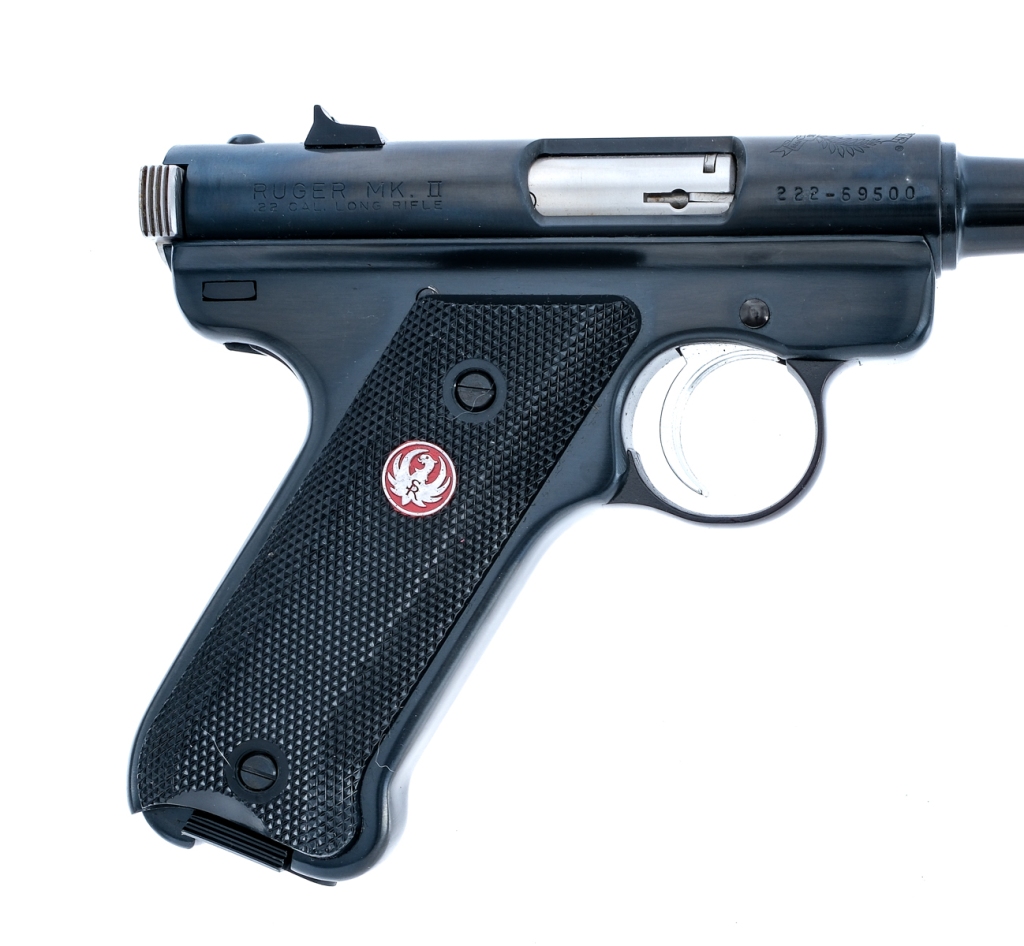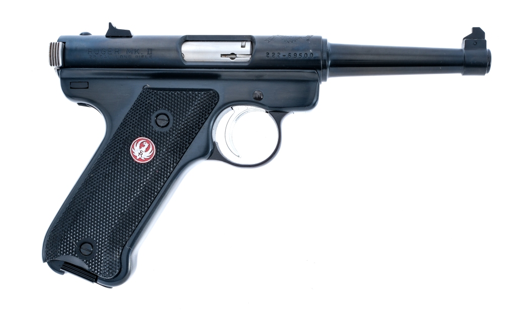 Description Ruger MK II Fifty Years Anniversary chambered in .22 long rifle with two, ten round removable magazines and a 4 3/4″ barrel. Manufactured in 1999 with serial number 222-69500. Blued steel frame with heel magazine release and checkered polymer grips. Blued barrel and upper. Stainless serrated trigger and charging bolt ears. Fixed iron sights. The top of the upper is marked with the 50 years crest. Comes in its factory box with matching serial number and factory paperwork. Must ship to a FFL holder. Condition: Very Good/Excellent with very light handling and operational wear. Bright and clean bore with strong rifling. Barrel Length: 4 3/4″ Serial: 222-69500 Manufacturer: RUGER Caliber: .22 Long Rifle Model: MK II 50 Years Book# 07577