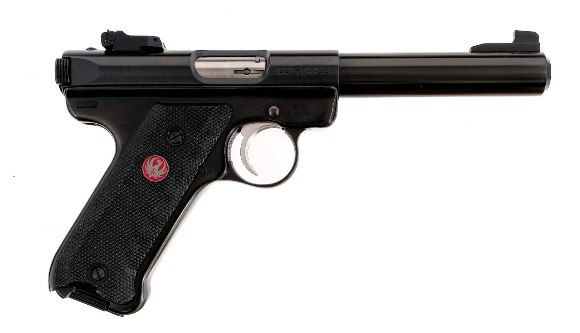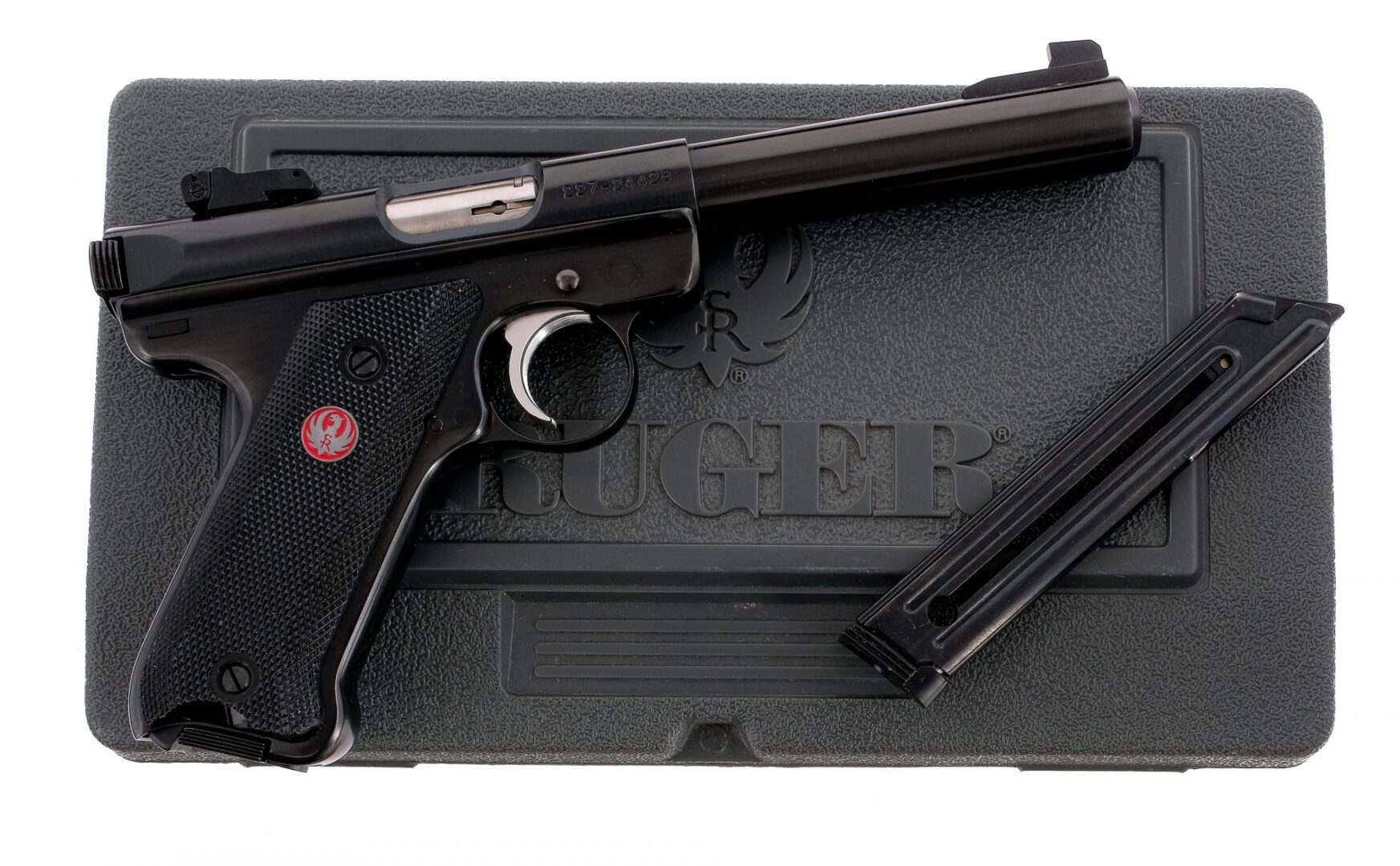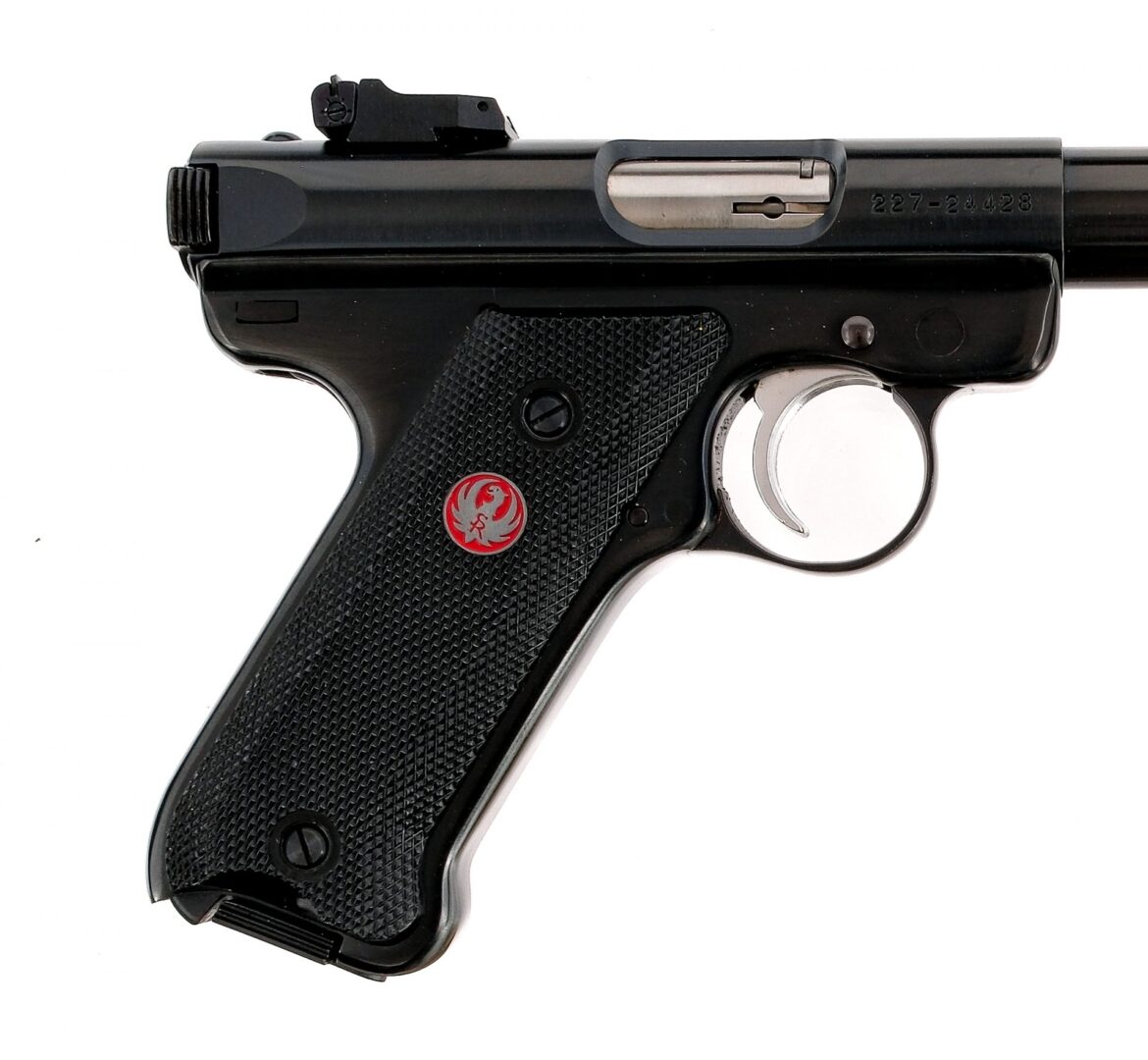 Description Ruger MK III Target chambered in .22 long rifle with two, ten round removable magazines and a 5.5″ bull barrel. Manufactured in 2005 with serial number 227-24428. Blued steel frame with checkered polymer Ruger grips. Push button magazine release and serrated bolt release. Frame mounted manual thumb safety. Stainless serrated trigger. Blued barrel and drilled and tapped slide with serrated bolt charging ears. Adjustable rear target sight and fixed front blade. Comes in its factory box with matching serial number, manual, and two magazines. Must ship to a FFL holder. Condition: Very good/Excellent with very light handling and operational wear. Clean rifled bore. Barrel Length: 5.5″ Serial: 227-24428 Manufacturer: RUGER Year: 2005 Caliber: .22 Long Rifle Model: MK III Target Book# 04540