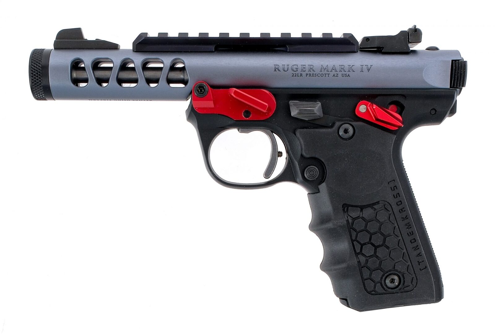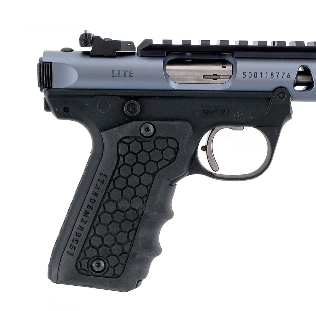 Description Ruger MKIV 22/45 Lite chambered in .22 long rifle with two, ten round removable magazines and a 4.5″ non threaded barrel. Manufactured in 2018 with serial number 500118776. Polymer frame with after market Tandemkross rubber grips. Textured push button magazine release and slide release. After Market red anodized manual thumb safety and thumb shelf. Anodized blue upper with serrated bolt ears and picatinny optics rail. Adjustable rear sight and fixed front blade. Comes in its factory Ruger box with lock, Volquartsen shorter overtravel screw, Volquartsen springs, original grips, two magazines, and extra/spare/original parts. Must ship to a FFL holder. Condition: Very good/Excellent with very light handling/operational wear. Clean rifled bore. Barrel Length: 4.5″ Serial: 500118776 Manufacturer: RUGER Year: 2018 Caliber: .22 Long Rifle Model: MKIV 22/45 Lite Book# 04564
