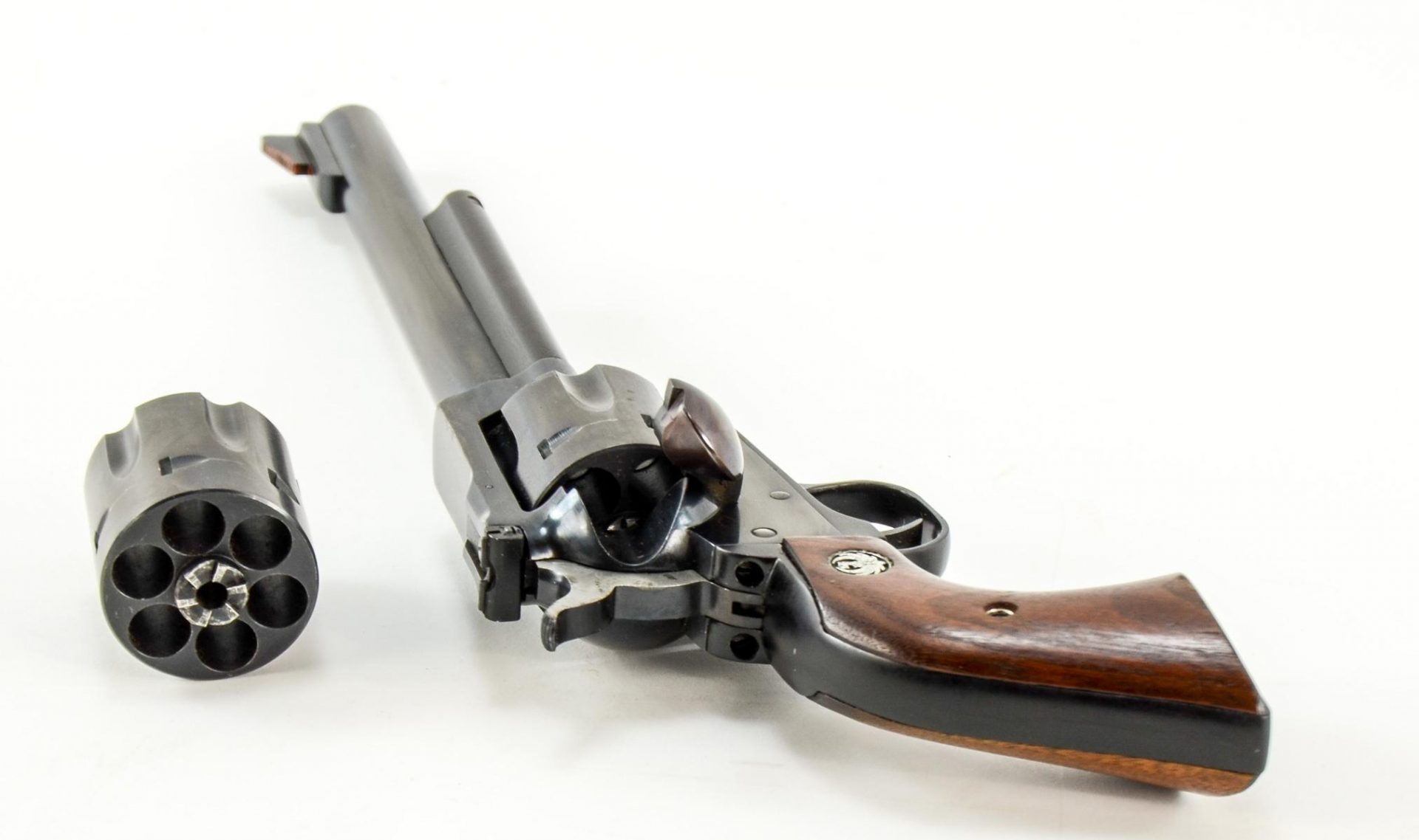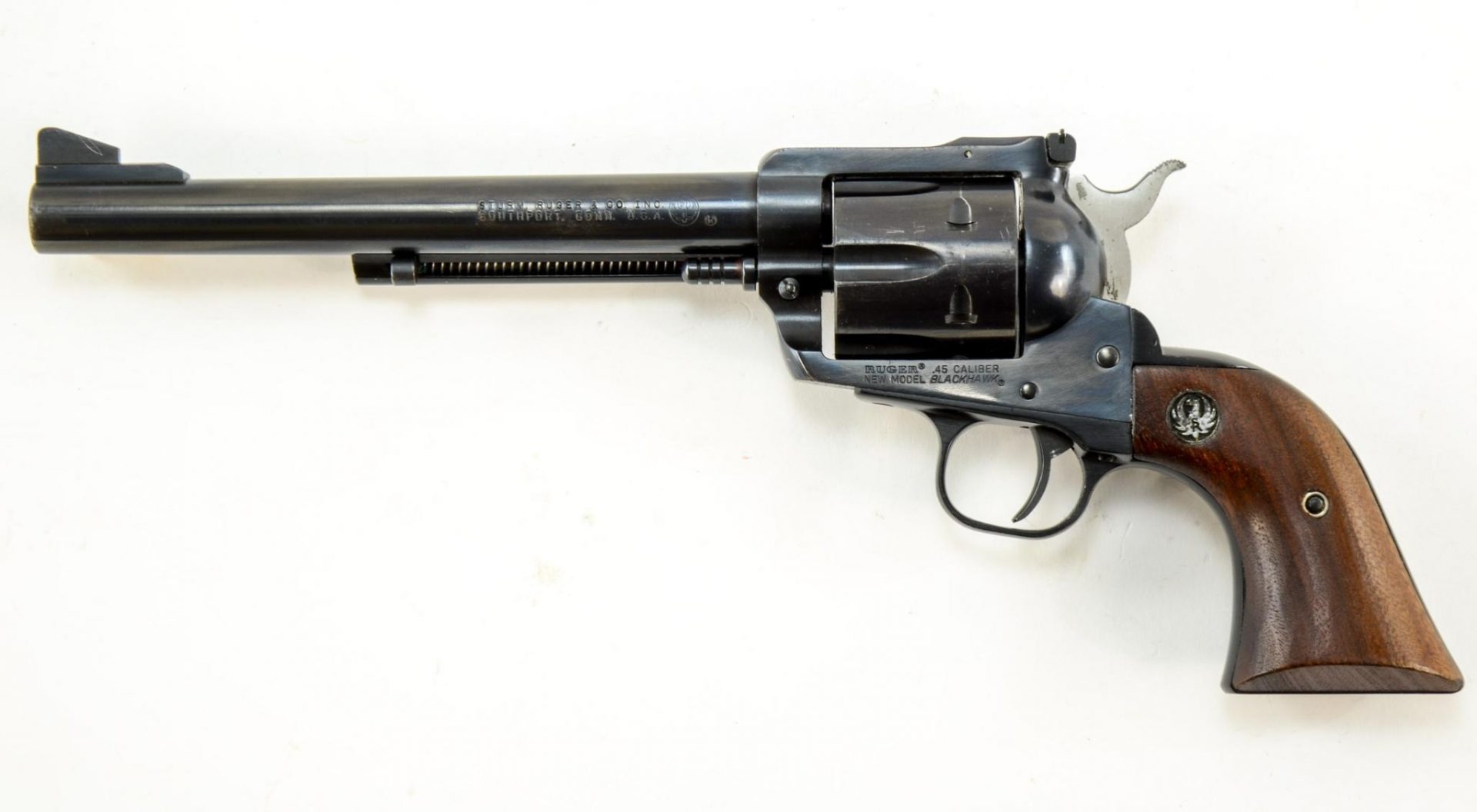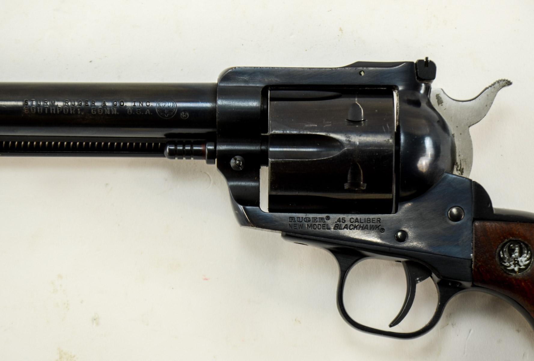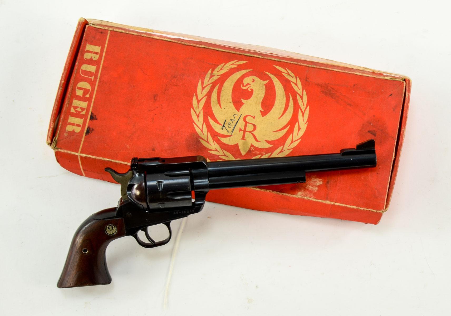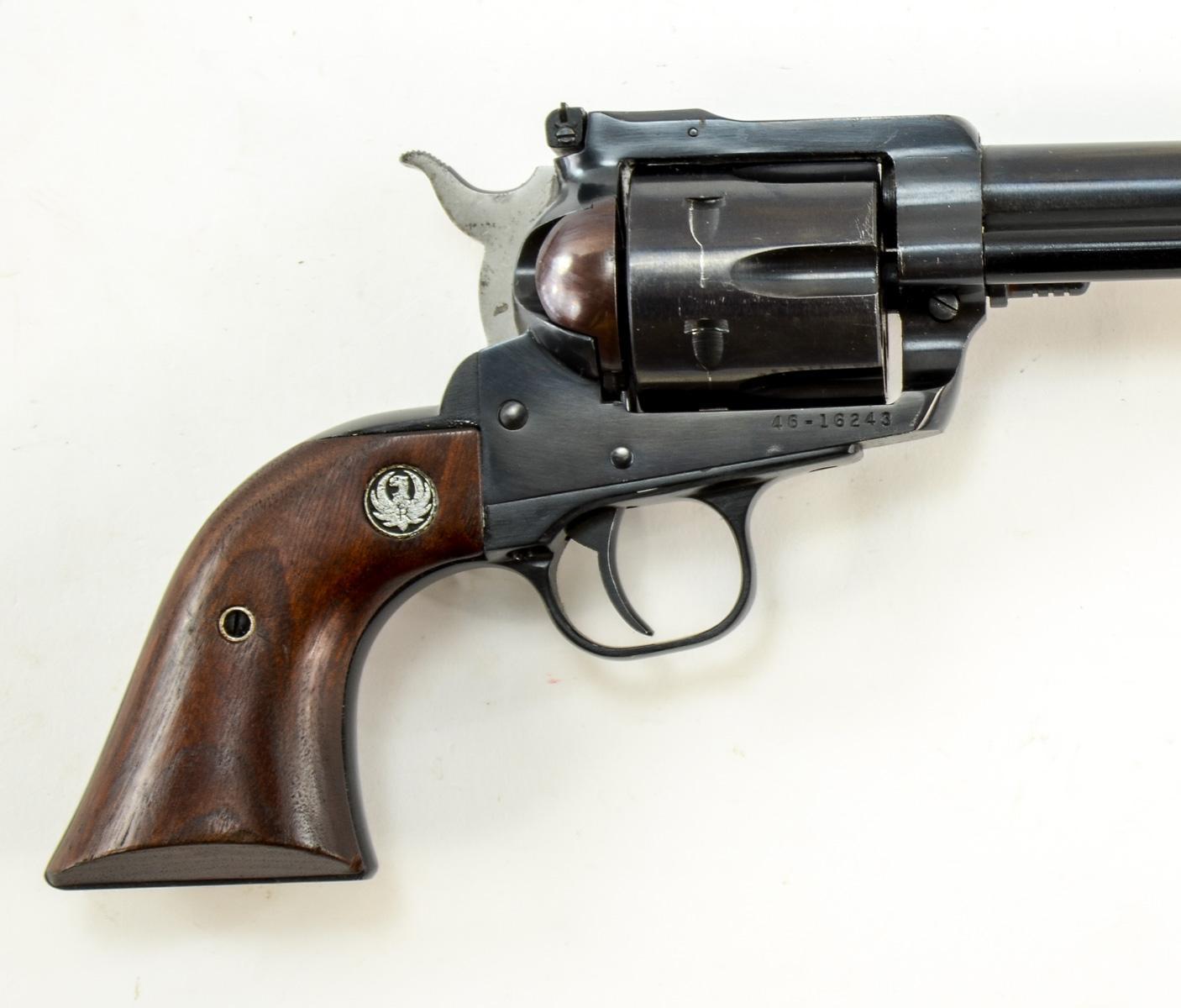 Ruger Revolver, Blued with 7.5″ barrel. Able to accept either .45 Colt or .45 ACP by switching cylinder. Older gun with matching box. No papers. Dark walnut grips.
