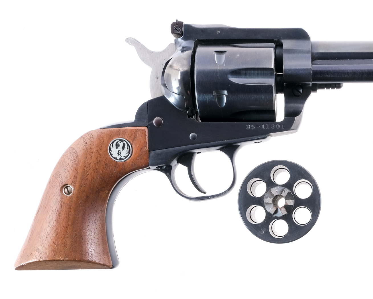 Description Ruger New Model Blackhawk chambered in .357 magnum with a six-shot cylinder capacity and a 6.5″ barrel. Comes with a six-shot 9mm conversion cylinder. Single action revolver with smooth wood Ruger grips. Black finished metal frame, cylinder, barrel, ejector, and smooth trigger. Stainless serrated hammer. Rear adjustable and front ramp sights. Must ship to FFL holder. Condition: Very good with some scratches and general handling wear. Bore is clean with visible rifling. Barrel Length: 6.5″ Serial: 35-11301 Manufacturer: RUGER Caliber: .357 Magnum/9mm Model: New Model Blackhawk Book# 9-704