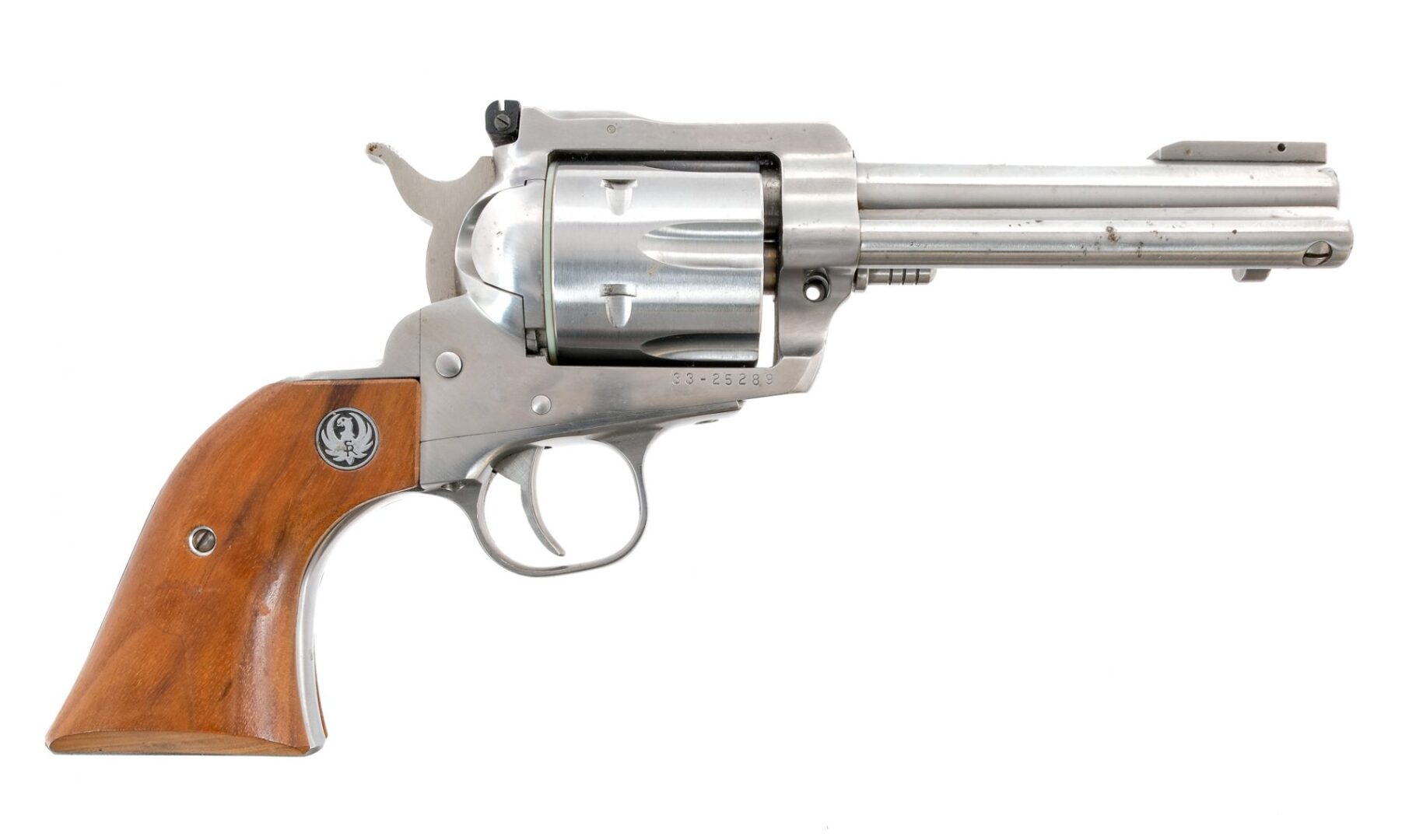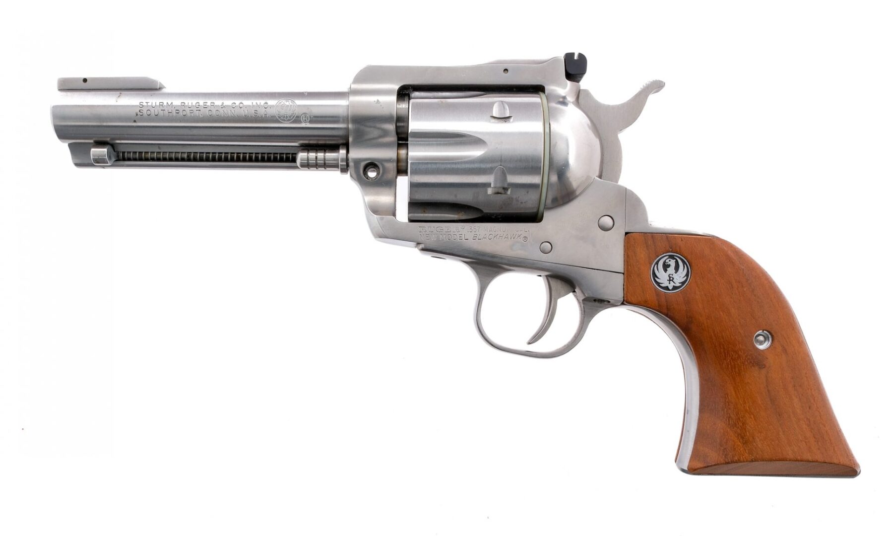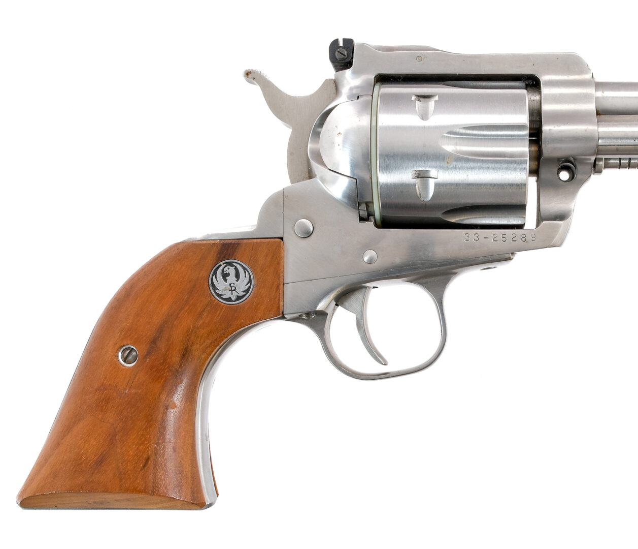 Description Ruger New Model Blackhawk in .357 Magnum with a six round capacity and a 4.75″ barrel. Smooth wood grip plates. Polished stainless steel frame, trigger, cylinder, serrated hammer and barrel. Right side of frame loading gate. Under barrel cylinder release pin and extractor. Rear adjustable and missing the front blade sight. Must ship to a FFL holder. Condition: Good with spots of rust and the cylinder pin retaining screw is loose. Clean rifled bore. Barrel Length: 4.75″ Serial: 33-25289 Manufacturer: Ruger Year: 1977 Caliber: .357 Mag Model: New Model Super Blackhawk Book# 01198