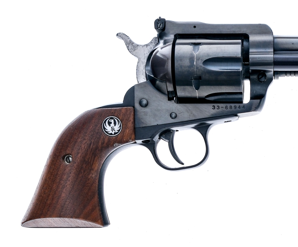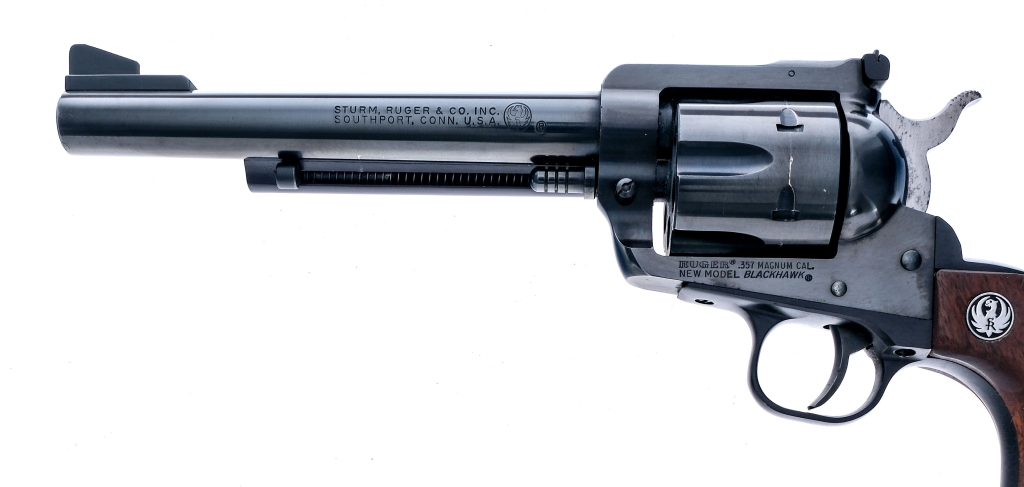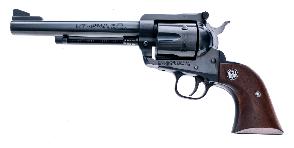 Description Ruger New Model Blackhawk in .357 Magnum with a six round capacity and a 6.5″ barrel. Made in Southport Connecticut in 1977. Smooth wood grip plates. Blued trigger guard, trigger, hammer, frame, cylinder and barrel. Right ide of frame loading gate. Under barrel cylinder release pin and extractor rod. Rear adjustable and front fixed blade sight. Comes in its factory box with instruction manual and written serial number on side of box. Must ship to a FFL holder. Condition: Very Good with light scratches and handling wear. Clean rifled bore. Barrel Length: 6.5″ Serial: 33-68944 Manufacturer: Ruger Year: 1977 Caliber: .357 Mag Model: New Model Blackhawk Book# 08472
