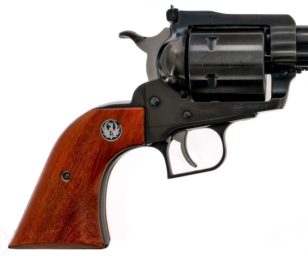 Description Ruger Super Blackhawk chambered in .44 magnum with a six-shot cylinder and a 7.5″ barrel. Manufactured in 1997 with serial number 86-95937. Blued barrel, frame, and unfluted cylinder. Stainless/blued single action trigger and hammer. Smooth hardwood grips. Adjustable rear sight and fixed front ramp sight. Must ship to a FFL holder. Condition: Very Good with light scratches and wear from normal handling. Light operational wear such as a cylinder turn line. Clean bore with strong rifling. Barrel Length: 7.5″ Serial: 86-95937 Manufacturer: RUGER Year: 1997 Caliber: .44 Remington Magnum Model: Super Blackhawk Book# 03099