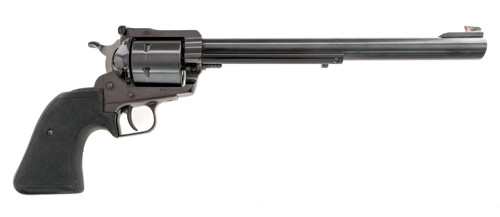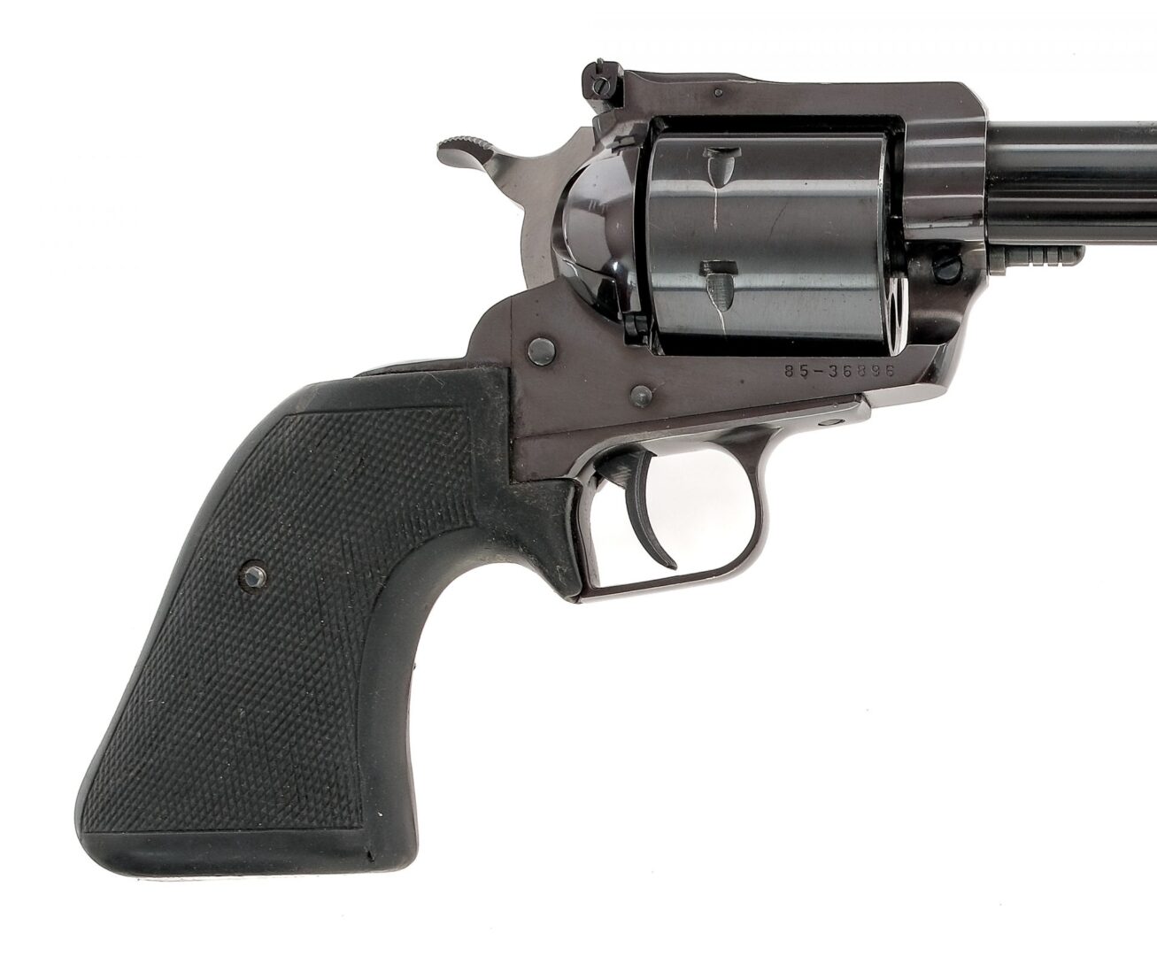 Description Ruger New Model Super Blackhawk chambered in .44 Remington Magnum with a six-shot cylinder and a 10.5″ barrel. Manufactured in 1984 with serial 85-36896. Blued barrel, frame, and unfluted cylinder. Single action trigger and hammer. Checkered hard rubber grips. Adjustable rear U-notch sight and fixed front blade. Must ship to a FFL holder. Condition: Very Good with light scratches and wear from normal handling and operation. Light operational wear and cylinder turn line. Light scratches and wear on the grips. Bright and very clean bore with strong rifling. Barrel Length: 10.5″ Serial: 85-36896 Manufacturer: RUGER Year: 1984 Caliber: .44 Remington Magnum Model: New Model Super Blackhawk Book# 03450