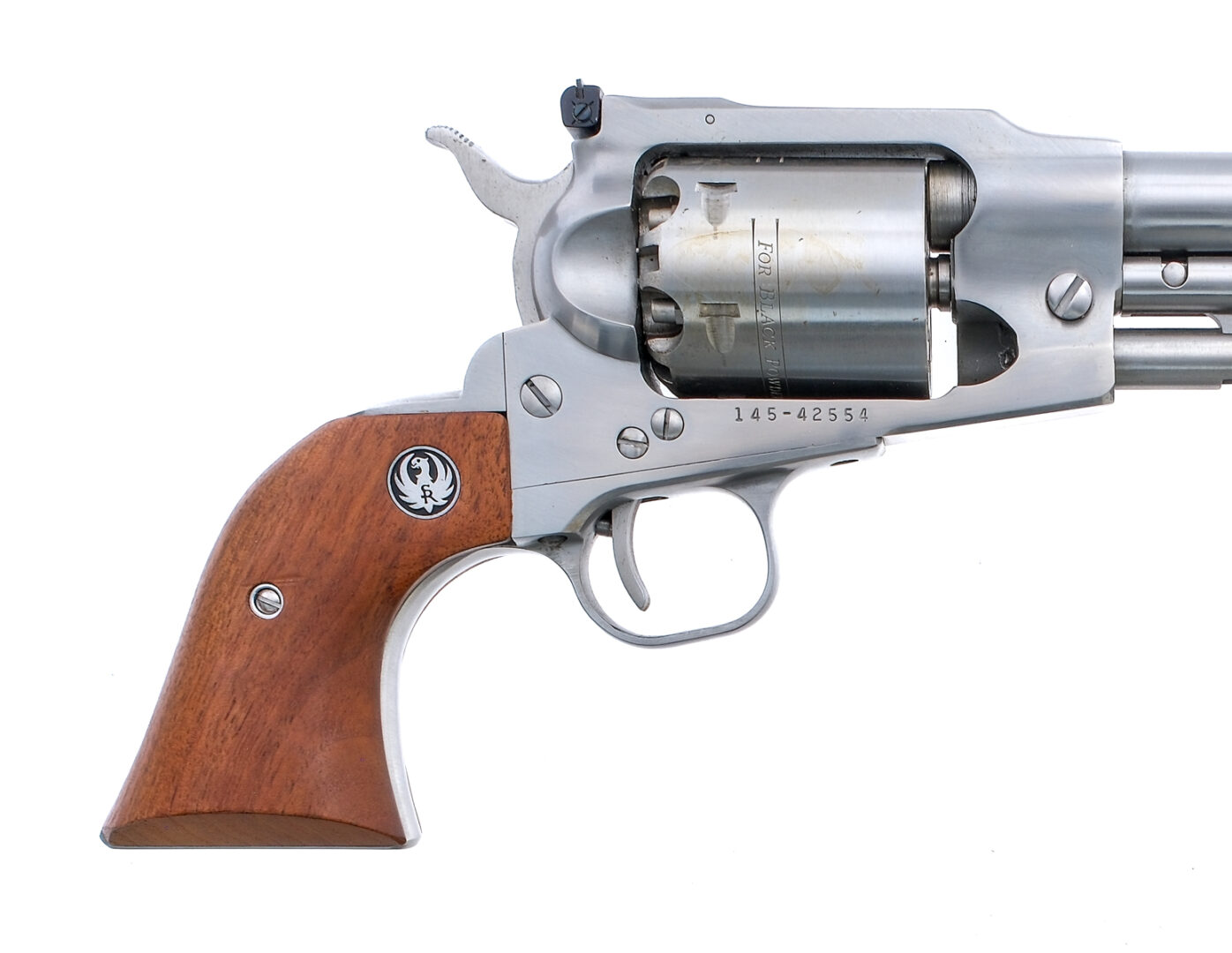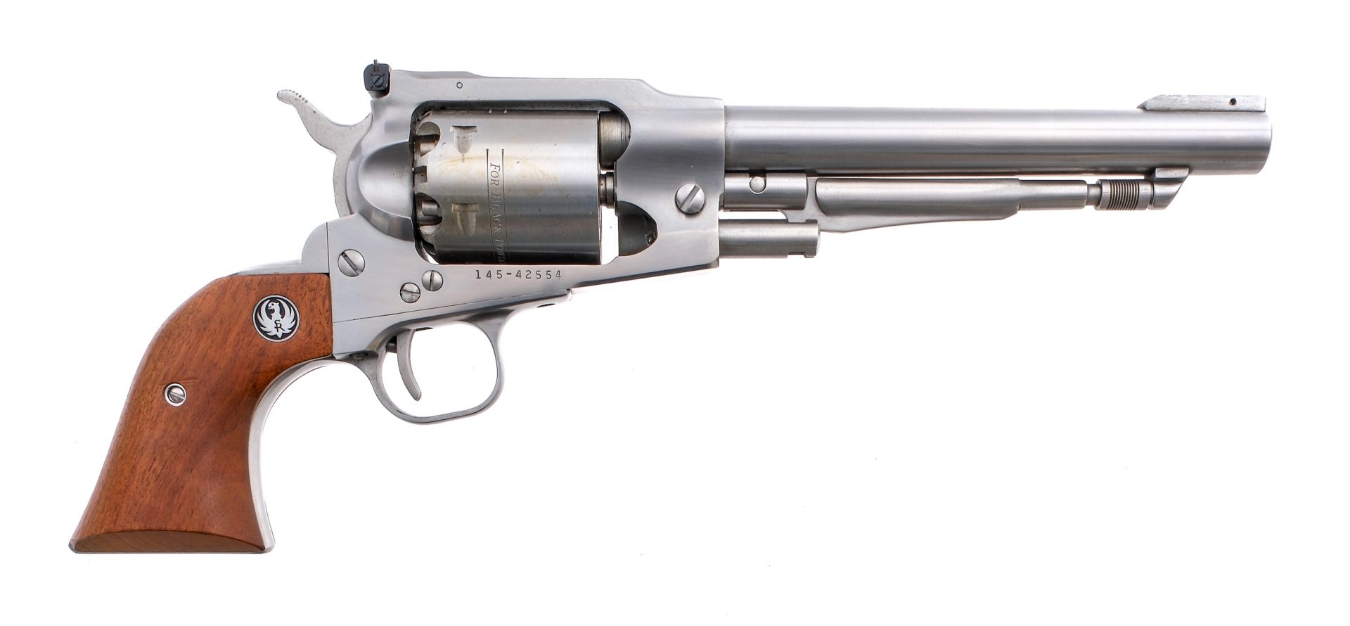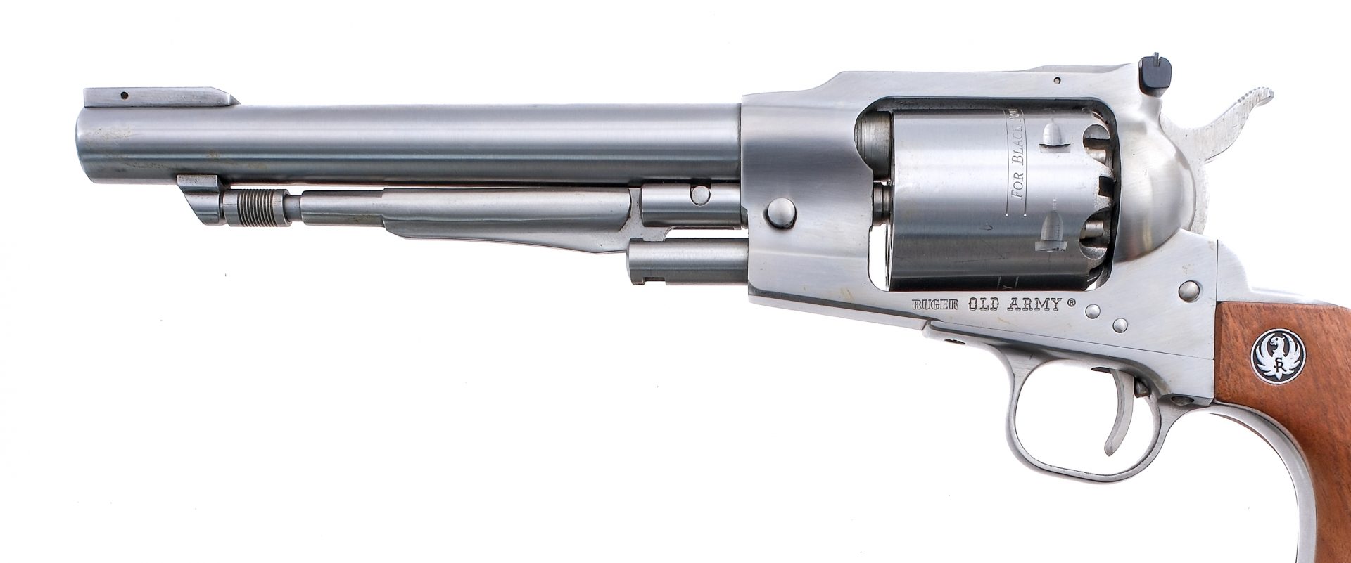 Description Ruger Old Army in .44 caliber with a six round capacity and a 7.5″ barrel. Smooth wood grip plates. Polished stainless steel trigger guard, trigger, frame, hammer, cylinder and barrel. Under barrel ramrod. Rear adjustable and missing the front fixed blade sight. Comes in its factory box without serial number. Black Powder Cap & Ball Percussion Revolver, No FFL required and ships to MOST buyers homes. Condition: Very Good with light scuffs and handling wear. Missing the front sight blade. Clean rifled bore. Barrel Length: 7.5″ Serial: 145-42554 Manufacturer: Ruger Year: 1982 Caliber: .44 Model: Old Army