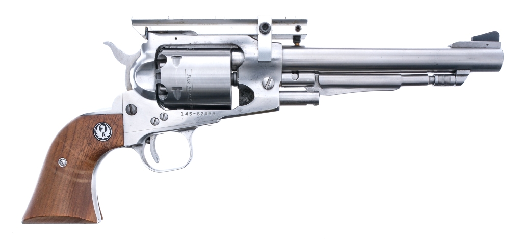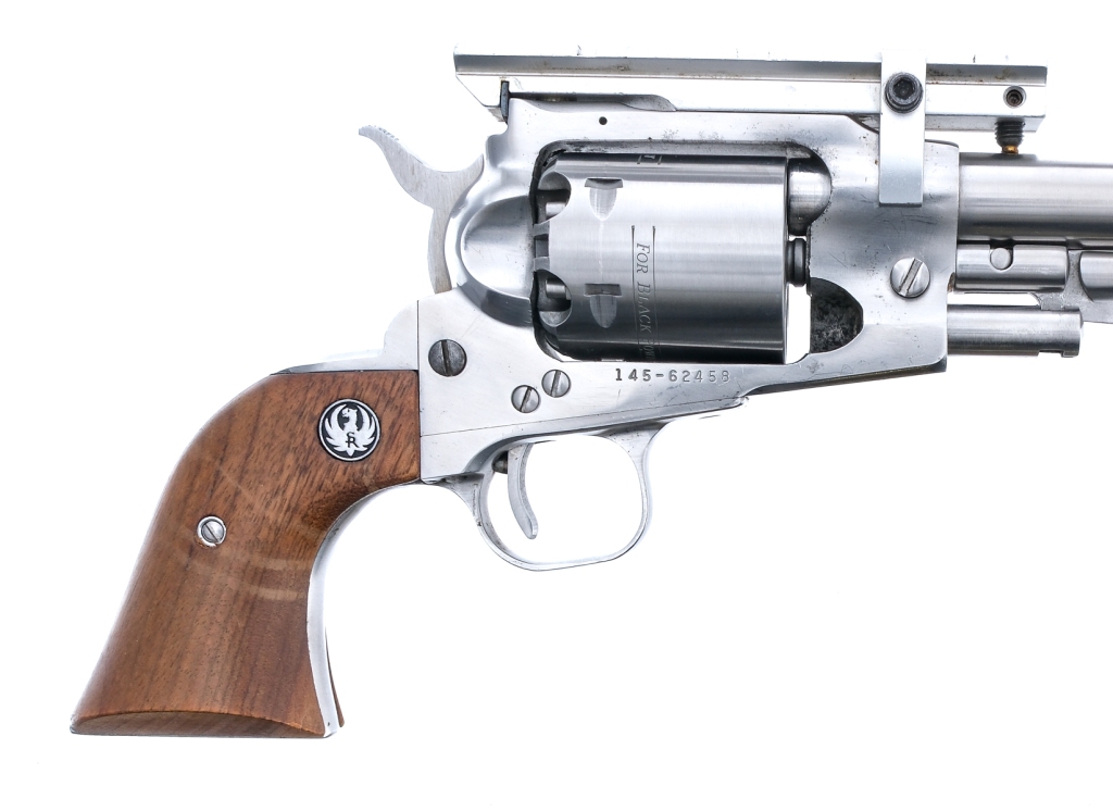 Description Ruger Old Army chambered in .44 Caliber Black Powder with a six-shot cylinder and a 7.5″ barrel. Manufactured in 1989 with serial number 145-62458. Stainless steel barrel, ram rod, frame, cylinder, single action trigger, and hammer. Smooth wood grips. The frame has a mounted B-Square rail. Fixed front blade. Rear sight is included. Black powder, ships directly to buyer in MOST states. Condition: Good/Very Good with scratches and general cosmetic handling wear. Light cylinder turn line and operational wear. Light wear on the grips. Spots of metal oxidation on the hammer, backstrap, nipples, and on the frame under the grips. Bright and clean rifled bore. Barrel Length: 7.5″ Serial: 145-62458 Manufacturer: RUGER Year: 1989 Caliber: .44 Remington Magnum Model: Old Army