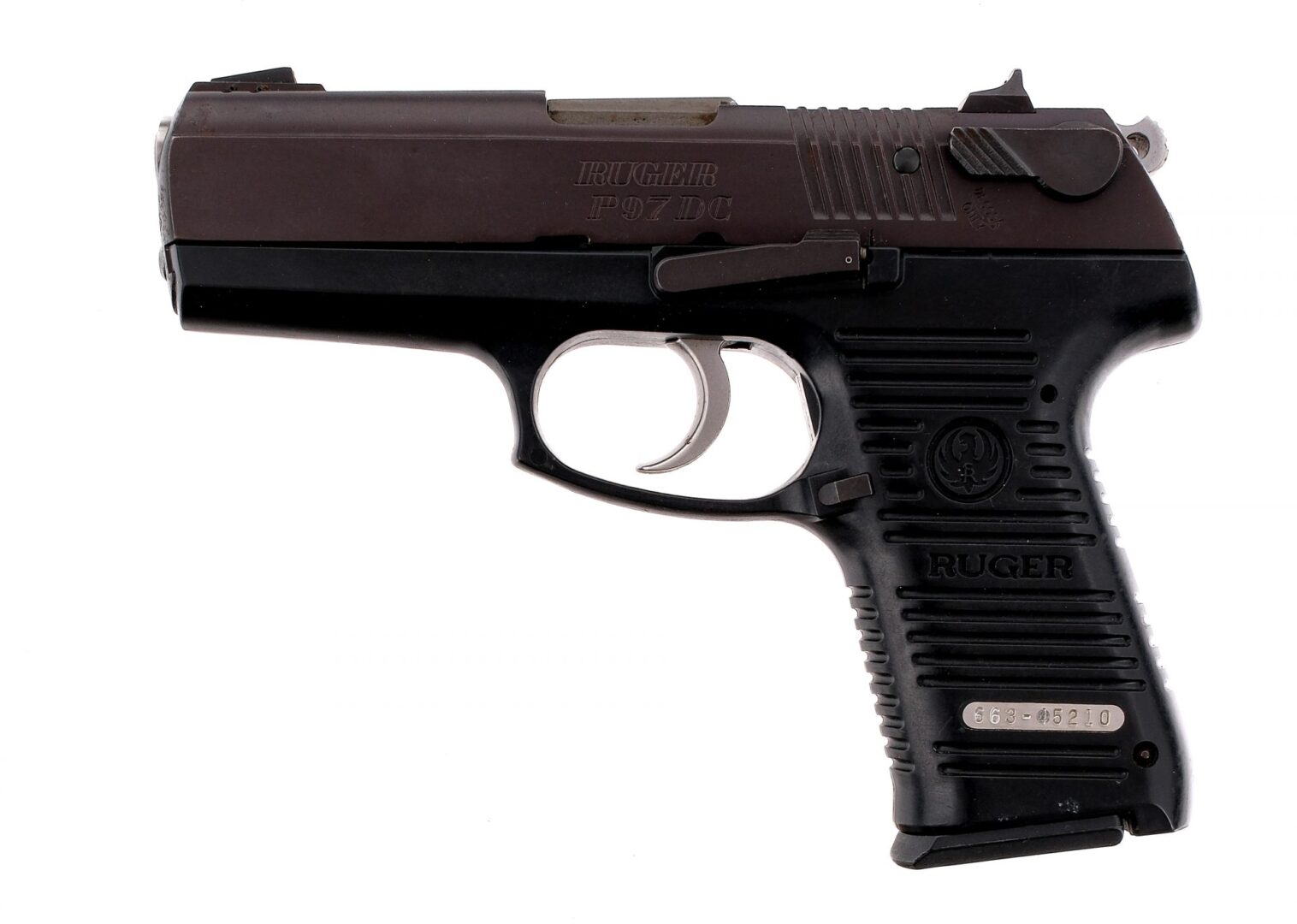 Description Ruger P97DC chambered in .45 ACP with two, eight round removable magazines and a 4.25″ barrel. Manufactured in 2002 with serial number 663-45210. Ribbed polymer frame with stainless double/single action trigger and hammer. Blued (plum) serrated slide with ambidextrous de-cocking levers. White three-dot iron sights. Must ship to a FFL holder. Condition: Good with light scratches and wear from handling/operation. Spots of metal oxidation throughout. The blued finish has plumed. Clean rifled bore. Barrel Length: 4.25″ Serial: 663-45210 Manufacturer: RUGER Year: 2002 Caliber: .45 ACP Model: P97DC Book# 04524