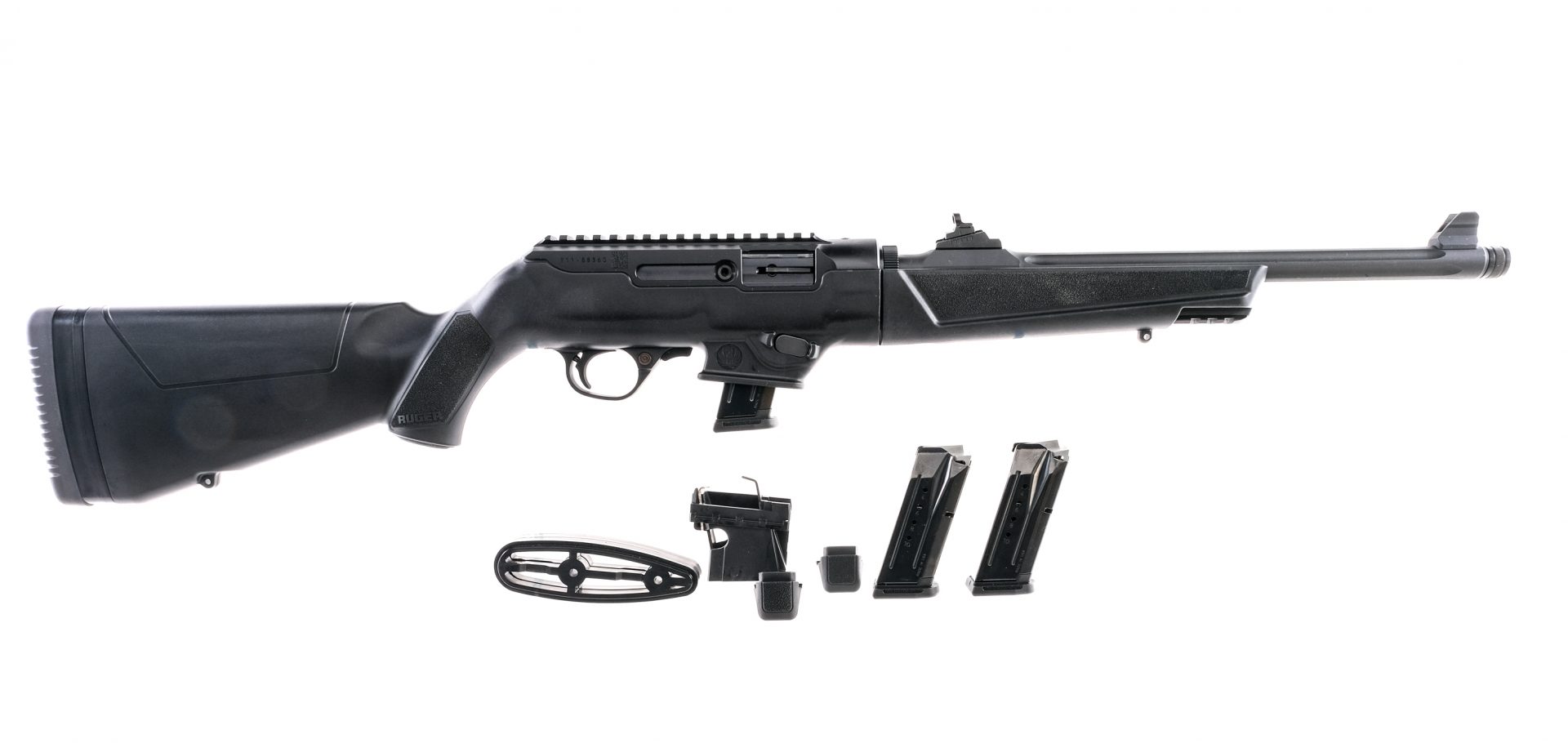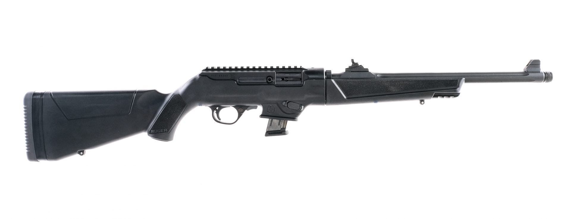 Description Ruger PC Carbine chambered in 9mm with three, ten round Ruger magazines and a 16.12″ threaded, fluted barrel. This rifles magwell is interchangeable, currently the magwell installed is for R9/G40 pattern magazines with a second G9/G40 magazine magwell. Textured synthetic forend with accessories rail and takedown lever. Aluminum alloy receiver with top picatinny rail and reversible charging handle. Reversible magazine release and cross bolt safety. Synthetic stock with textured pistol grip and rubber butt pad. Rear adjustable ghost ring and shrouded front blade iron sights. Includes factory matching box, extra stock spacers, breach lock with keys, allen key, manual, and two spare angled magazine plates. Must ship to FFL holder. Threaded barrel, Not CT legal. Condition: Very Good/Excellent with very little handling and storage wear. Very clean rifled bore. Barrel Length: 16″ Serial: 911-88360 Manufacturer: Ruger Caliber: 9mm Model: PC Carbine Book# 01469