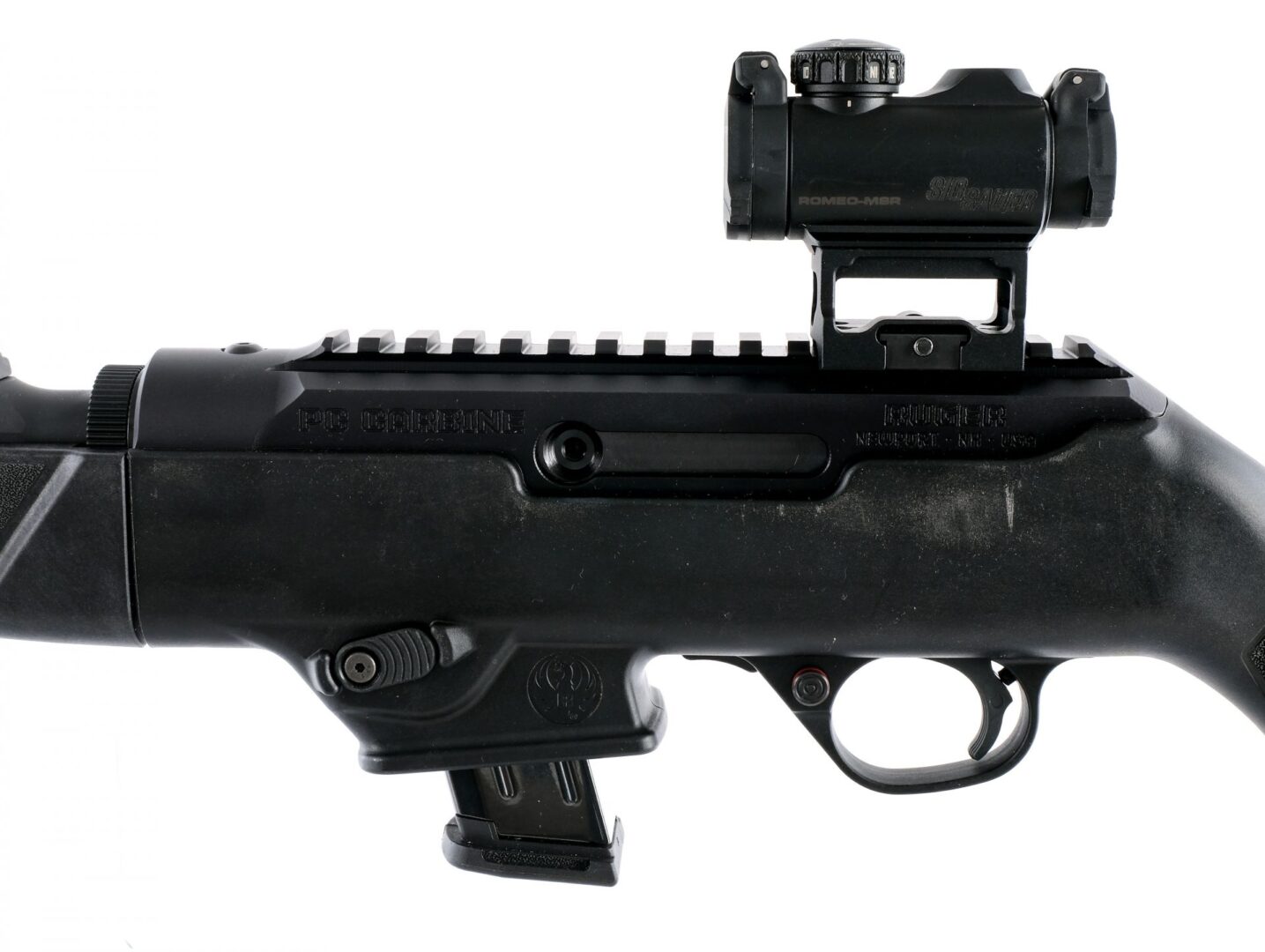 Description *UPDATE* Includes Glock magwell attachment, NOT a speedloader. Ruger PC Carbine Take-Down in 9mm with two, ten round removable Ruger magazines and a 16″ threaded barrel. Serrated rubber butt pad. Textured black composite stock and front forend. Composite trigger guard and serrated trigger. Blued metal receiver and fluted barrel. Front trigger guard push button safety and action release. Left side of receiver serrated magazine release button. Right side of receiver charging handle. Rear adjustable peep and front fixed blade sight. Front under side of forend has a accessories rail. Mounted with a SIG Romeo-MSR green dot sight. Underside of forend located take-down lever. Metal eyelets for mounting a shoulder sling. Comes with two magazines, Glock magwell, gun lock and instruction manual. Check Local/State Laws on Threaded Barrels BEFORE bidding. Must ship to a FFL holder. Condition: Very Good/Excellent with light scratches, dings and handling wear. One of the magazine has light touches of rust. Clean rifled bore. Barrel Length: 16″ Serial: 914-42067 Manufacturer: Ruger Caliber: 9mm Model: PC Carbine Book# 05479