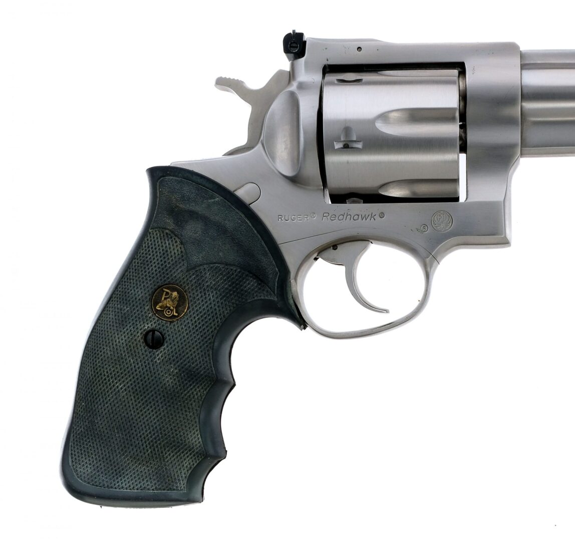 Description Ruger Redhawk chambered in .45 Colt with a six-shot cylinder and a 5.5″ barrel. Manufactured in 1998 with serial number 503-24737. Stainless steel barrel, frame, fluted cylinder, cylinder release, double action trigger, and hammer. Checkered rubber Pachmayr grips. Adjustable rear U-notch and fixed front blade. Must ship to a FFL holder. Condition: Very Good with scratches and cosmetic handling wear. Light turn line and operational wear. The grips have turned a green color and don’t perfectly fit the frame. Bright and clean bore with strong rifling. Barrel Length: 5.5″ Serial: 503-24737 Manufacturer: RUGER Year: 1998 Caliber: .45 Colt Model: Redhawk Book# 05903