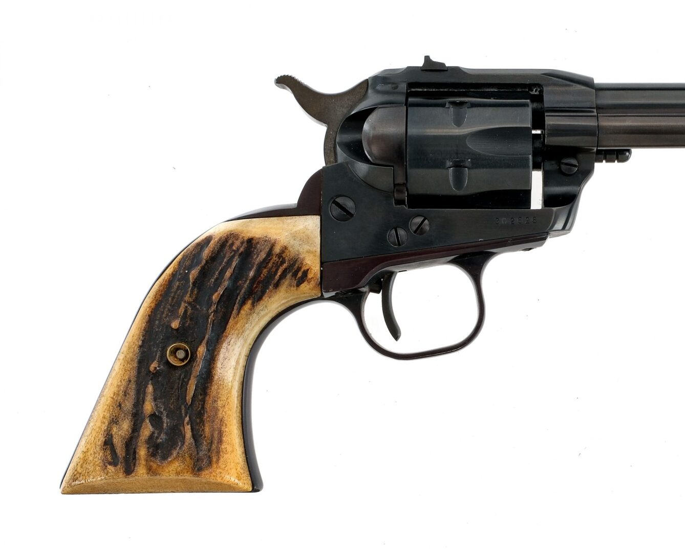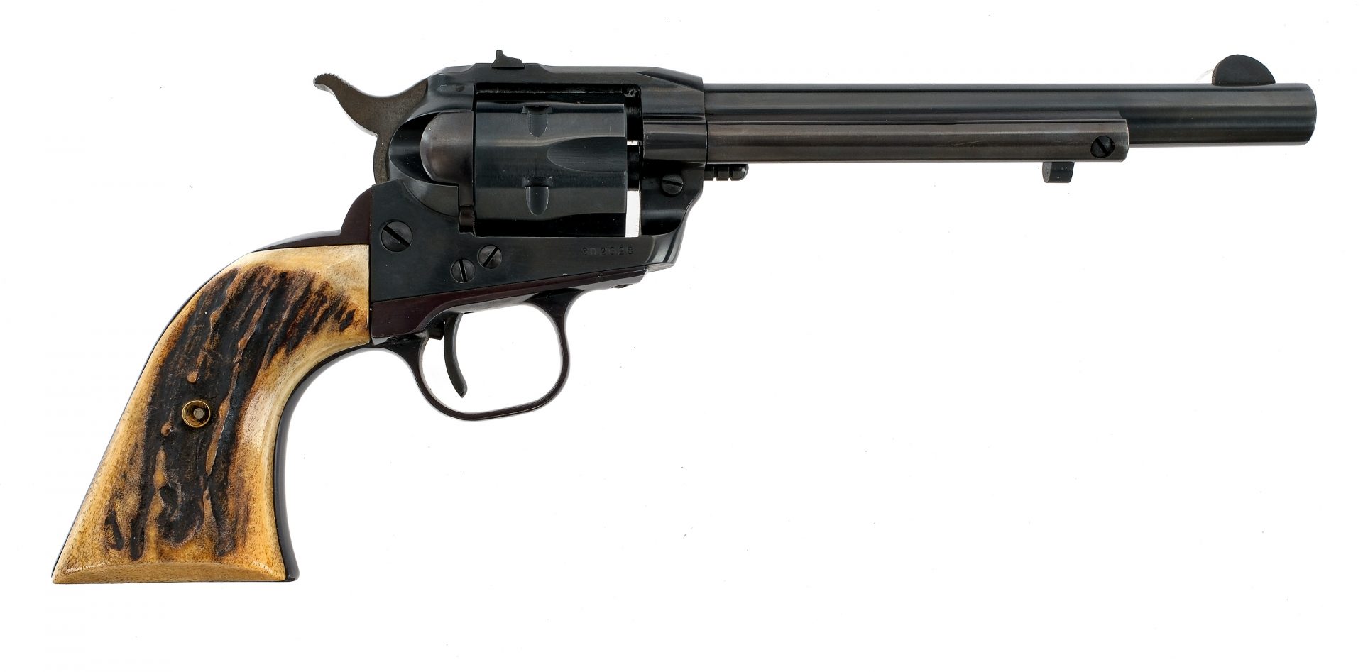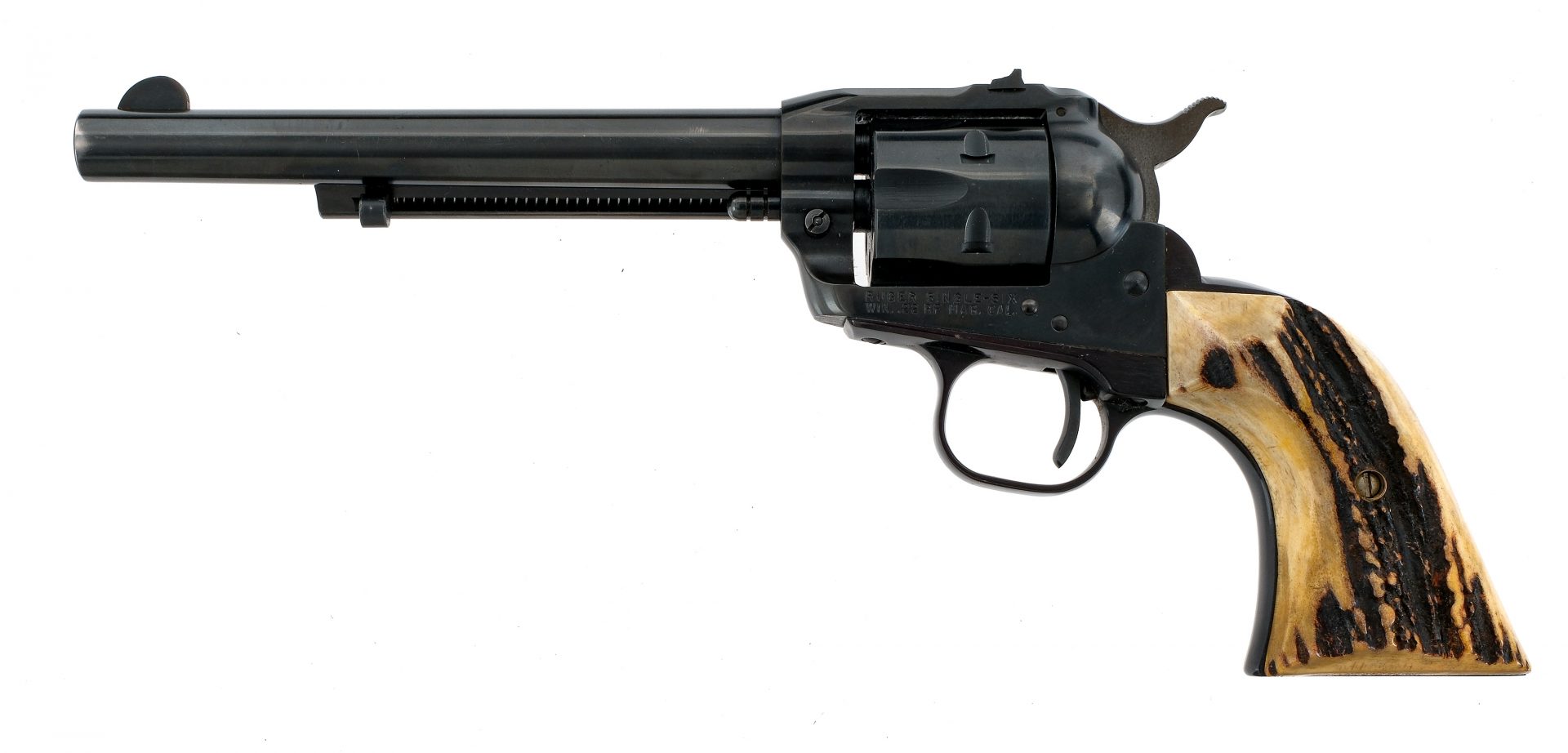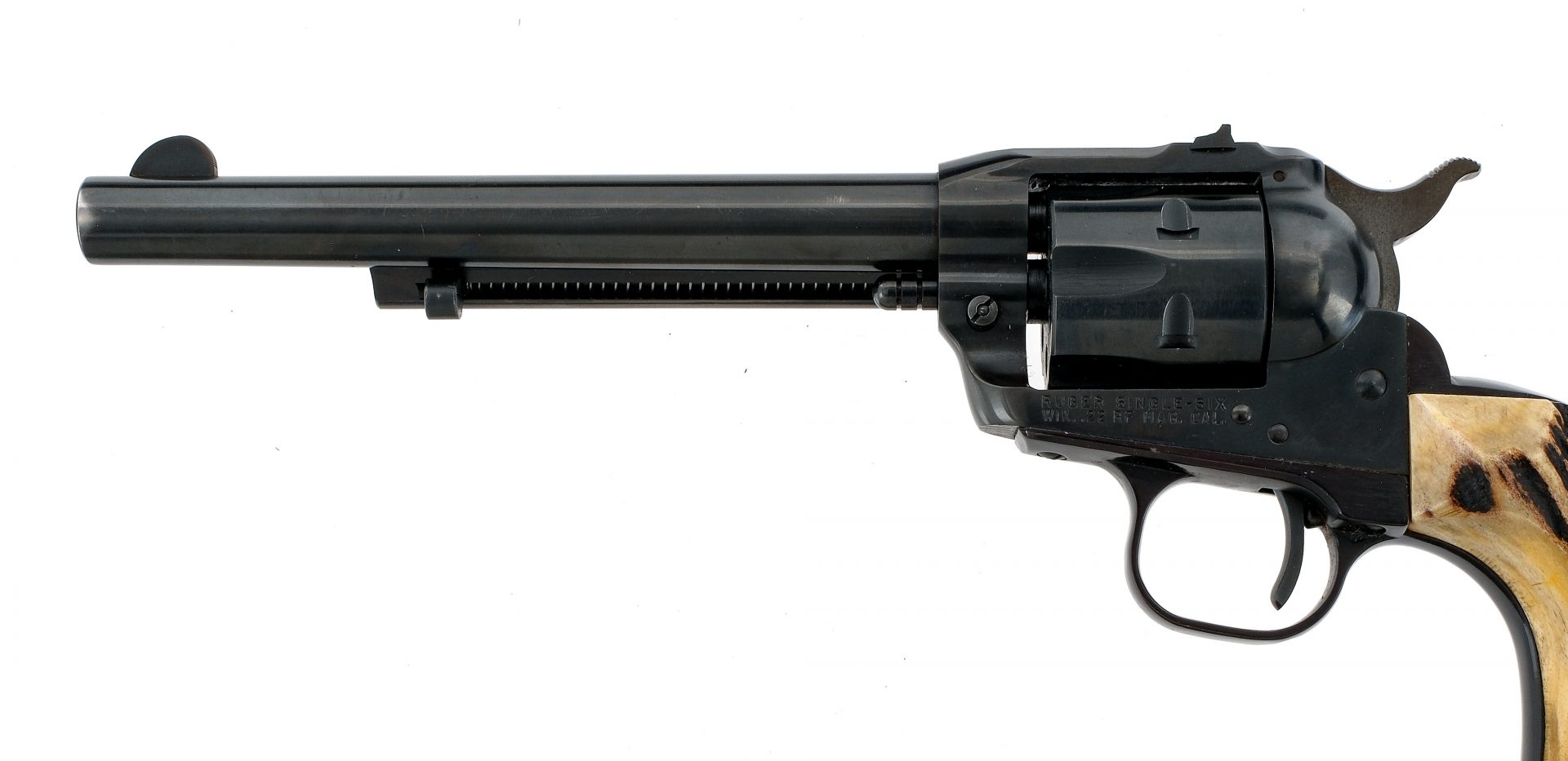 Description Ruger Single Six in .22 Winchester Rimfire Magnum with a six round capacity and a 6.5″ barrel. Made in Southport Connecticut in 1959. Natural antler grip plates. Blued trigger guard, trigger, serrated hammer, frame, cylinder and barrel. Right side loading gate. Under barrel extractor rod and cylinder release pin. Rear notch and front fixed blade sight. Must ship to a C&R or FFL holder. Condition: Very Good with light scuffs, muzzle wear and handling wear. Clean rifled bore. Barrel Length: 6.5″ Serial: 302628 Manufacturer: Ruger Year: 1959 Caliber: .22 Win RF Mag Model: Single Six Book# 04884