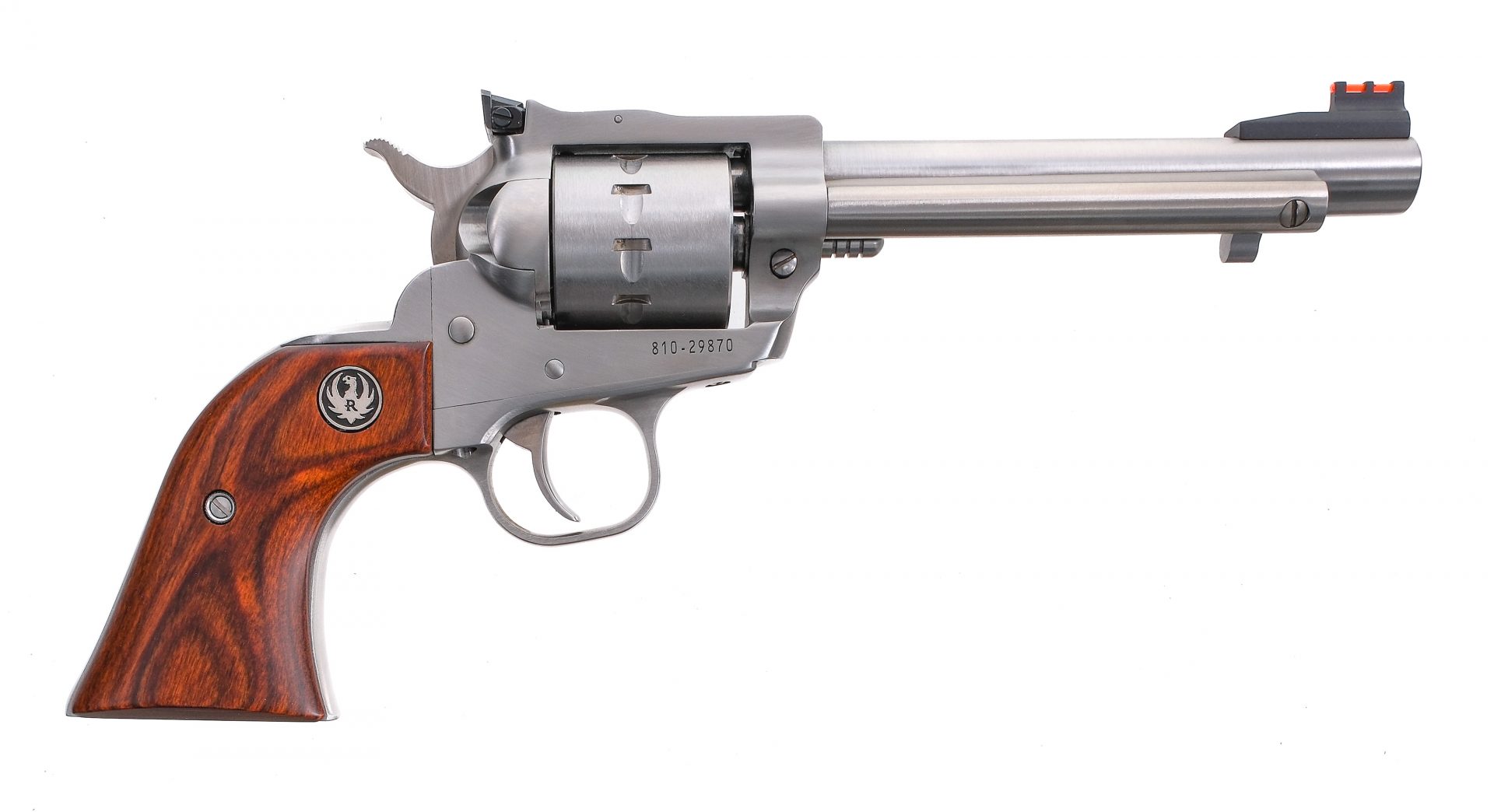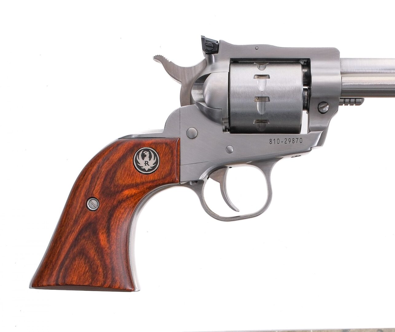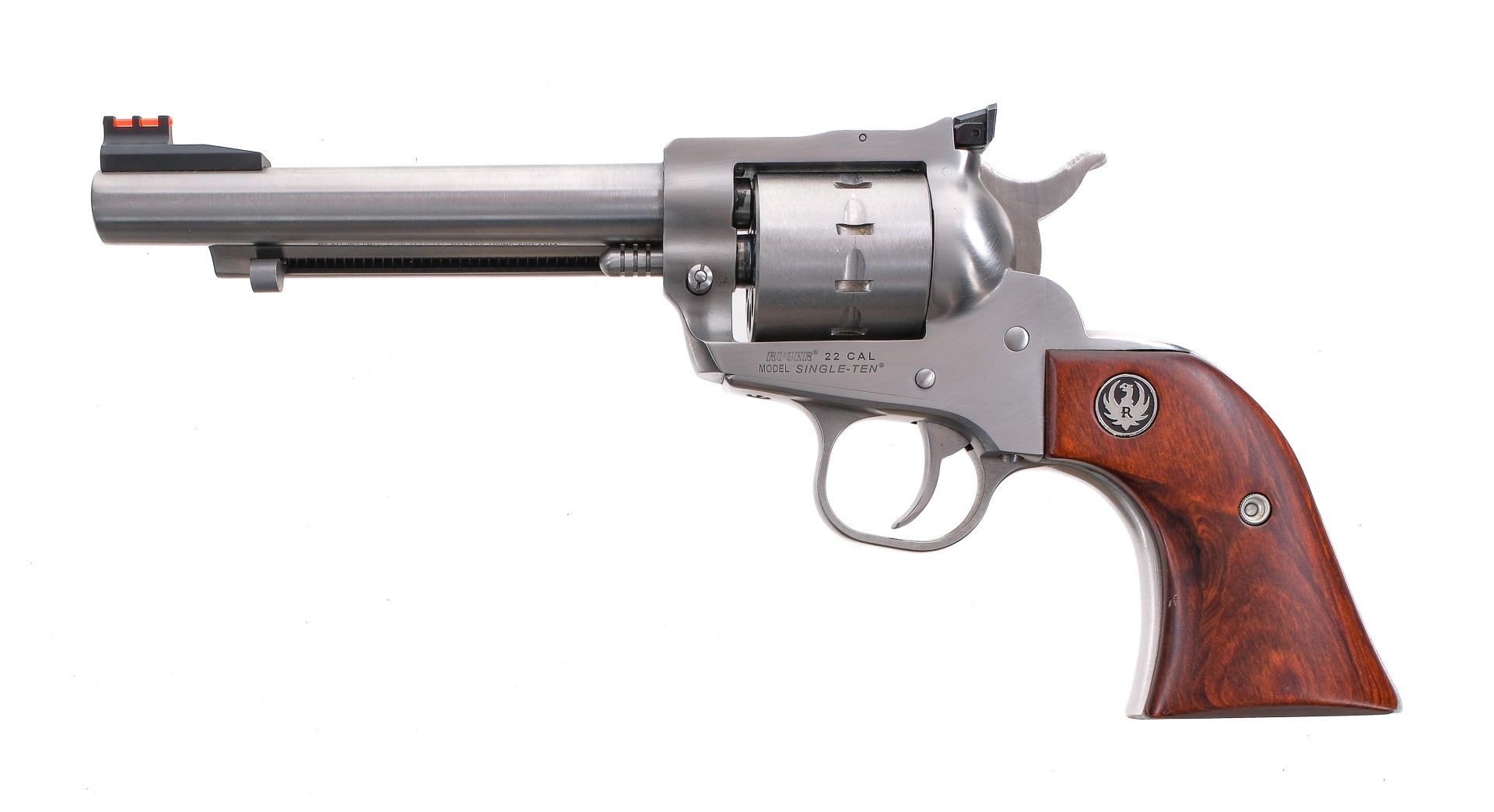 Description Ruger Single Ten chambered in .22 long rifle with a ten-shot cylinder and a 5.5″ barrel. Manufactured in 2019 with serial number 810-29776. Stainless steel barrel, frame, unfluted cylinder, single action trigger and hammer. Smooth wood grips with Ruger medallions. Williams adjustable fiber optic iron sights with green rear and red front. Comes in its factory box with matching serial number, factory paperwork, and cable lock. Must ship to a FFL holder. Condition: Very Good/Excellent with light handling and operational wear. Faint cylinder turn line. Bright and clean rifled bore. Barrel Length: 5.5″ Serial: 810-29876 Manufacturer: RUGER Year: 2019 Caliber: .22 Long Rifle Model: Single Ten Book# 03846