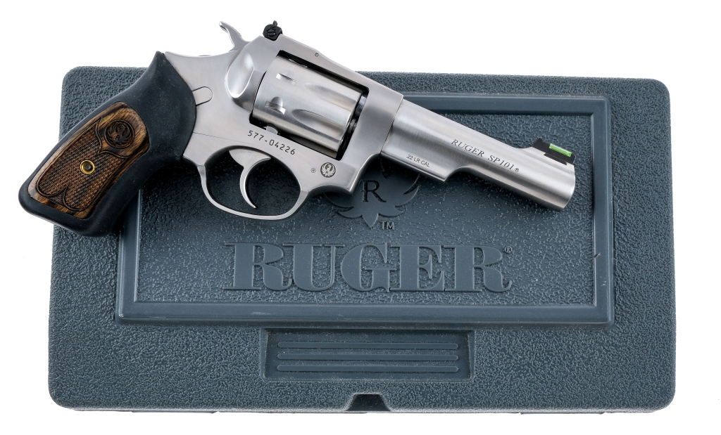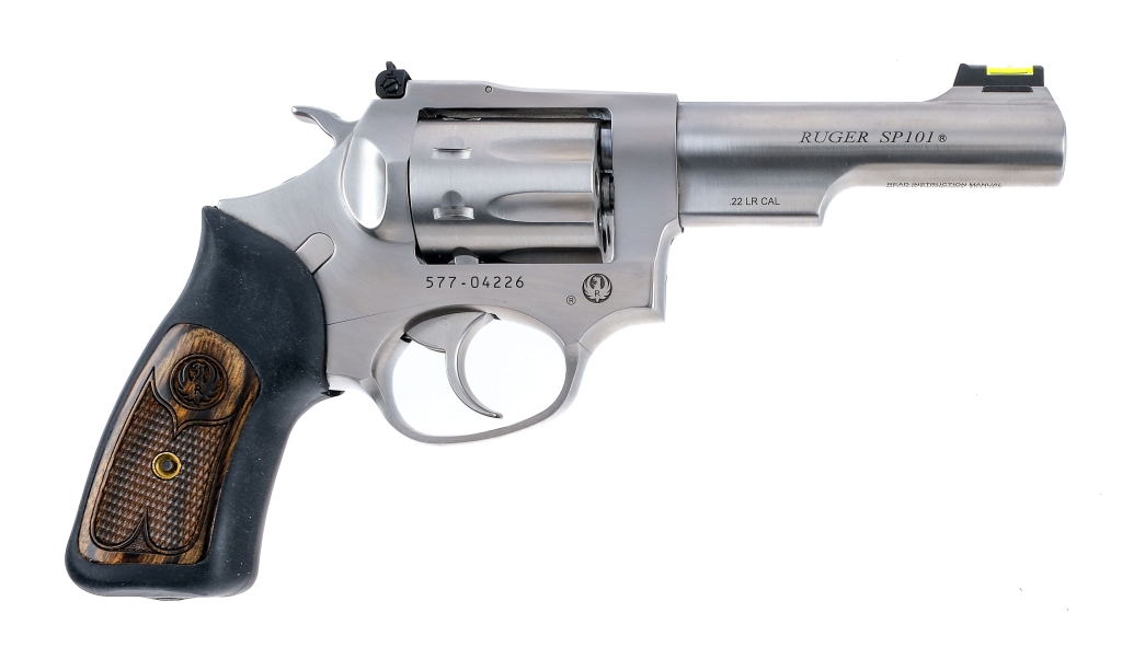 Description Ruger SP101 chambered in .22 Long Rifle with a eight-shot cylinder and a 4 1/8″ barrel. Manufactured in 2012 with serial number 577-04226. Stainless steel barrel, frame, fluted cylinder, double action trigger, and hammer. Rubber grips with checkered laminate inserts. Adjustable rear u-notch and green fiber optic front sights. Comes in its factory box with test fire casing and lock. Must ship to a FFL holder. Condition: Excellent with light cosmetic handling wear. Light cylinder turn line and internal operational wear. Bright and clean bore with strong rifling. Barrel Length: 4 1/8″ Serial: 577-04226 Manufacturer: RUGER Year: 2012 Caliber: .22 Long Rifle Model: SP101 Book# 08055