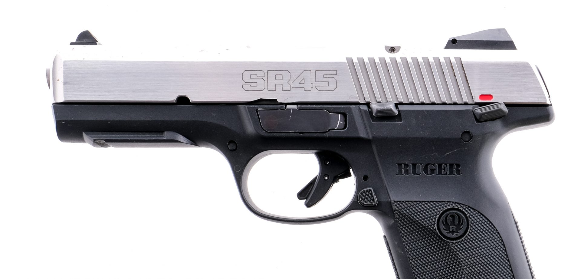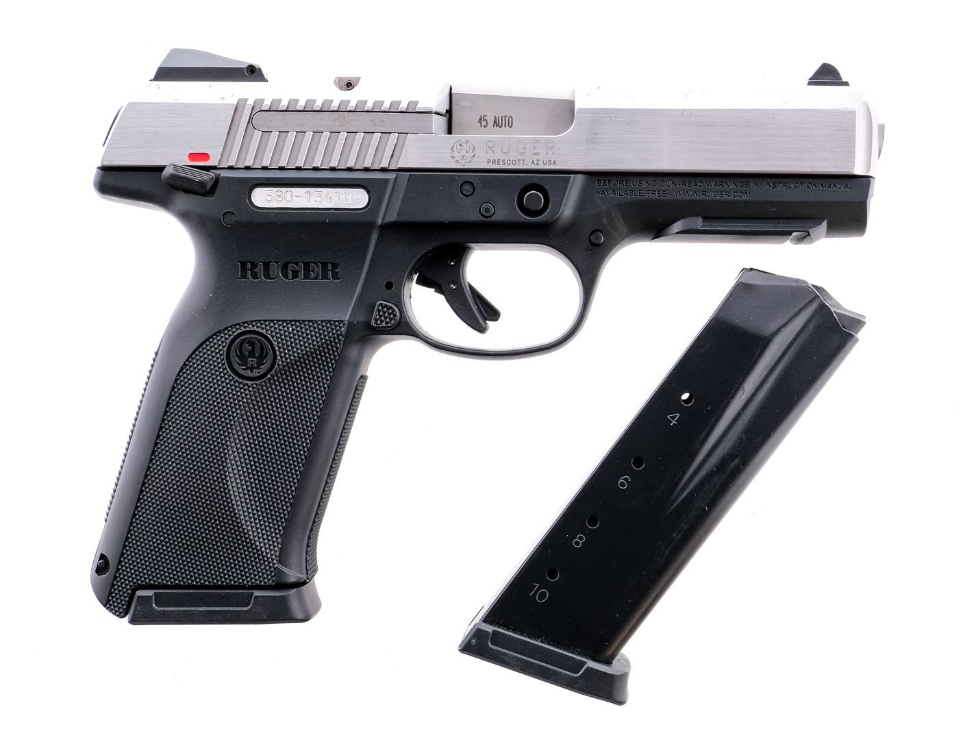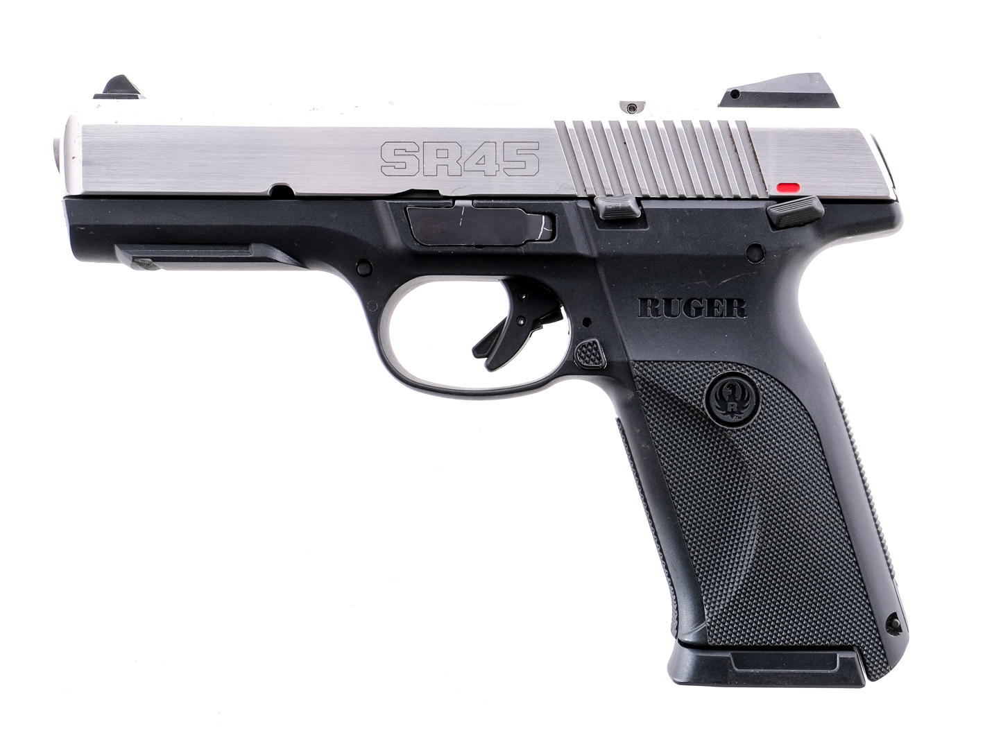 Description Ruger SR45 Two Tone in .45 caliber with two, ten round removable magazines and a 4.5″ barrel. Checkered grip on composite frame. Serrated stainless steel slide. Lower frame located ambidextrous magazine release button. Left side of frame slide release. Rear frame serrated ambidextrous safety switch. Composite trigger with depression safety. Rear adjustable and front fixed white DOT sights. Comes with two magazines. Must ship to a FFL holder. Condition: Good/Very Good with light touches of surface rust. Clean rifled bore. Barrel Length: 4.5″ Serial: 380-13410 Manufacturer: Ruger Year: 2013 Caliber: .45 ACP Model: SR45 Book# 9-855