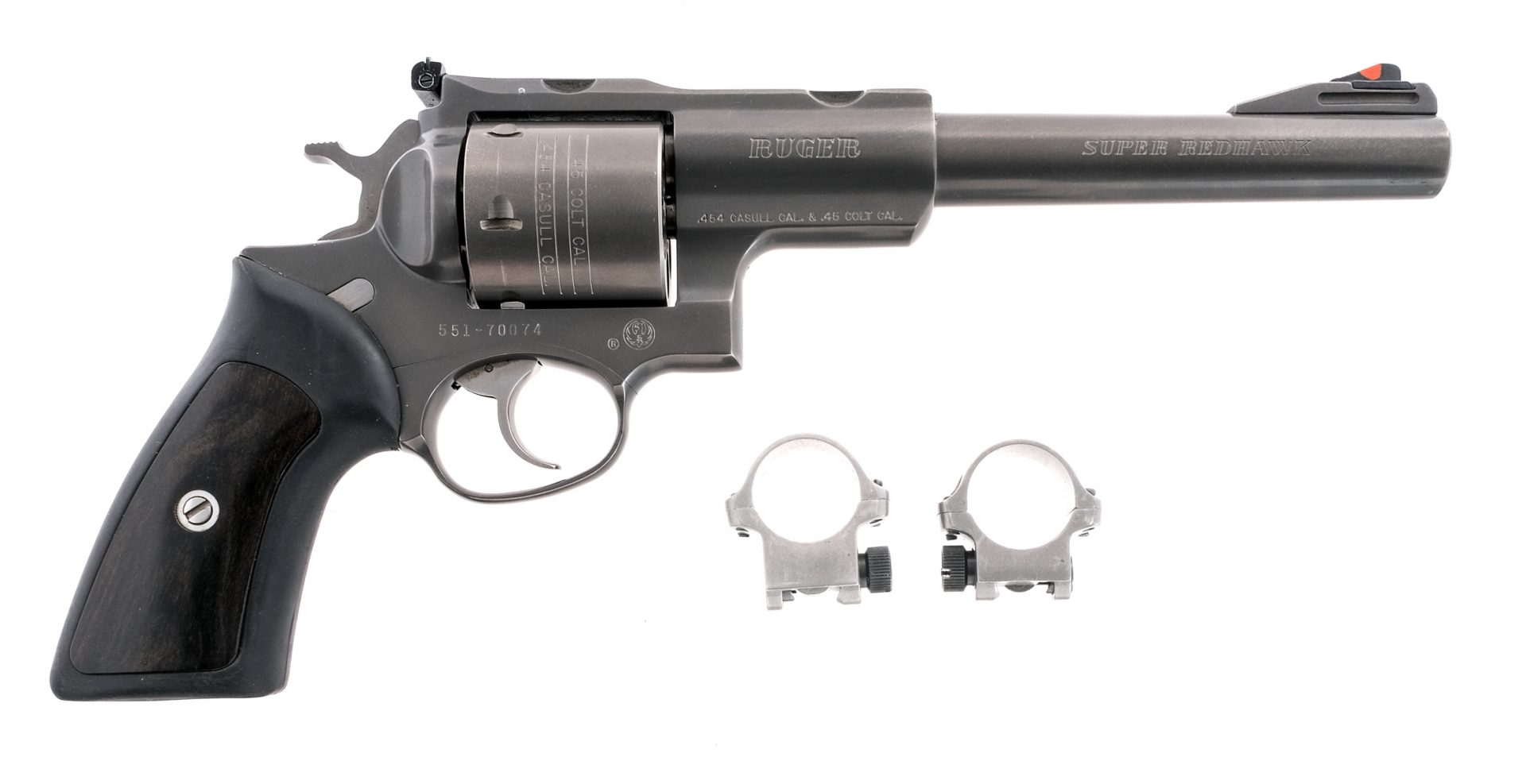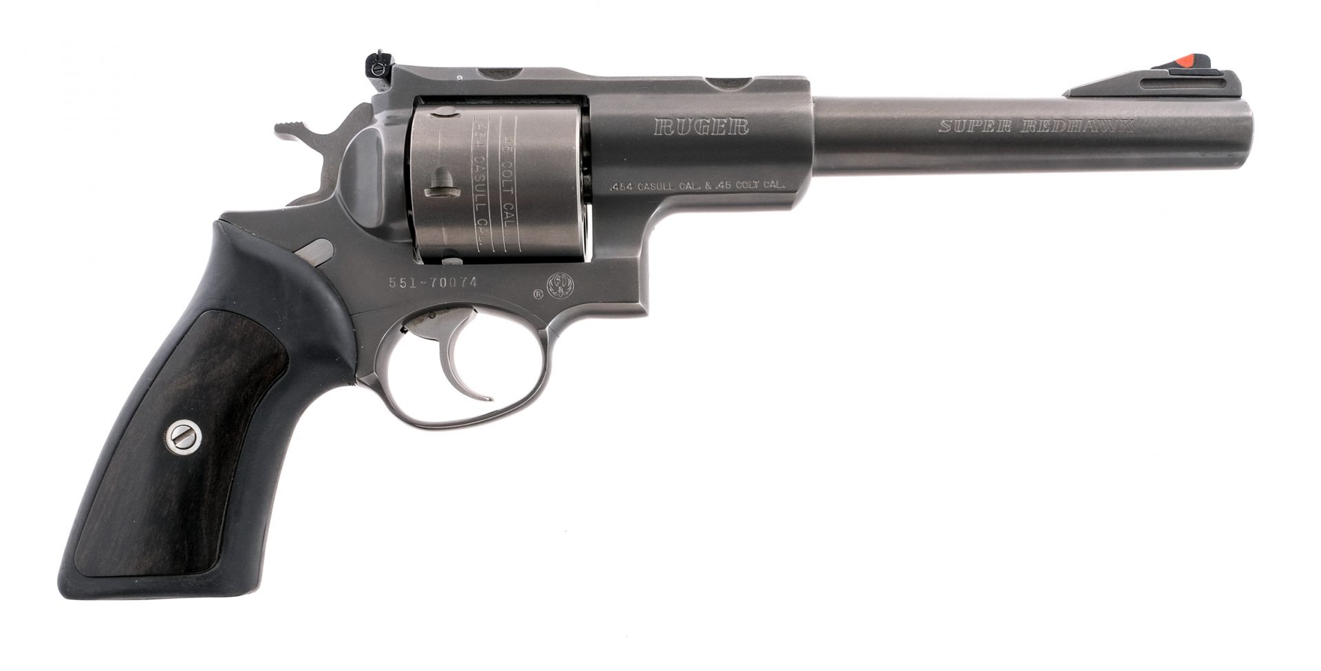 Description Ruger Super Red Hawk in .454 Casull with a six round cylinder capacity and a 7.5″ barrel. Smooth wood and rubber grip plates. Ruger Target grey finished frame, cylinder, smooth trigger, checkered hammer and barrel. Front fixed blade sight. Rear adjustable U-notch sight. Left side of frame serrated cylinder release. Comes with factory scope mounts, matching factory plastic case, and manual. Must ship to a FFL holder. Condition: Very Good/Excellent, with some operational and handling wear. Small visible turn line. One small scratch located on left side between scope mounting points. Clean rifled bore. Barrel Length: 7.5″ Serial: 551-70074 Manufacturer: Ruger Year: 2000 Caliber: .454 Casull Model: Super Redhawk Book# 01856