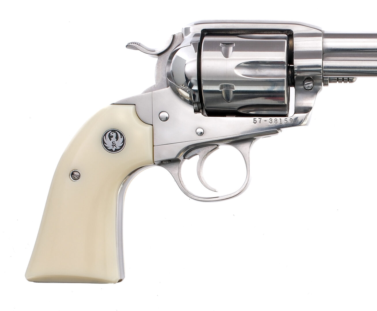 Description Ruger Vaquero Bisley chambered in .45 Colt with a six-shot capacity, and a 5.5″ barrel. Manufactured in 1999 with serial number 57-38159. Single action revolver with high-gloss stainless steel barrel, frame, and cylinder. Synthetic ivory Ruger grips. Ribbed Bisley spurred style hammer and smooth trigger. Rear trench and front blade sights. Comes in its factory Ruger hard case with matching serial number and manual. Must ship to FFL holder. Condition: Very Good/Excellent with little handling wear and a clean rifled bore. Light cylinder drag line Barrel Length: 5.5″ Serial: 57-38159 Manufacturer: RUGER Year: 1999 Caliber: .45 Colt Model: Vaquero Bisley Book# 01213