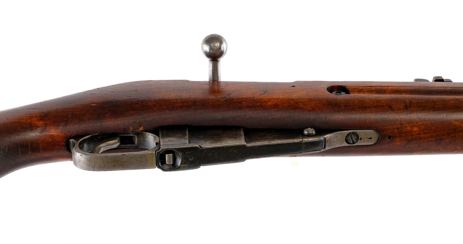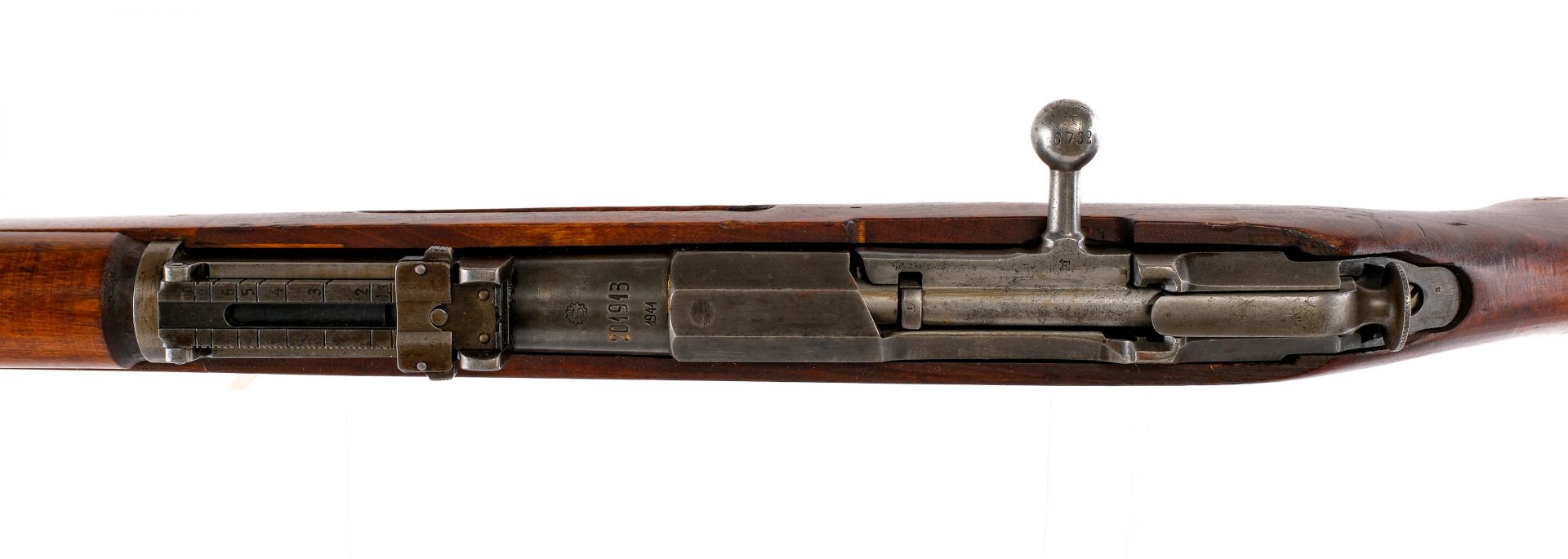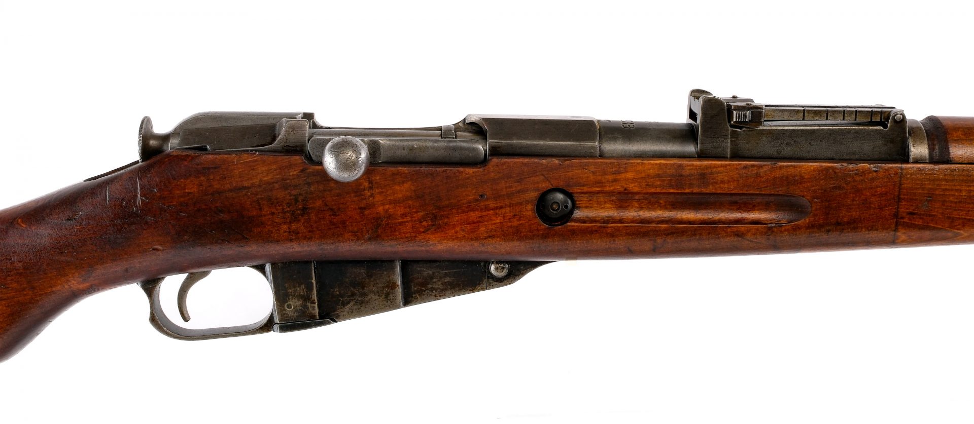 Description Sako Finnish M39 Mosin Nagant in 7.62x54mmR with a five round capacity and a 27″ barrel. Blued butt plate. Smooth wood stock and front spliced forend. Blued trigger guard, hexagon receiver and barrel. Unfinished steel trigger and bolt. Under barrel fixed bayonet lug and removable cleaning rod. Rear flip up adjustable and front adjustable blade sight. Metal loops to mount a shoulder sling. Finnish SA, marked barrel shank. Mismatched serialized parts throughout. Must ship to a C&R or FFL holder. Condition: Good with scratches, wood dings, finish wear/loss and handling wear. The rifled bore has very light rust to the grooves. Barrel Length: 27″ Serial: 201913 Manufacturer: Sako Year: 1941 Caliber: 7.62x54mmR Model: M39 Mosin Nagant Book# 04489