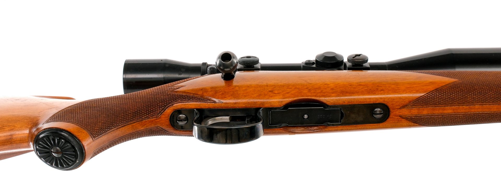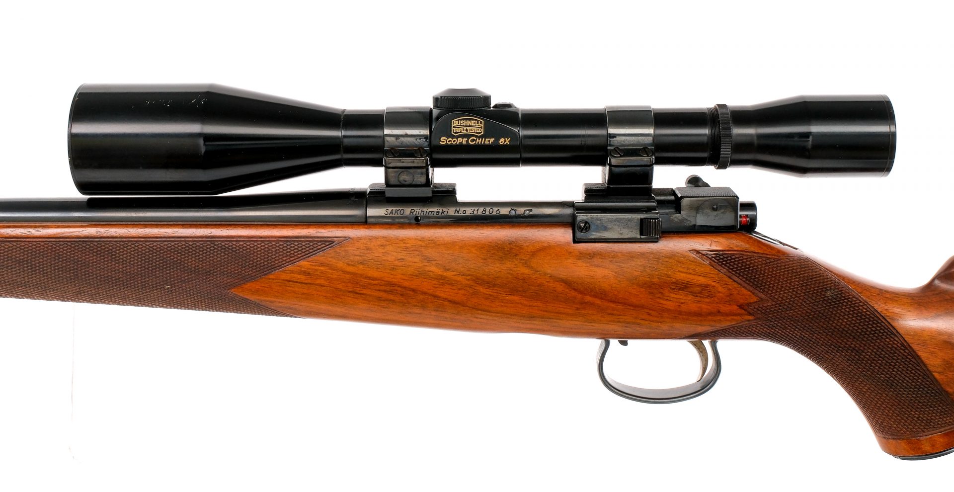 Description Sako L46 Riihimaki chambered in .222 Remington with one, four round removable magazine and a 23.5″ Bofors steel barrel. Blued barrel, receiver, bolt handle, trigger, and trigger guard. The receiver is drilled and tapped and mounted with a Bushnell Scope Chief 6x. Push to fire bolt safety. Wood stock with checkered forend, pistol grip, and serrated Sako butt plate. Front and rear sling swivels. Must ship to a FFL or C&R holder. Condition: Good/Very Good with scratches, chatter marks, and wear from normal handling and operation. Some finish loss on the the contact points. Some spots of metal oxidation on the scope rings and scope. Some scratches and dings in the wood stock. Scratches and scuffs on the butt plate. Clean bore with strong rifling. Barrel Length: 23 3/4″ Serial: 31806 Manufacturer: SAKO, LTD. Caliber: .222 Remington Model: L46 Riihimaki Book# 05133