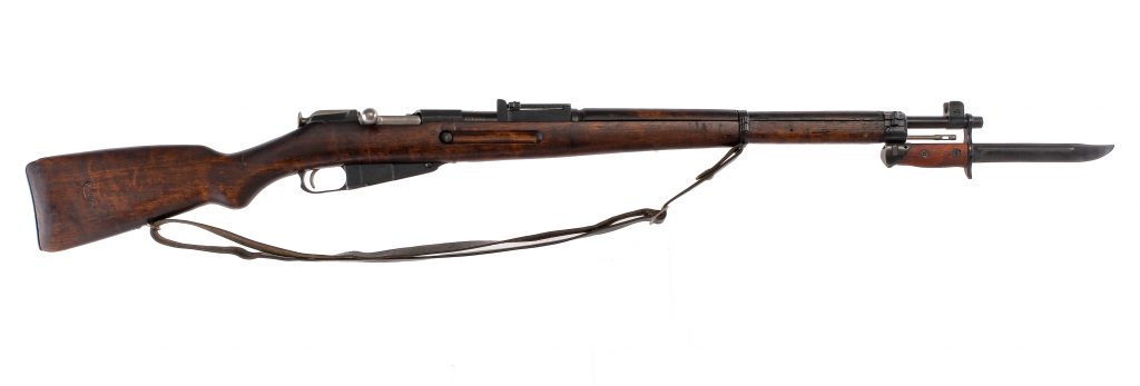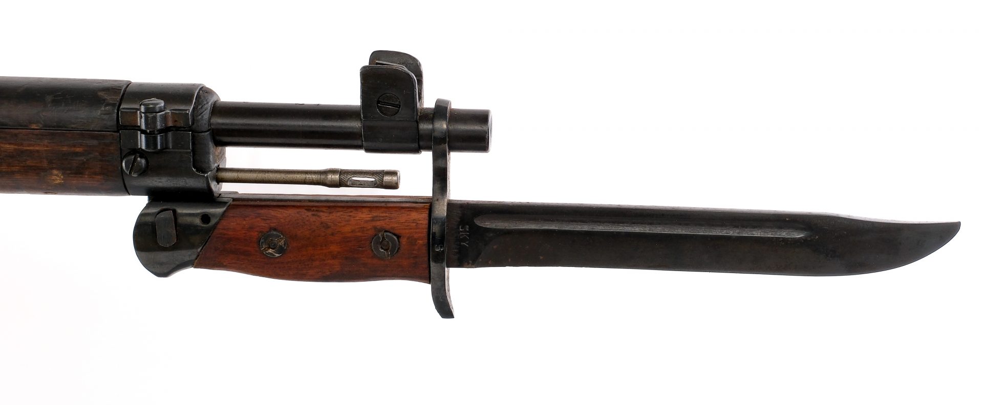 Description Finnish Sako M39 SKY (Finnish Civil Guard Rifle) IN 7.62x54mmR with a five round capacity and a 27″ barrel. Import marked on the muzzle end of barrel: C.A.I. ST ALB VT. Blued butt plate. Smooth wood stock and front finger spliced forend. Blued trigger guard, hexagon receiver and barrel. Unfinished steel trigger and bolt. Under barrel fixed bayonet lug and removable cleaning rod. Rear flip up adjustable and front adjustable blade sight. Mounted with a unbranded leather shoulder sling. Sako proof wood stock. SKY marked barrel shank for The Civil Guard and dated 1942. Comes with SKY, Civil Guard marked bayonet 7.25″ blade and leather belt sheath. Matching serial number on the barrel, receiver and bolt. Must ship to a C&R or FFL holder. Condition: Good/Very Good with light scratches, wood dings and handling wear. Touches of rust on the bayonet. Clean rifled bore. Barrel Length: 27″ Serial: 500402 Manufacturer: Sako Year: 1942 Caliber: 7.62x54mmR Model: M39 Mosin Nagant Book# 04477