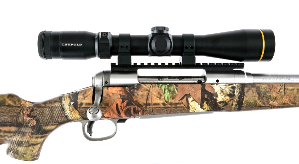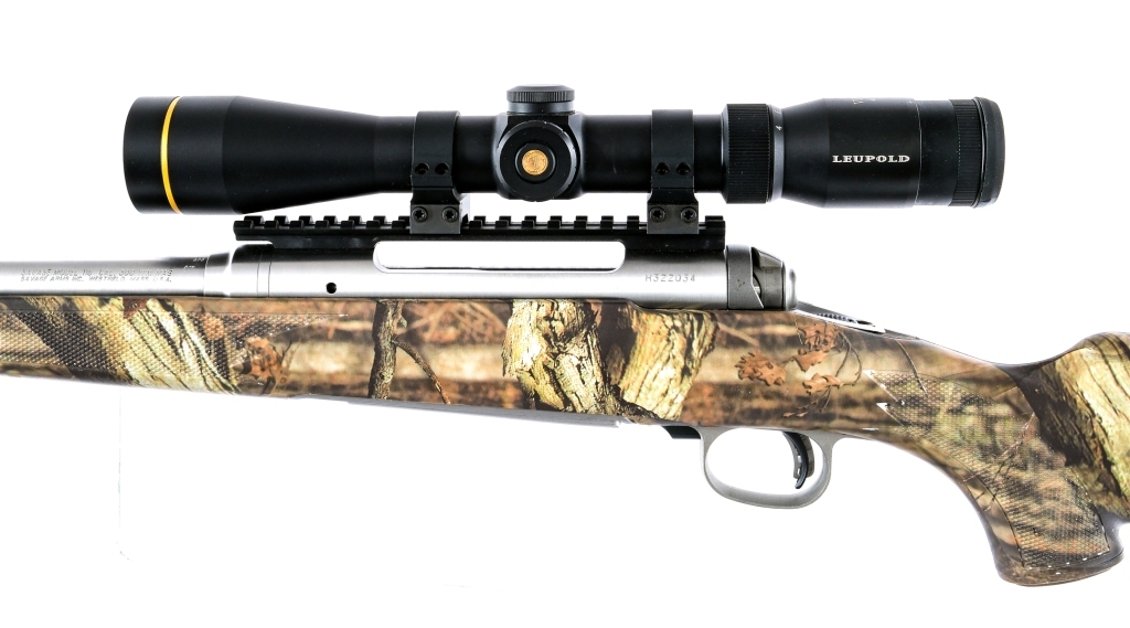 Description Savage Model 116 Bear Hunter in .300 Win Magnum with a three round capacity and a 23.5″ ported fluted barrel. The ported muzzle break has the ability to be shut off with a simple twist, closing the holes. Rubber butt pad. Camo printed checkered composite stock and front forend. Blued trigger with depression safety. Polished stainless steel receiver and barrel. Jeweled bolt body. Rear receiver tang safety. Top of receiver mounted Leupold VX-R scope 4-12×40 with clear glass and a duplex reticle. Mounted with a unbranded shoulder sling. Must ship to a FFL holder. Condition: Very Good with light scratches, dings on the muzzle end and handling wear. Clean rifled bore. Barrel Length: 23.5 Serial: H322034 Manufacturer: Savage Caliber: .300 Winchester Magnum Model: 116 Book# 07370