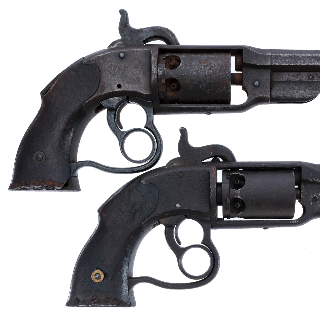 Description This lot is for two Savage Model 1861 Navy percussion revolvers in .36 caliber with a six round capacity and a 7″ octagon barrel. Produced specifically for the U.S. Civil War between 1861 and 1862. The 1861 Navy featured a unique cocking mechanism ( Proto Double Action ) where the shooter’s middle finger was used to draw back the lever just below the trigger to cock the hammer and rotate the cylinder eliminating use of the thumb and keeping the muzzle pointed at the target. Finish worn frames, triggers, hammers, cocking mechanisms, cylinders and barrels. Front fixed brass post sights. These examples are two of only 20,000 guns produced between 1861 and 1862. The top strap is marked “SAVAGE R.F.A. Co MIDDLETOWN. CT / H.S.NORTH PATENTED JUNE 17 1856 / JANUARY 10 1859 MAY 15 1860”. Antique, No FFL required and ships to MOST buyers homes. Condition: Antique, Poor with scratches, finish wear/loss, rust/pitting, wood grip damage and one pistol is missing its ramrod and rear backstrap screw. The one missing the ramrod does not function. The rifled bores have rust and pitting. SOLD AS-IS. Barrel Length: 7″ 7″ Serial: 610 8008 Manufacturer: Savage R.F.A. Co Caliber: .36 Model: 1861 Navy Year-Range 1861-1862
