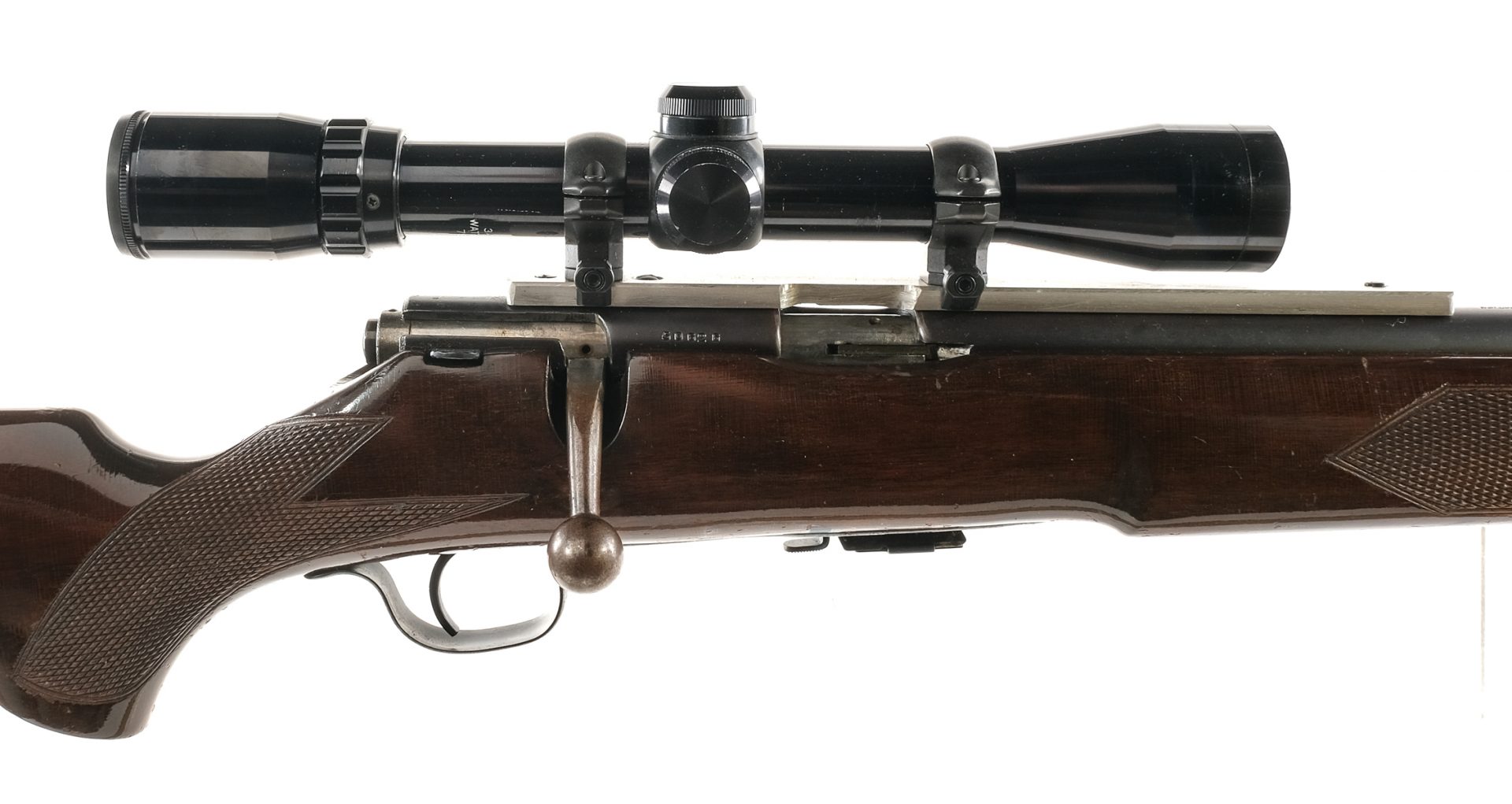Description Savage Model 19 NRA in .22 Long Rifle with one, five round removable magazine and a 25″ barrel. Serrated metal butt plate. Checkered wood stock and front forend. Blued trigger guard, trigger, receiver and barrel. Magwell located serrated magazine release. Rear right side of receiver serrated safety switch. Fixed sights have been removed. Aftermarket aluminum optics rail. Mounted with a Bushnell Sportview scope 3-9×32 waterproof with clear glass and a duplex reticle. Comes with a leather shoulder sling. Must ship to a C&R or FFL holder. Condition: Good with scratches, wood dings, finish wear, missing front sight. Clean rifled bore. Barrel Length: 25″ Serial: 50626 Manufacturer: Savage Caliber: .22 LR Model: 19 NRA Year-Range 1919-1930 Book# 473