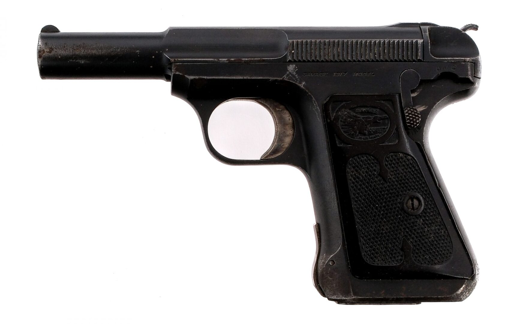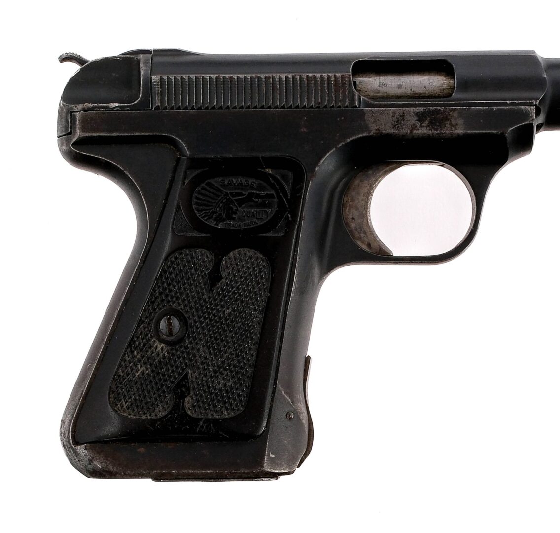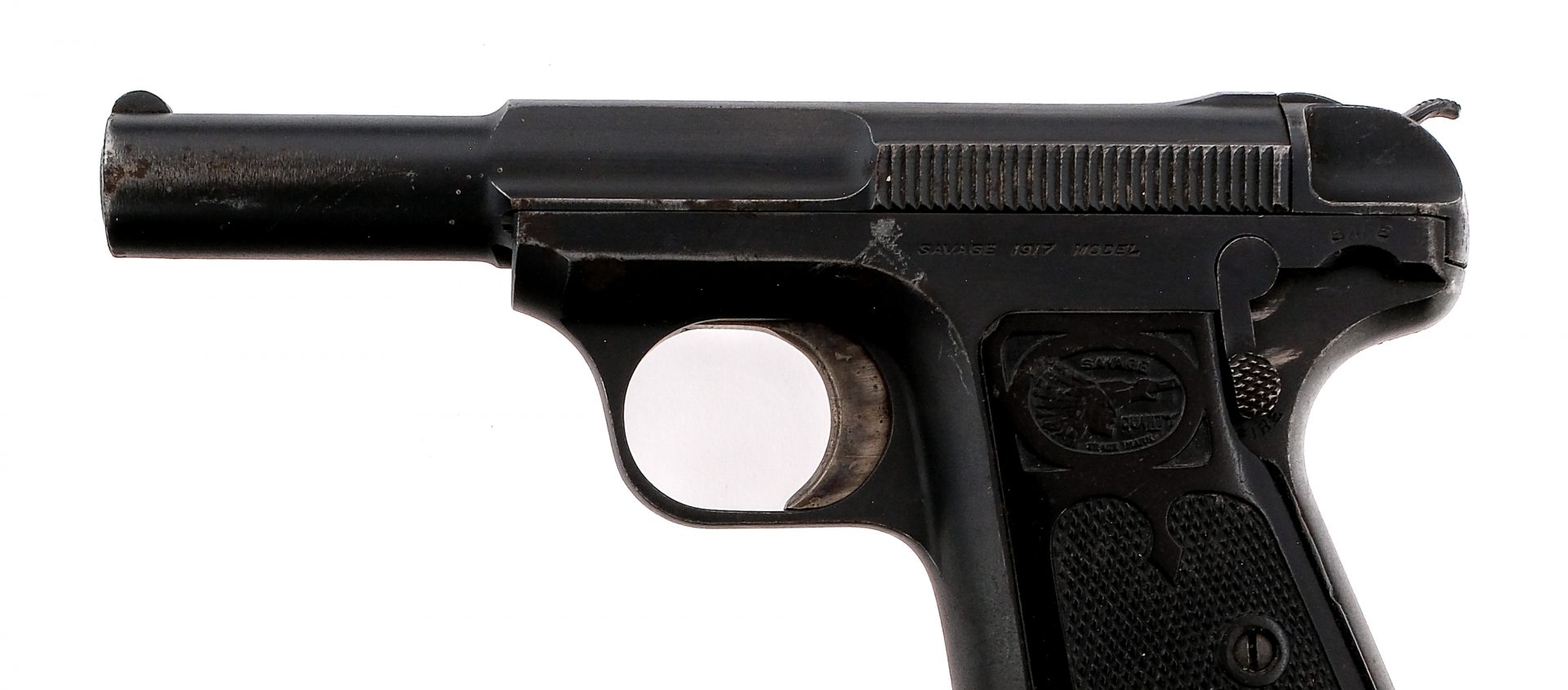 Description Savage 1917 chambered in 7.65mm (.32 ACP) with one, ten round removable magazine and a 3.75″ barrel. Blued steel frame with checkered polymer grips. Front strap magazine release and frame mounted manual thumb safety. Single action trigger and protected hammer. Blued barrel and serrated slide. Fixed front blade and rear notch iron sights. Must ship to a FFL or C&R holder. Condition: Good with scratches, sharp edge wear, and general handling wear on the finish. Spots and speckling of metal oxidation throughout. Clean rifled bore. Barrel Length: 3.75″ Serial: 252131 Manufacturer: SAVAGE ARMS, INC. Caliber: .32 ACP Model: 1917 Year-Range 1917-1928 Book# 04531