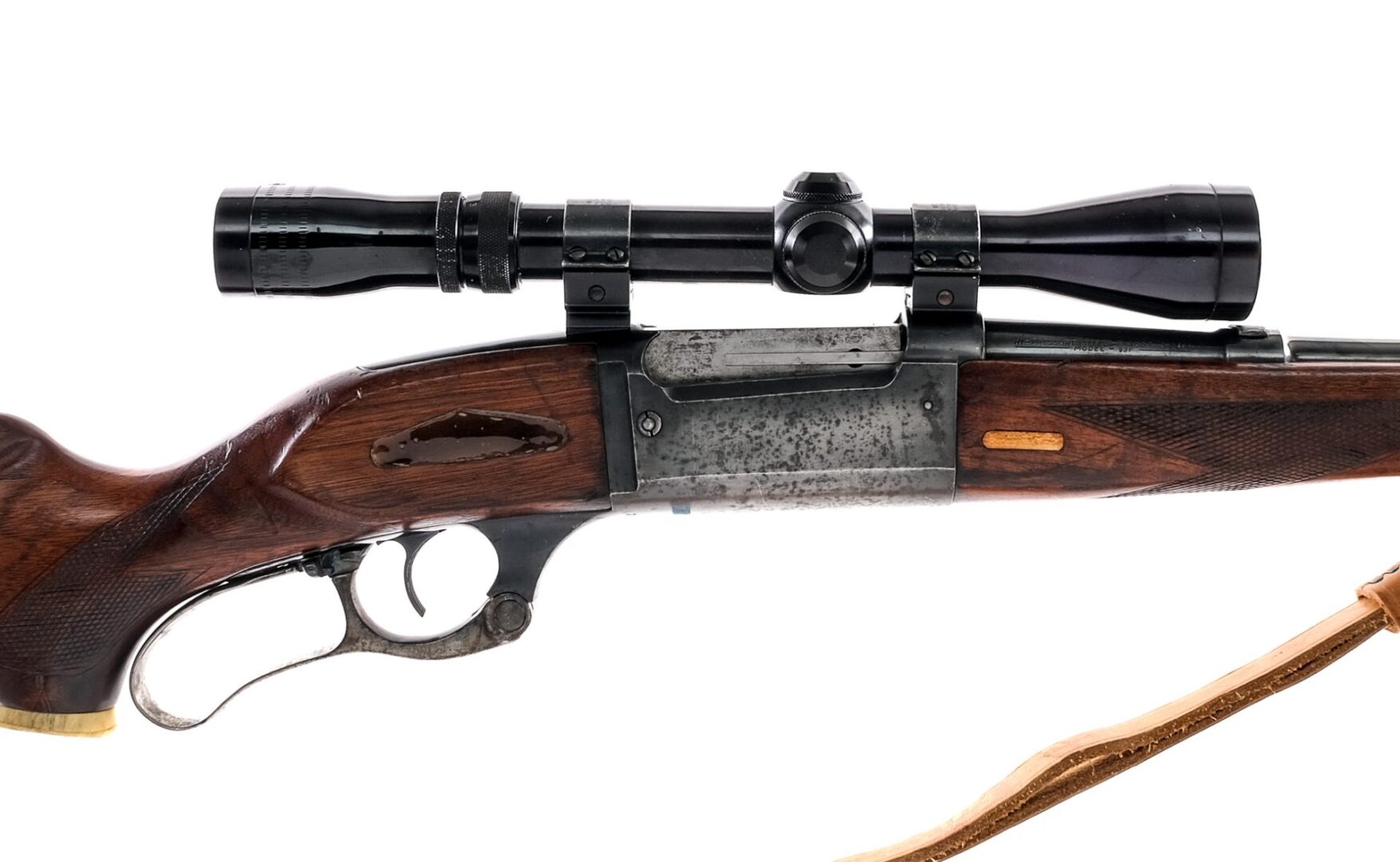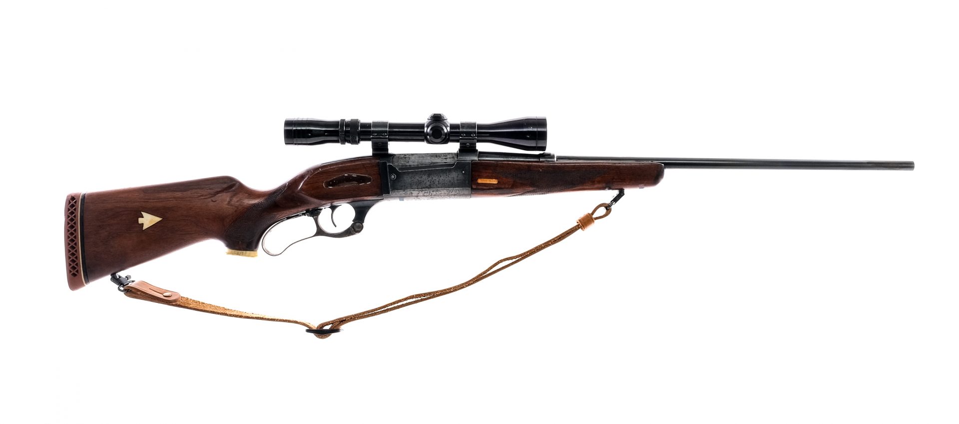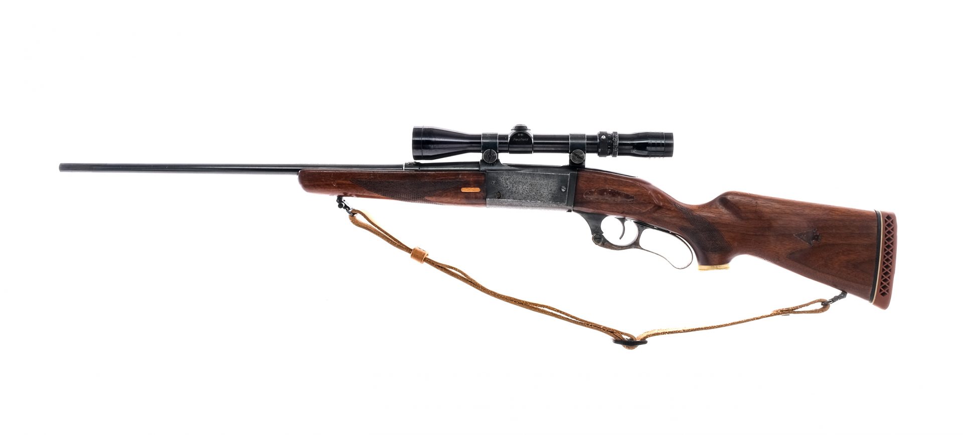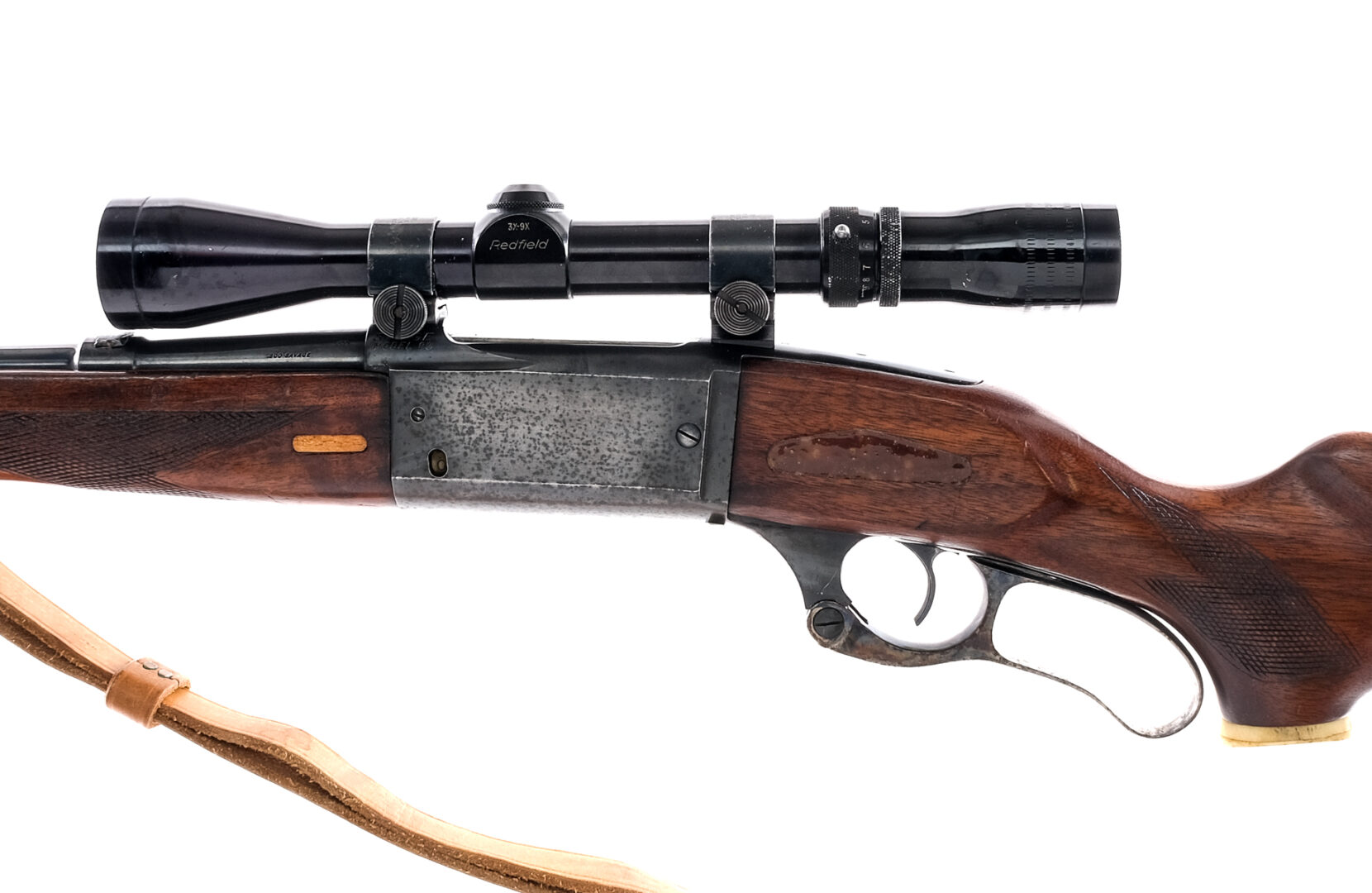 Description Savage Model 99F in .300 Savage with a five round capacity and a 22″ barrel. Pachmayr rubber butt pad. Checkered wood stock and front forend. Case colored hand lever. Blued serrated trigger, receiver and barrel. No fixed sights. Mounted with a Redfield 3x-9x scope with clear glass and a duplex reticle. Comes with a Savage branded leather shoulder sling. White composite or bone inlays throughout wood. Inlays that are gone have been filled with resin. Must ship to a C&R or FFL holder. Condition: Good with scratches, finish wear/loss and aftermarket wood inlays. Clean rifled bore. Barrel Length: 22″ Serial: 765142 Manufacturer: Savage Year: 1955 Caliber: .300 Savage Model: 99F Book# 00879