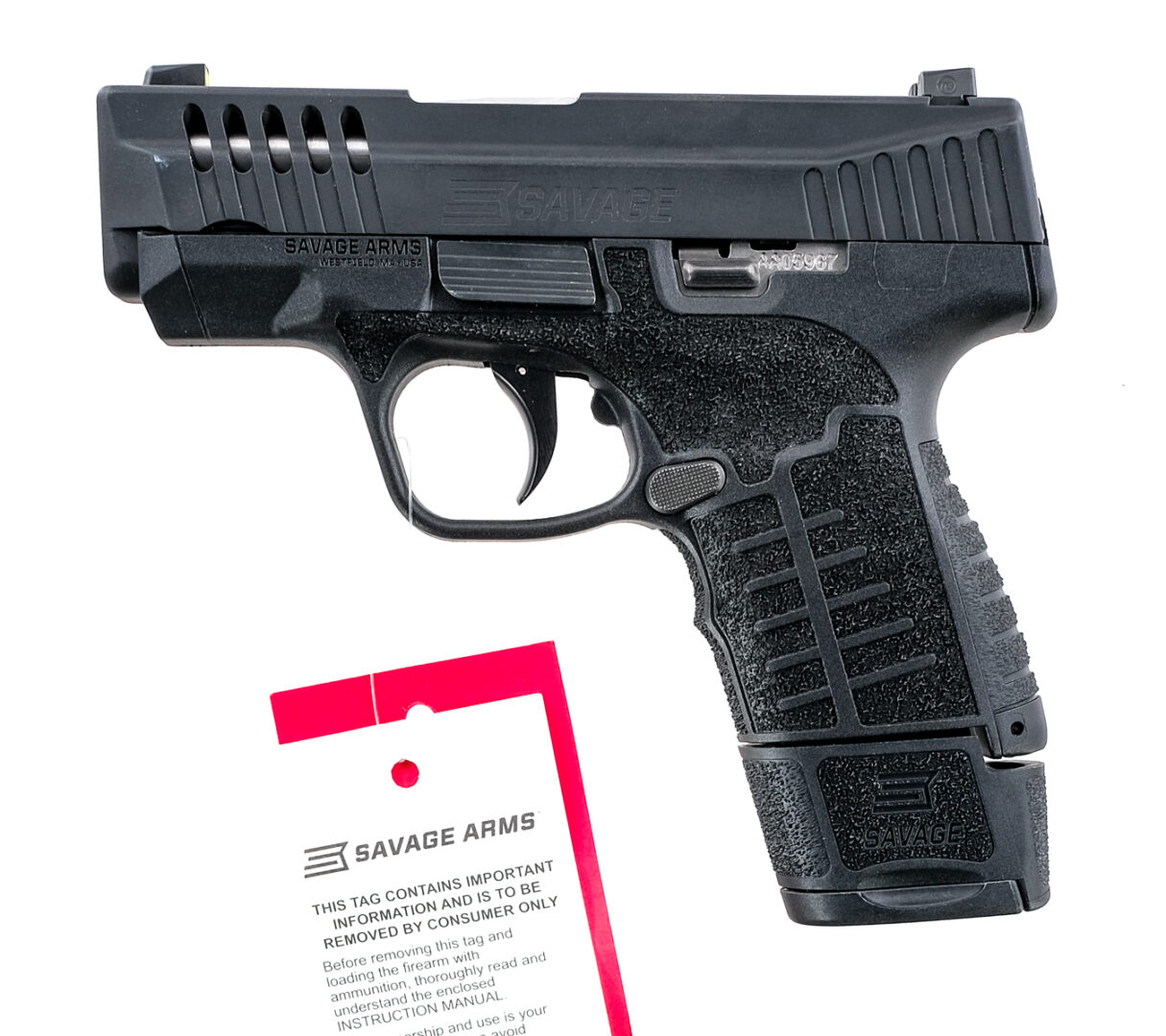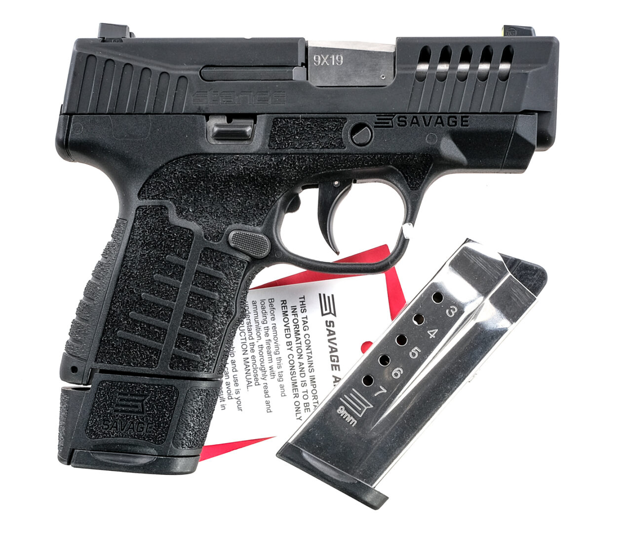 Description Savage Stance in 9mm with one, seven round and one, ten round removable magazine with a 3″ barrel. Textured composite grip on frame. Blued metal trigger and serrated ported slide. Lower frame ambidextrous checkered magazine release. Rear frame ambidextrous slide release. Left side of frame serrated slide release. Front and rear fixed Tru Glow sights. Comes in its factory box with matching serial number, instruction manual, two magazines and gun lock. Must ship to a FFL holder. Condition: New Dealers Stock. Clean rifled bore. Barrel Length: 3″ Serial: AA05967 Manufacturer: Savage Caliber: 9mm Model: Stance Book# 647