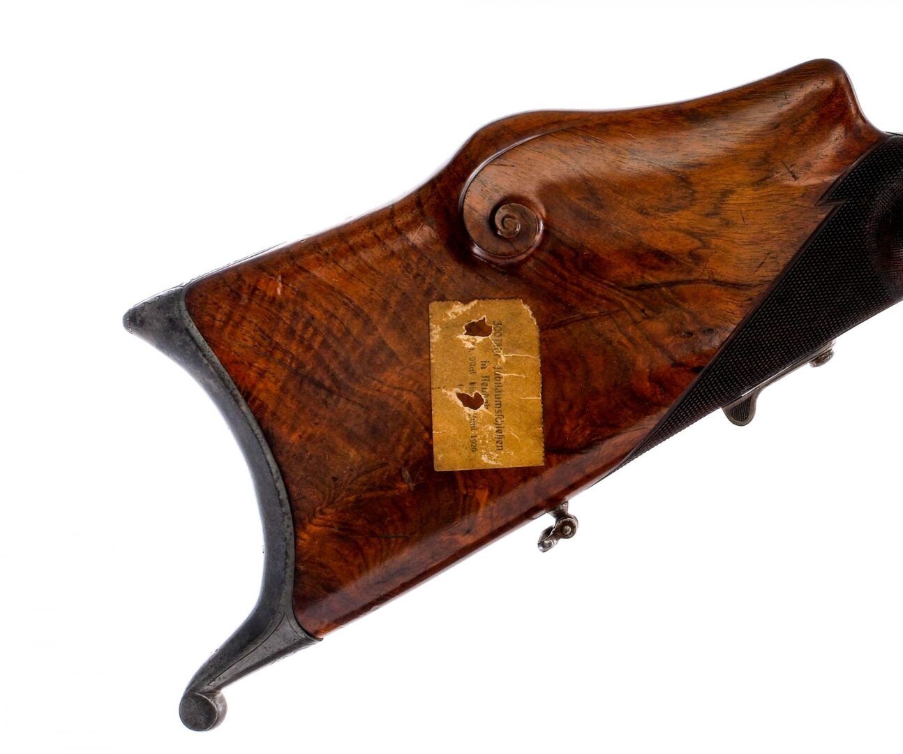 Description UPDATE: C&R or FFL Transfer only and updated information in text. Caliber is 8.15x46R. Sempert & Krieghoff Martini action Schuetzen rifle chambered likely in 9.3x72mm. This example features 29″ octagonal barrel marked “SEMPERT & KRIEGHOFF / SUHL” with claw type scope mount, windage adjustable semi-globe front sight, “BUG” proofs, “172/28” / “S” on the bottom of the barrel, “4235” stamped on the barrel, front of the frame, hand lever and butt plate, adjustable rear peep mounted on integral base, adjustable double set triggers, an extended finger groove lever, a Tyrolean style relief carved buttstock, sling swivels, and a single hook Swiss style butt plate. The barrel has engraved dots at the muzzle. The frame has a man in Renaissance attire with a rifle amidst Germanic scroll and floral and a Cherub holding a target. Right side of stock has tag stuck to wood that loosely translates to: 300 Anniversary 1926. Anchor proof on butt plate. Must ship to a C&R or FFL holder. Condition: Finish wear and scattered and light marks from handling. There is some patches of light oxidation on the receiver which displays crisp engraving and aged patina. The wood stock has a small crack at the base of the receiver tang, left side. The barrel has scattered freckling and some very light surface pitting. The bore is bright with visible rifling and some light corrosion towards the breach. The set trigger is finicky and may need cleaning or adjustment. The cleaning rod is missing. The rifled bore has very light touch of rust with strong visible rifling. Barrel Length: 29″ Serial: 4235 Manufacturer: Sempert & Krieghoff Year: Unknown Caliber: 9.3×72 Model: Martini