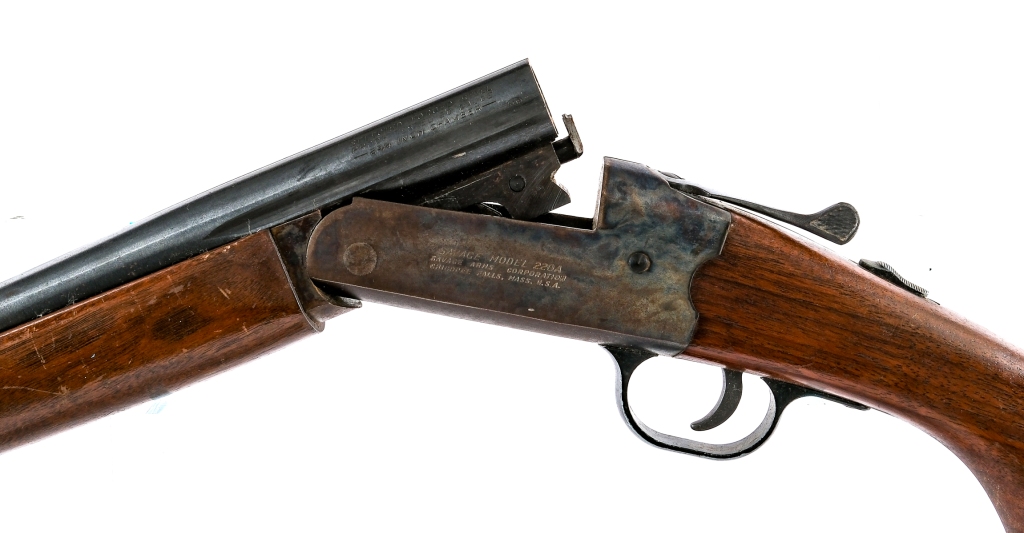 Description This lot is for two shotguns. Lefever Arms side by side shotgun in 12 gauge with a two round capacity and a 30″ barrel. Checkered wood stock and front forend. Double trigger, blued box lock receiver and barrel. Rear receiver tang slide button safety Front metal fixed bead sight. Savage Arms Model 220A in 20 gauge with a single round capacity and a 28″ barrel. Smooth wood stock and front forend. Case colored receiver and blued barrel. Rear receiver tang slide button safety. Front fixed metal bead sight. Must ship to a C&R or FFL holder. Condition: Poor with rust, scratches, finish wear/loss and handling wear. The Savage has spots of rust to the smooth bore. The Lefever has tiny touches of rust to the rifled bore. SOLD AS-IS. Barrel Length: 30″ 28″ Serial: 120396 NVSN Manufacturer: Lefever Arms Savage Arms Gauge: 12 20 Model: SxS Shotgun 220A Book# 07391 07392