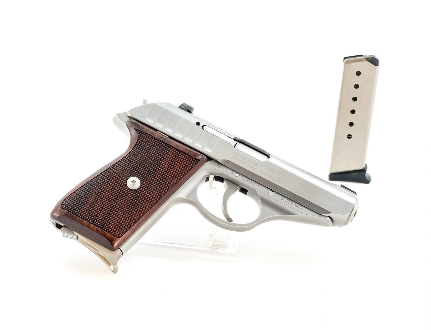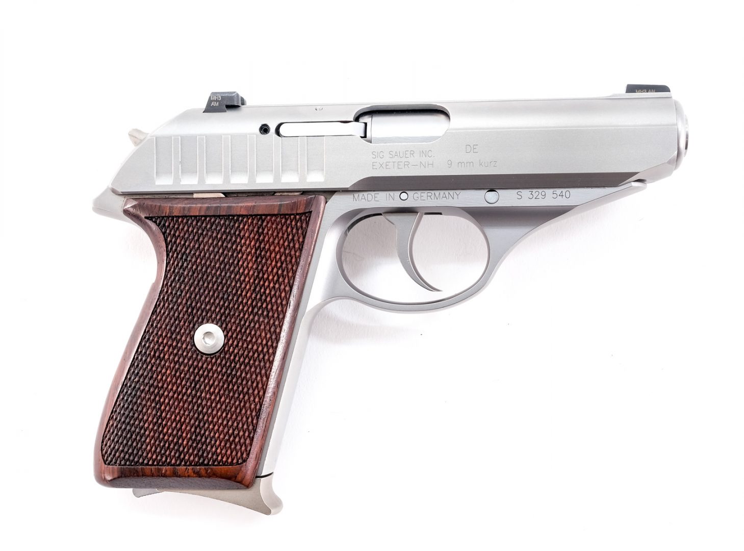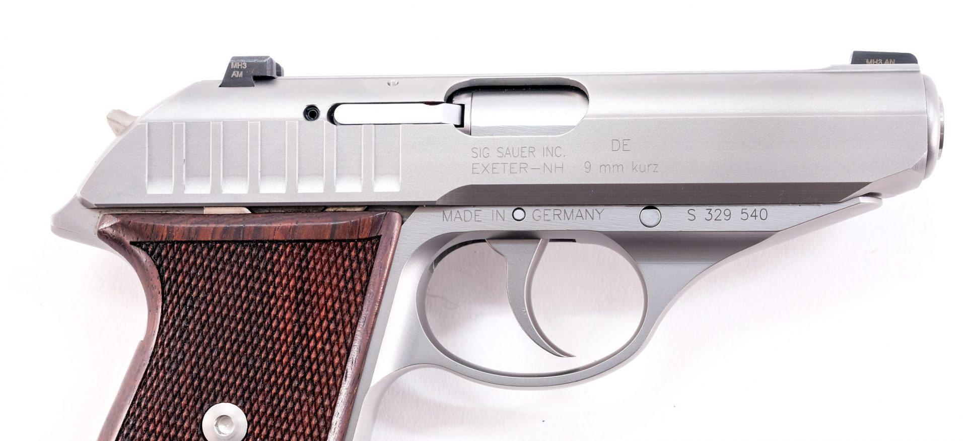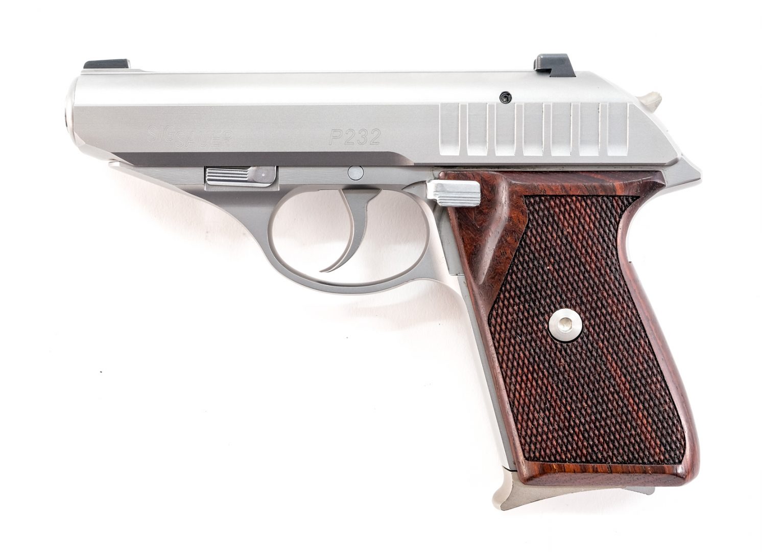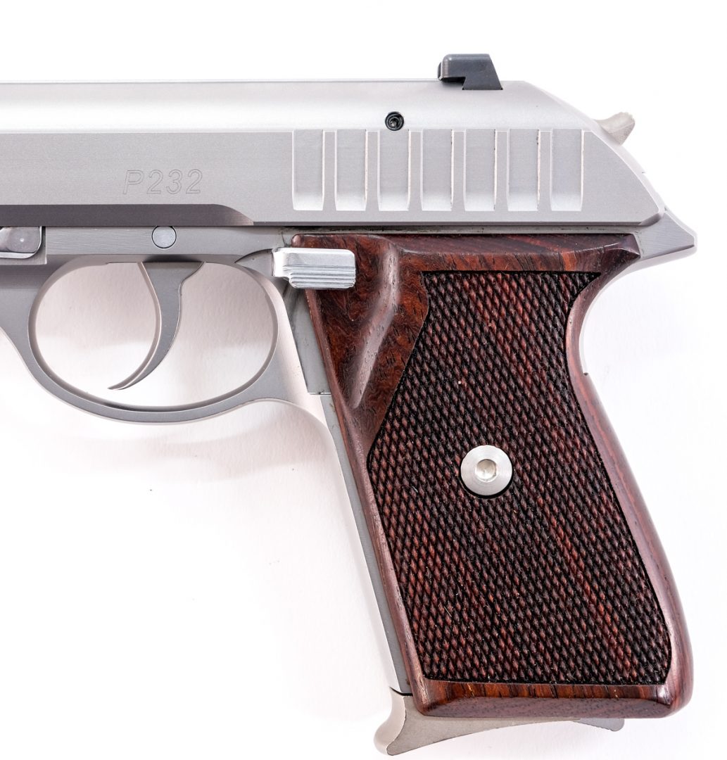 Sig Sauer model P232 in 9mm Kurz which is .380 with two, seven round removable magazines and a 3 1/2″ barrel. Metal matte finished frame and solid checkered wood grip plates with aftermarket “Extreme Hogue” set screws, comes with original screws. Metal matte finished slide with 3-dot fixed sights. Left side of frame de-cocking lever. Comes with two, seven round magazines, serial numbers matching factory hard case, instruction manual and aftermarket grip plate screws. This double action semi-automatic pistol must ship to a FFL holder.