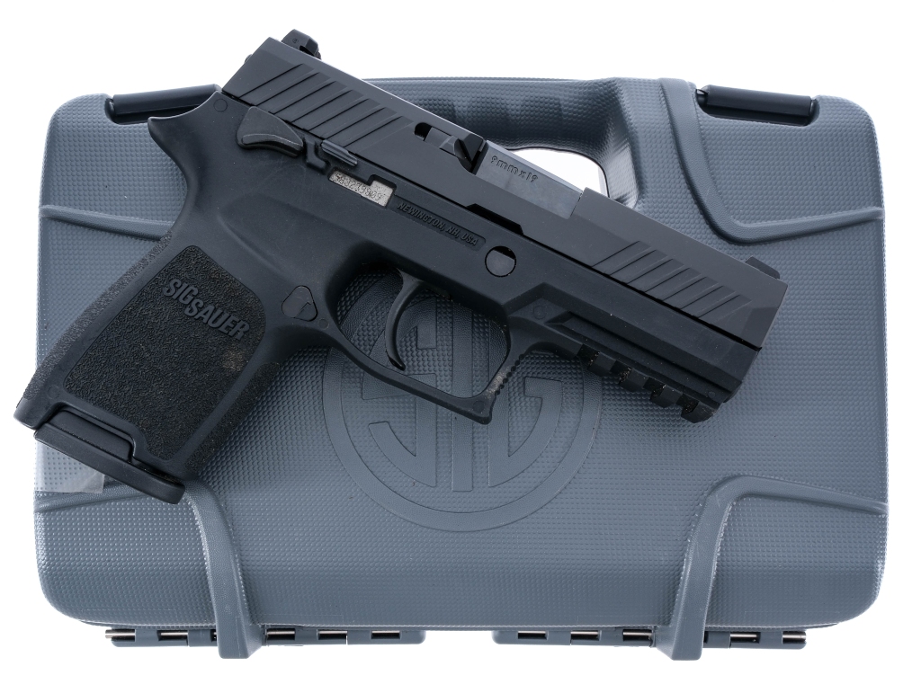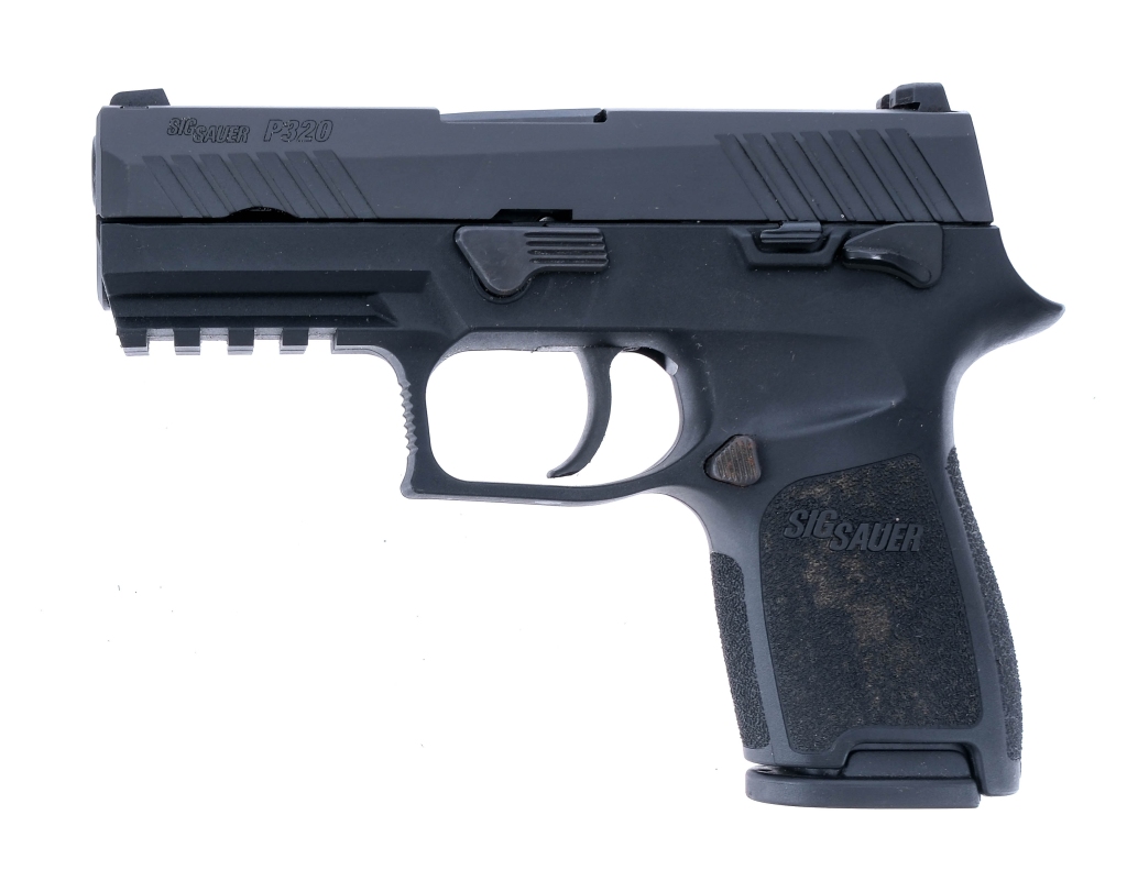 Description Sig Sauer P329C Compact chambered in 9mm with one, ten round removable magazine and a 3.9″ carbon steel barrel. Black textured polymer frame with under barrel accessories rail. Striker fired standard curved trigger. Push button magazine release and ambidextrous slide stop. Frame mounted manual thumb safety. White three-dot contrast sights. Comes in its factory box with factory paperwork and one magazine. Must ship to a FFL holder. Condition: Good/Very good with scratches and cosmetic handling wear. Internal wear from normal operation. Spots of metal oxidation on the magazine catch, rear sight, and slide. Bright and clean rifled bore. Barrel Length: 3.9″ Serial: 58J239809 Manufacturer: SIG SAUER Caliber: 9x19mm Parabellum Model: P320C Book# 07657