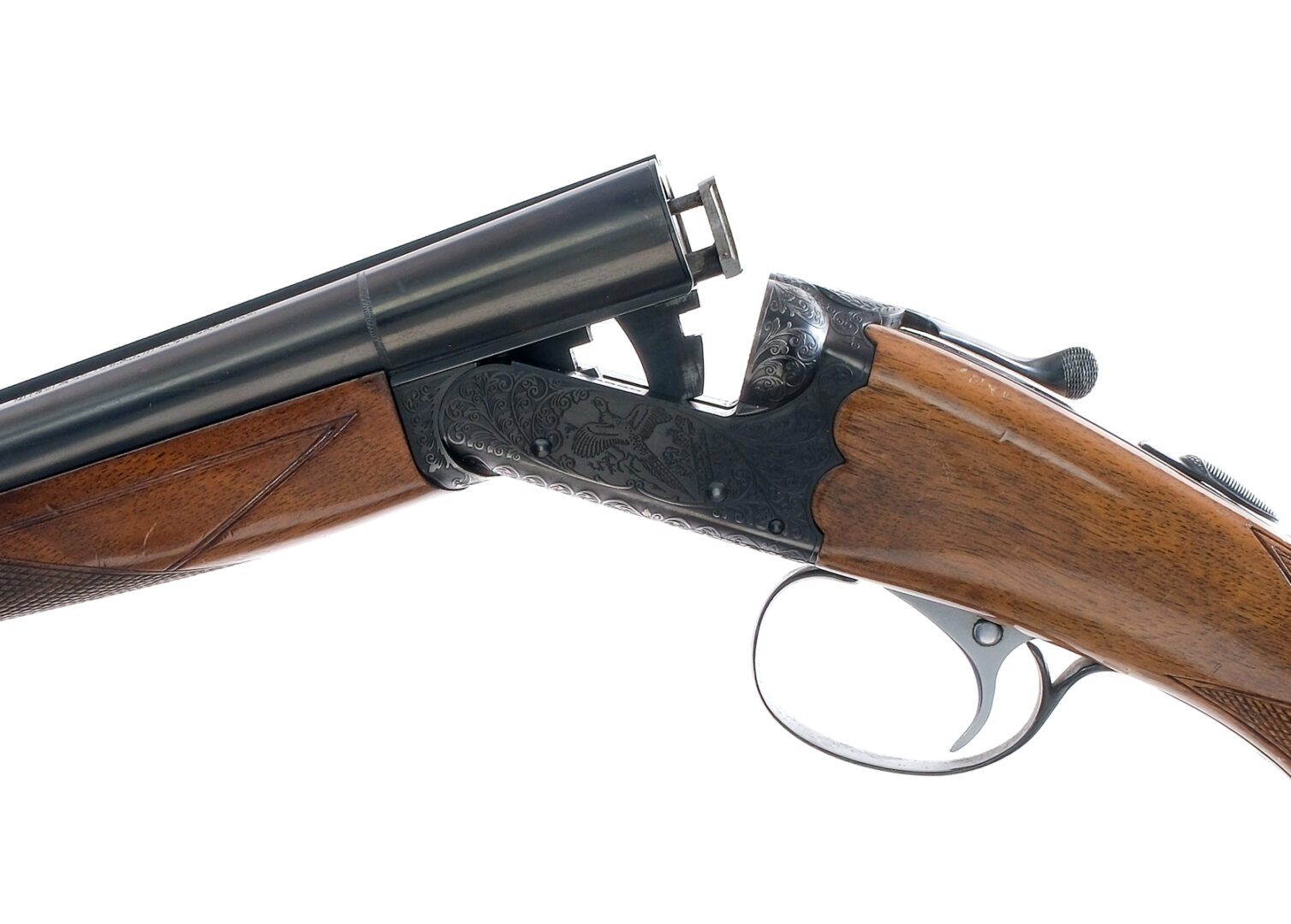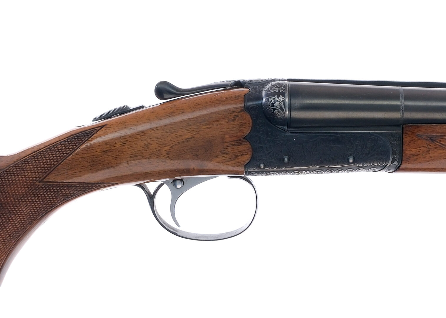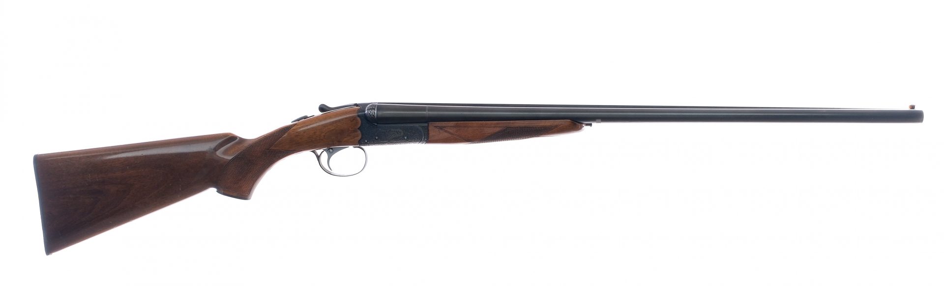 Description SKB model 100 chambered in 20 gauge for 3″ shells with 25″ side by side double barrels. The left bore has a fixed MOD choke and the right bore has a fixed IMP choke. Manufactured in Japan by SKB and imported by Mitsui and Co. Blued barrels, lever, engraved lock, tang, and trigger guard. Automatic tang safety. Stainless trigger with barrel selector button. Checkered wood forend and pistol grip stock with a checkered SKB butt plate. Orange front shotgun sight. Must ship to a FFL holder. Condition: Good/Very Good with scratches, scuffs, and finish wear from handling. Spots of finish loss near the muzzle and on the engraving. Speckling of metal oxidation on the barrel and trigger guard, some spots of metal oxidation on the water table. Scratches, scuffs, and dings on the wood. Short thin crack just behind the tang. Bright clean smooth bores. Barrel Length: 25″ Serial: S6123890 Manufacturer: SKB SHOTGUNS Gauge: 20 Ga. Model: 100 Book# 02804