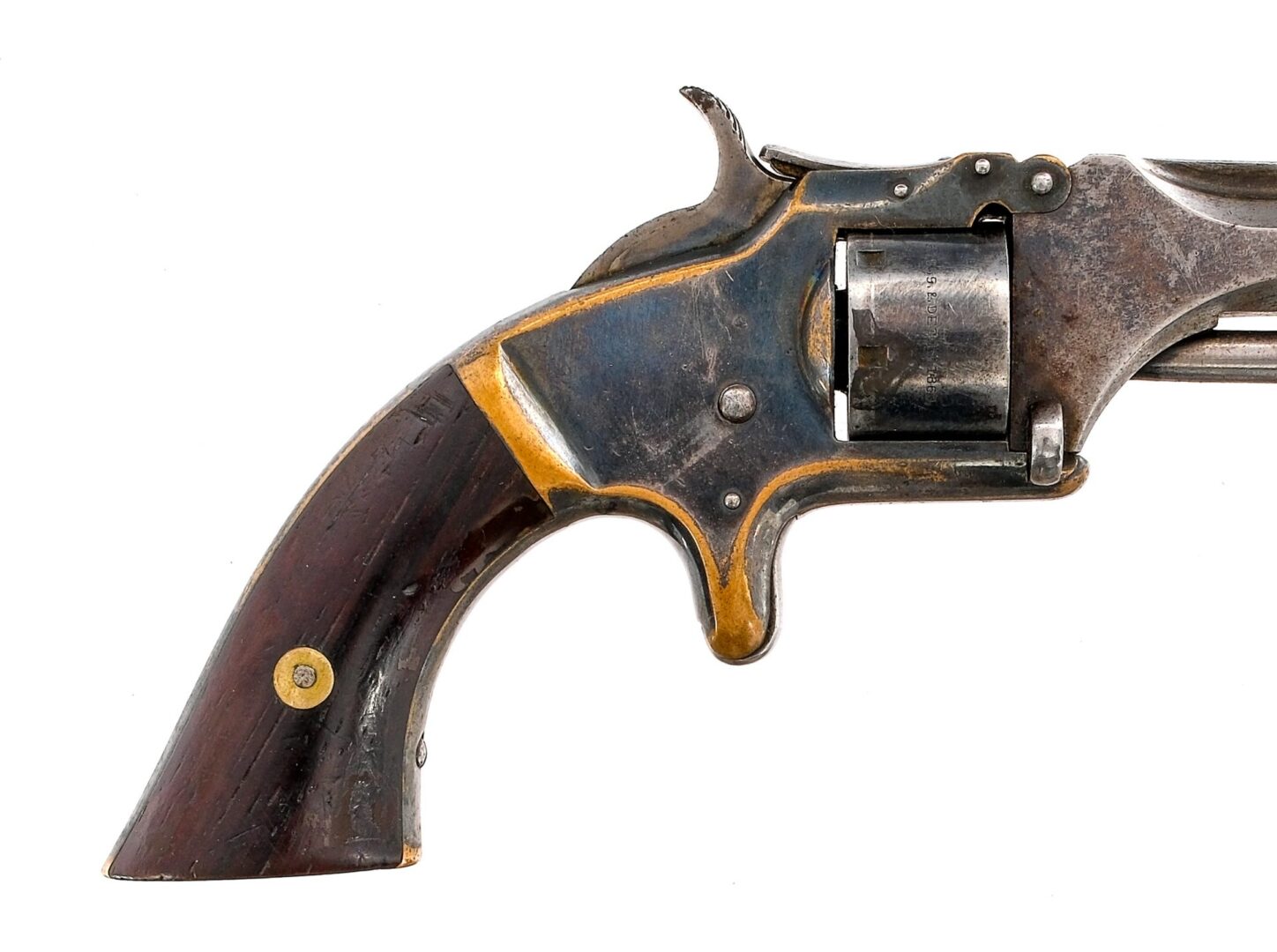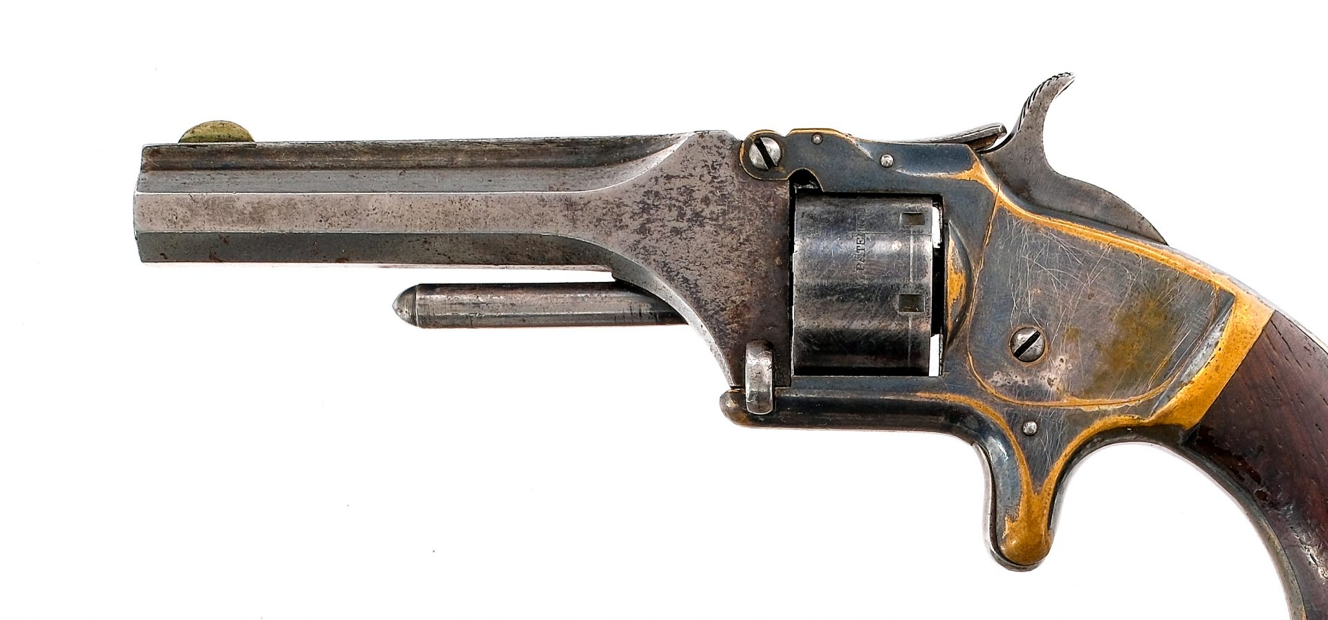Description Smith & Wesson Model One Second Issue in .22 Rimfire Short with a seven round capacity and a 3 3/16″ octagon barrel. Smooth wood grip plates. Finish worn blued frame, solid trigger, checkered hammer, cylinder and barrel. Under barrel tip up lever. Front fixed blade sight. Antique, No FFL required and ships to MOST buyers home. Condition: Antique, Very Good with scratches, finish wear/loss and touches of rust. The rifled bore has very light spots of rust/pitting. Barrel Length: 3 3/16″ Serial: 120734 Manufacturer: Smith & Wesson Caliber: .22 RF Short Model: # 1 Second Issue