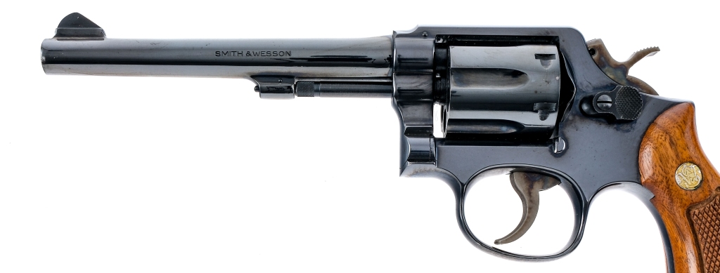 Description Smith & Wesson 10-7 chambered in .38 Special with a six-shot cylinder and a 6″ barrel. Manufactured in 1979 with serial number 4D48979. Blued barrel, frame, fluted cylinder, and checkered cylinder release. Case colored trigger and hammer. Checkered wood grips with S&W Monograms. Rear notch and front blade fixed iron sights. The front sight is painted red. Must ship to a FFL holder. Condition: Very Good with light scratches and cosmetic handling wear. Light cylinder turn line and operational wear. Light wear on the grips. Could use a little cleaning, the cylinder is a little stiff to close. Bright and clean bore with strong rifling. Barrel Length: 6″ Serial: 4D48979 Manufacturer: SMITH & WESSON Caliber: .38 Special Model: 10-7 Book# 07878