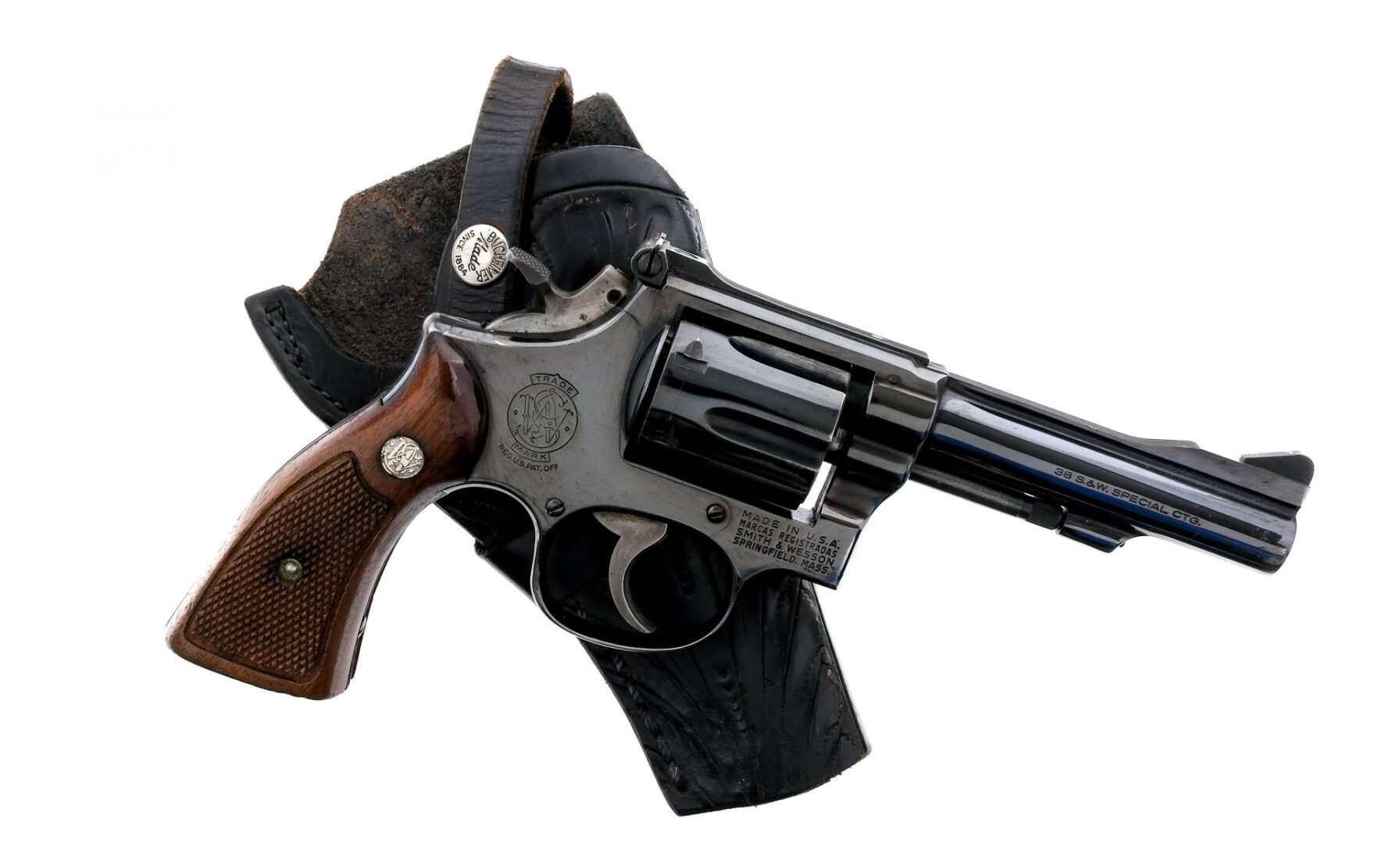 Description Smith & Wesson Model 15-3 K-38 Combat Masterpiece in .38 Smith & Wesson Special with a six round capacity and a 4″ barrel. Checkered wood grip plates. Blued frame, cylinder and barrel. Case colored serrated trigger and checkered hammer. Rear adjustable and front fixed blade sight. Comes with Bucheimer Made leather belt holster. Must ship to a FFL holder. Condition: Good with light scratches and muzzle wear. Clean rifled bore. Barrel Length: 4″ Serial: 15K1411 Manufacturer: Smith & Wesson Year: 1977 Caliber: .38 S&W Spl Model: 15-3 K-38 Combat Masterpiece Book# 05931