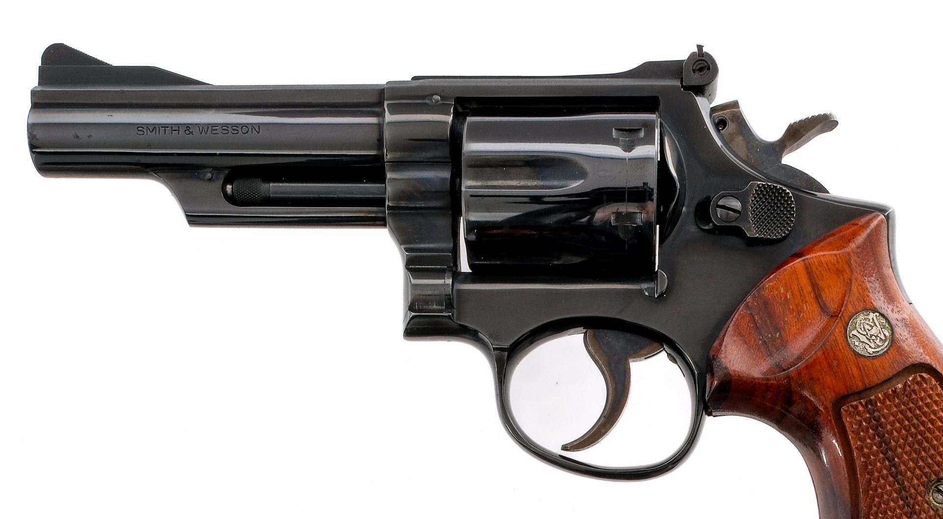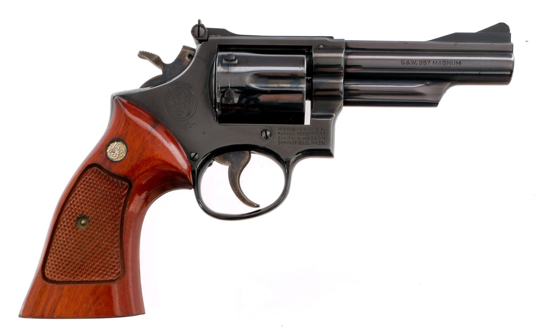 Description Smith & Wesson 19-3 chambered in .357 magnum with a six-shot cylinder and a 4″ pinned barrel. Manufactured in 1974 with serial number 4K92124. Blued barrel, frame, and fluted cylinder. Case colored serrated trigger and hammer. Checkered target stock with S&W medallions. Micrometer click adjustable rear U-notch and fixed ramped front blade sight. Must ship to a FFL or C&R holder. Condition: Good/Very Good with light handling and operational wear. Cylinder drag line. Varying small spots of metal oxidation on the barrel, frame, cylinder, and front sight. Light scratches and wear on the grips. Clean and bright bore with strong rifling. Barrel Length: 4″ Serial: 4K92124 Manufacturer: SMITH & WESSON Year: 1974 Caliber: .357 Magnum Model: 19-3 Combat Magnum Book# 03067
