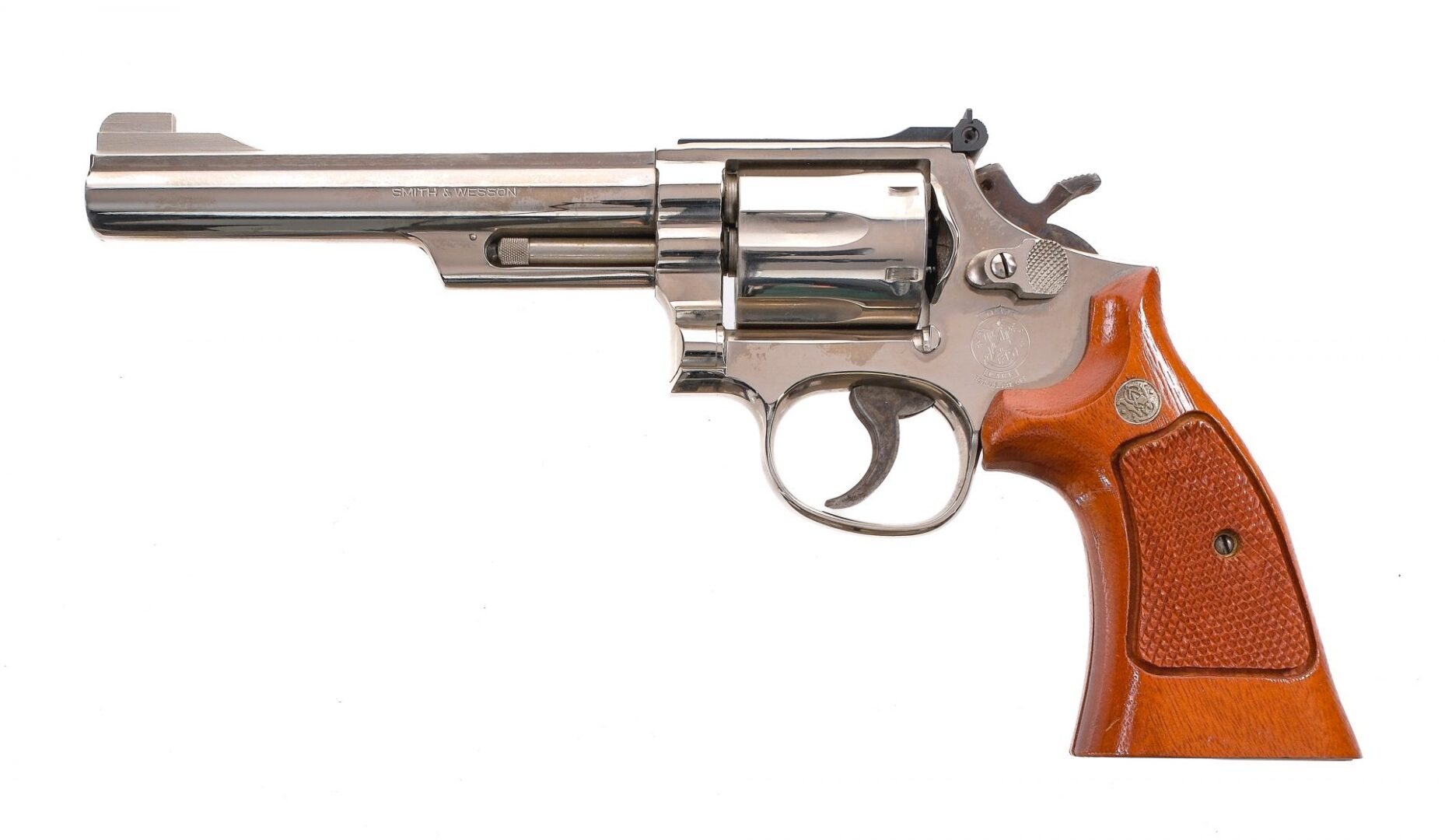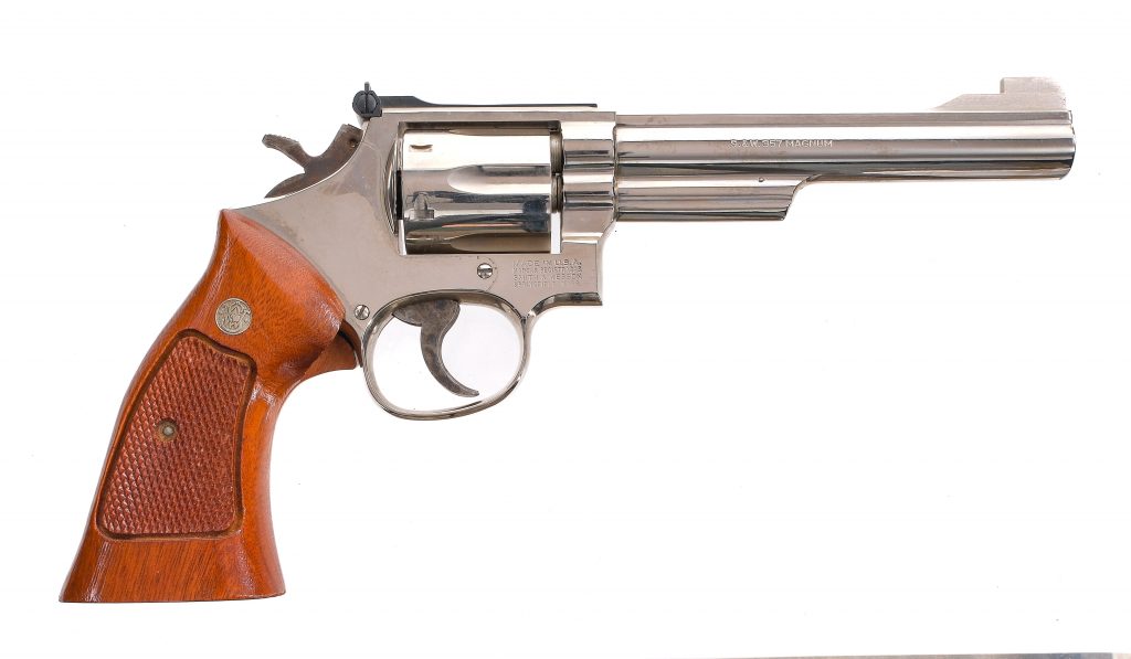 Description Smith & Wesson 19-5 chambered in .357 Magnum with a six-shot cylinder and a 6″ barrel. Nickel finished barrel, frame, fluted cylinder, and checkered cylinder release. Case colored double action trigger and hammer. Checkered wood target grips with S&W medallions. Adjustable rear U-notch sight and fixed partridge front sight. Comes in its factory box with matching serial number, factory paperwork, cleaning rod/brushes, and screwdriver. Must ship to a FFL holder. Condition: Good with scratches, scuffs, and general finish wear. Light cylinder turn line. Varying spots of metal oxidation. The right grip is missing a chunk under the trigger guard. The action is stiff from dirt and dried oil. Bright and clean bore with strong rifling. Barrel Length: 6″ Serial: AFD2176 Manufacturer: SMITH & WESSON Caliber: .357 Magnum Model: 19-5 Book# 03873