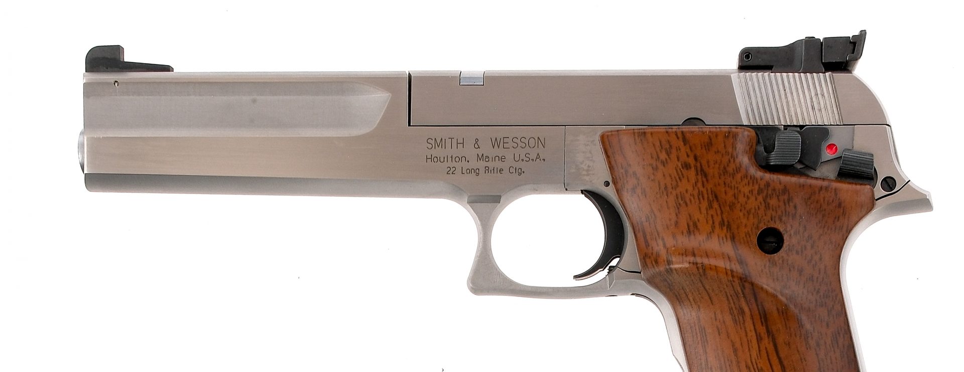 Description Smith & Wesson Model 2206TGT in .22 Long Rifle with three, ten round removable magazines and a 6″ barrel. Herret wood grip plates with thumb contour. Stainless steel frame and serrated slide. Serrated blued adjustable trigger. Front strap located serrated magazine release. Rear left side of frame slide release and safety switch. Rear adjustable Millet 100 sight system and front fixed blade. Comes in its factory box with matching serial number and three magazines. Must ship to a FFL holder. Condition: Very Good/Excellent with light handling wear. Clean rifled bore. Barrel Length: 6″ Serial: 2206TGT Manufacturer: Smith & Wesson Caliber: .22 LR Model: 2206TGT Year-Range 1994-1996 Book# 04611