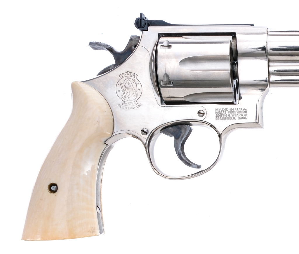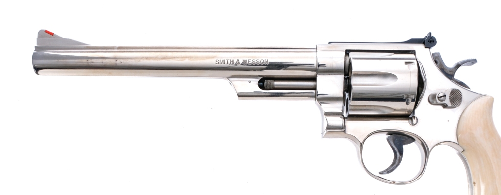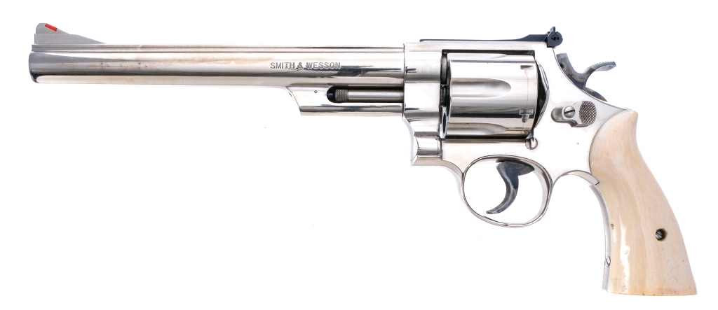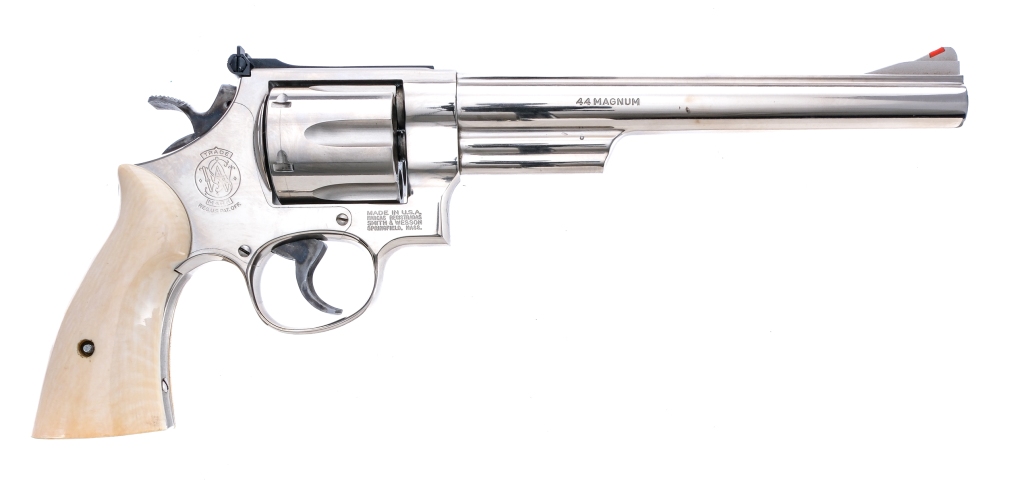 Description Smith & Wesson 29-3 chambered in .44 Remington Magnum with a six-shot cylinder and a 8 3/8″ barrel. Manufactured between 1983 and 1987 with serial number AVD2440. Nickel finished barrel, frame, fluted cylinder, and checkered cylinder release. Case colored target trigger and target hammer. Smooth bone grips. Adjustable rear U-notch and red ramp front blade iron sights. Must ship to a FFL holder. Condition: Very Good with light scratches and handling wear. Light cylinder turn line and normal operational wear. Some smudges and dried oil on the finish. A few small spots of metal oxidation. Bright and clean bore with strong visible rifling. Barrel Length: 8 3/8″ Serial: AVD2440 Manufacturer: SMITH & WESSON Caliber: .44 Remington Magnum Model: 29-3 Book# 05719