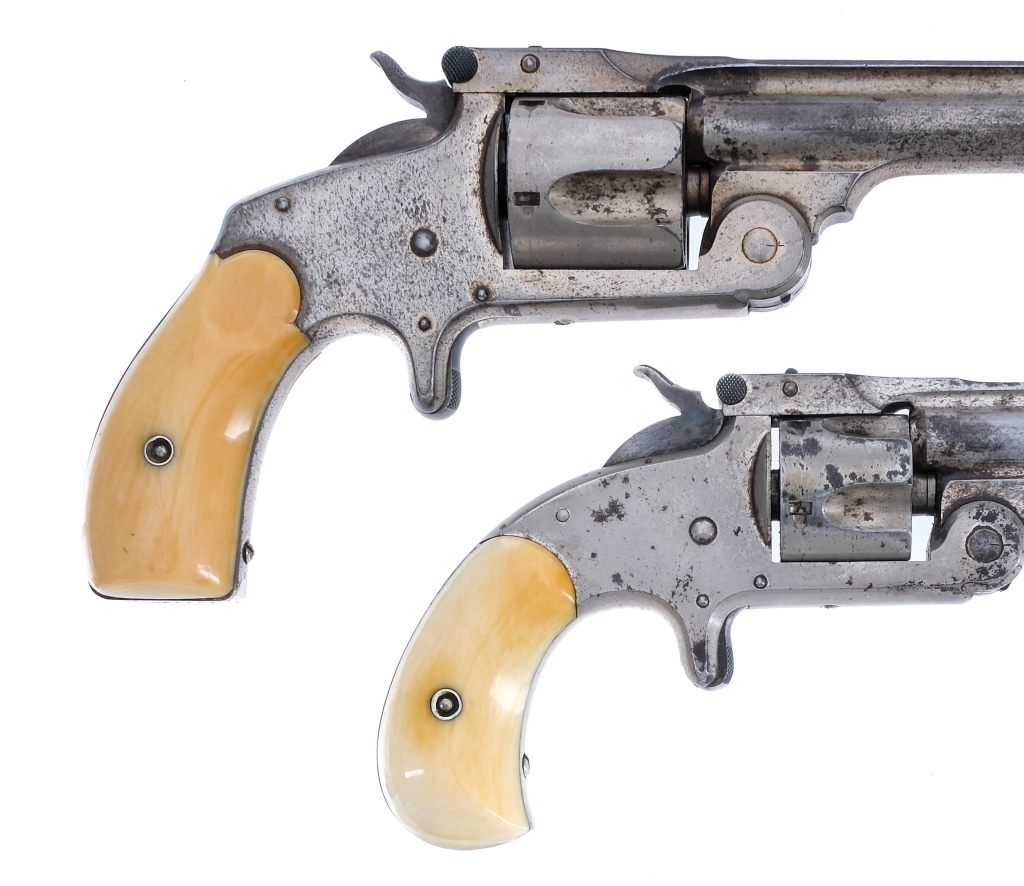Description This lot is for two Smith & Wesson Top Break revolvers. S&W Single Action #2 1st Model in .38 S&W with a five round capacity and a 4″ barrel. Natural grip plates. Finish worn frame, cylinder and barrel. Case colored knurled trigger and hammer. Rear notch and front fixed blade sight. S&W Single Action Model 1 1/2 in .32 S&W with a five round capacity and a 3.5″ barrel. Natural grip plates. Finish worn frame, cylinder and barrel. Case colored knurled trigger and hammer. Rear notch and front fixed blade sight. Antique, No FFL required and ships to MOST buyers home. Condition: Antique, Good with scratches, finish wear/loss, rust and handling wear. Both rifled bores have spots of rust and pitting. Barrel Length: 3.5″ 4″ Serial: 76608 27757 Manufacturer: Smith & Wesson Caliber: .32 .38 S&W Model: SA 1 1/2 SA #2 1st Model Year-Range 1876-1892