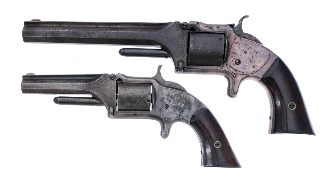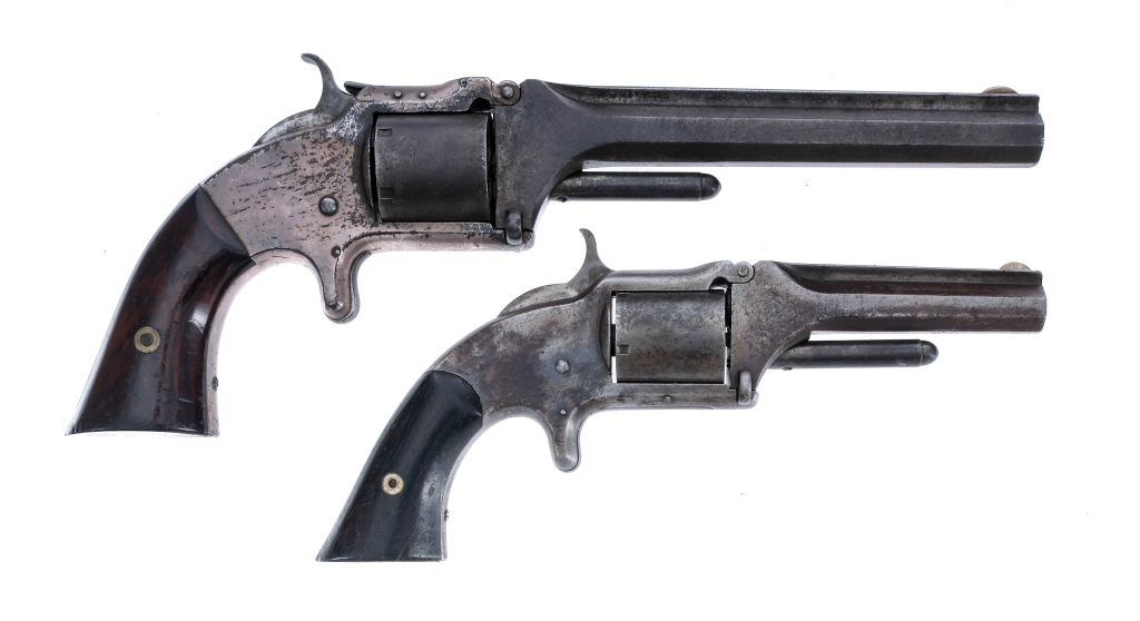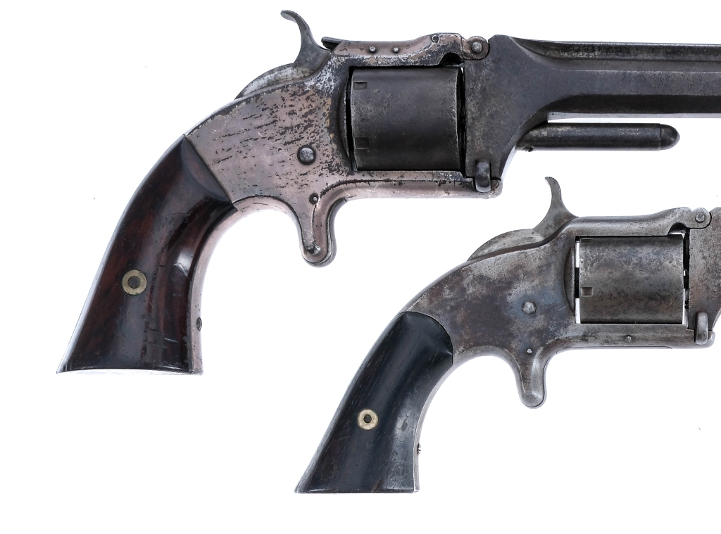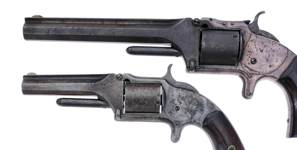 Description UPDATE: These two revolvers are in .32 S&W Rimfire Long. This lot is for two Smith & Wesson revolvers in .38 Rimfire Long. S&W Model 1 1/2 Old Model in .32 Rimfire Long with a five round capacity and a 3.5″ barrel. Smooth wood grip plates with matching stamped serial number on reverse right side. Finish worn frame, cylinder and barrel. Front fixed blade sight. S&W Model 2 in .32 Rimfire Long with a five round capacity and a 6″ barrel. Smooth wood grip plates with matching serial number stamped on the reverse side of plate. Finish worn frame, cylinder and barrel. Rear notch and front fixed blade sight. Antique, No FFL required and ships to MOST buyers home. Condition: Antique, Good/Very Good with scratches, finish wear/loss, rust and handling wear. Both have rusty rifled bores. Barrel Length: 6″ 3.5″ Serial: 8144 21437 Manufacturer: Smith & Wesson Caliber: .32 RF Long Model: 2 1 1/2 Old Model Year-Range 1861-1874 1865-1868