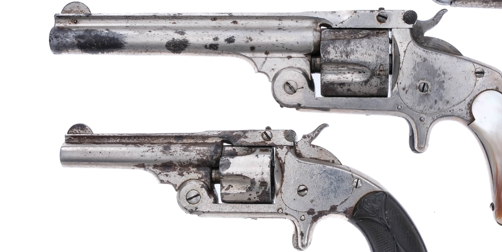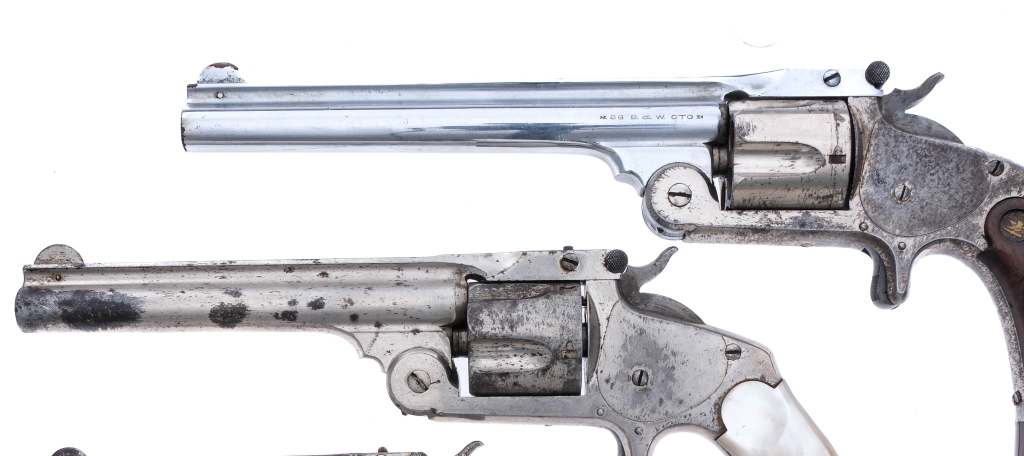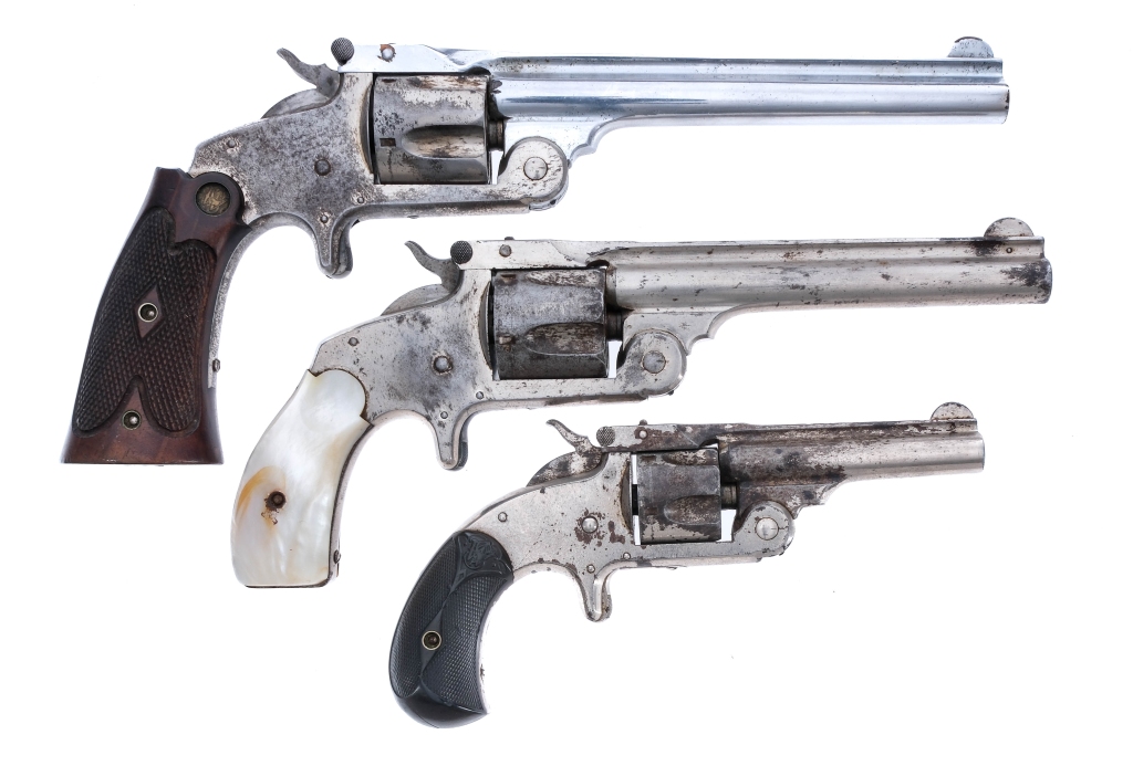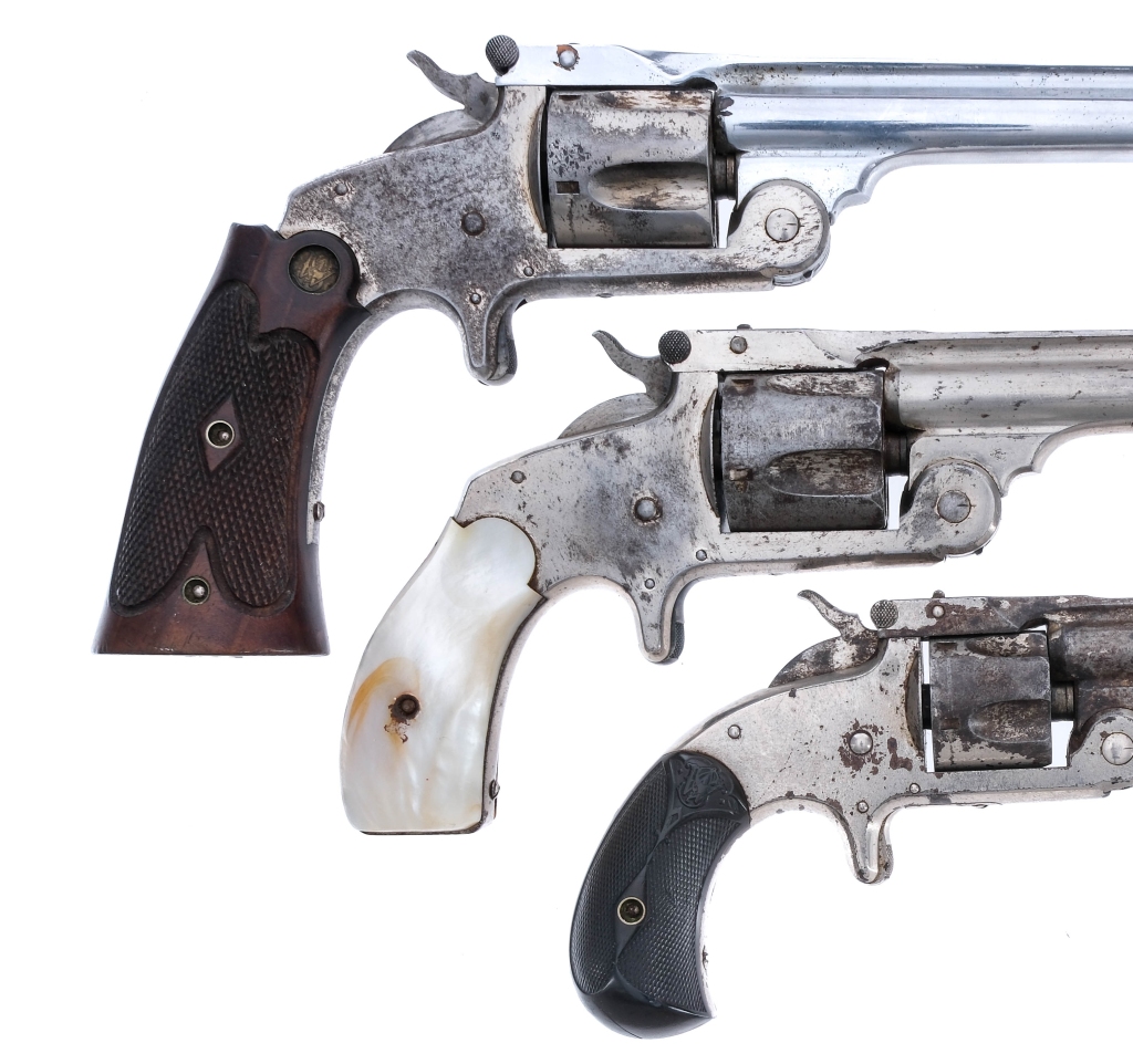 Description Smith & Wesson three piece revolver lot. Includes two Model Number Two Second Issue in .38 S&W with a five round capacity and 5″, 6″ barrel lengths. Both with worn nickel finishes. One with checkered S&W wood grip plates and the other with Mother Of Pearl grip plates. Both with rear notch and front fixed blade sights. Smith & Wesson Model One and a Half Single Action in .32 S&W with a five round capacity and a 3″ barrel. Checkered composite grip plates. Nickel finished frame, cylinder and barrel. Rear notch and front fixed blade sight. Antique, No FFL required and ships to MOST buyers home. Condition: Antique, Fair with scratches, finish wear/loss, rust, refinished barrel on the wood grip Model 2 and that Model 2 does not function. All three have spots of rust and pitting to the rifled bores. SOLD AS-IS. Barrel Length: 3″ 5″ 6″ Serial: 91562 50926 42978 Manufacturer: Smith & Wesson Caliber: .32 .38 S&W Model: 2 1 1/2 Year-Range 1877-1892